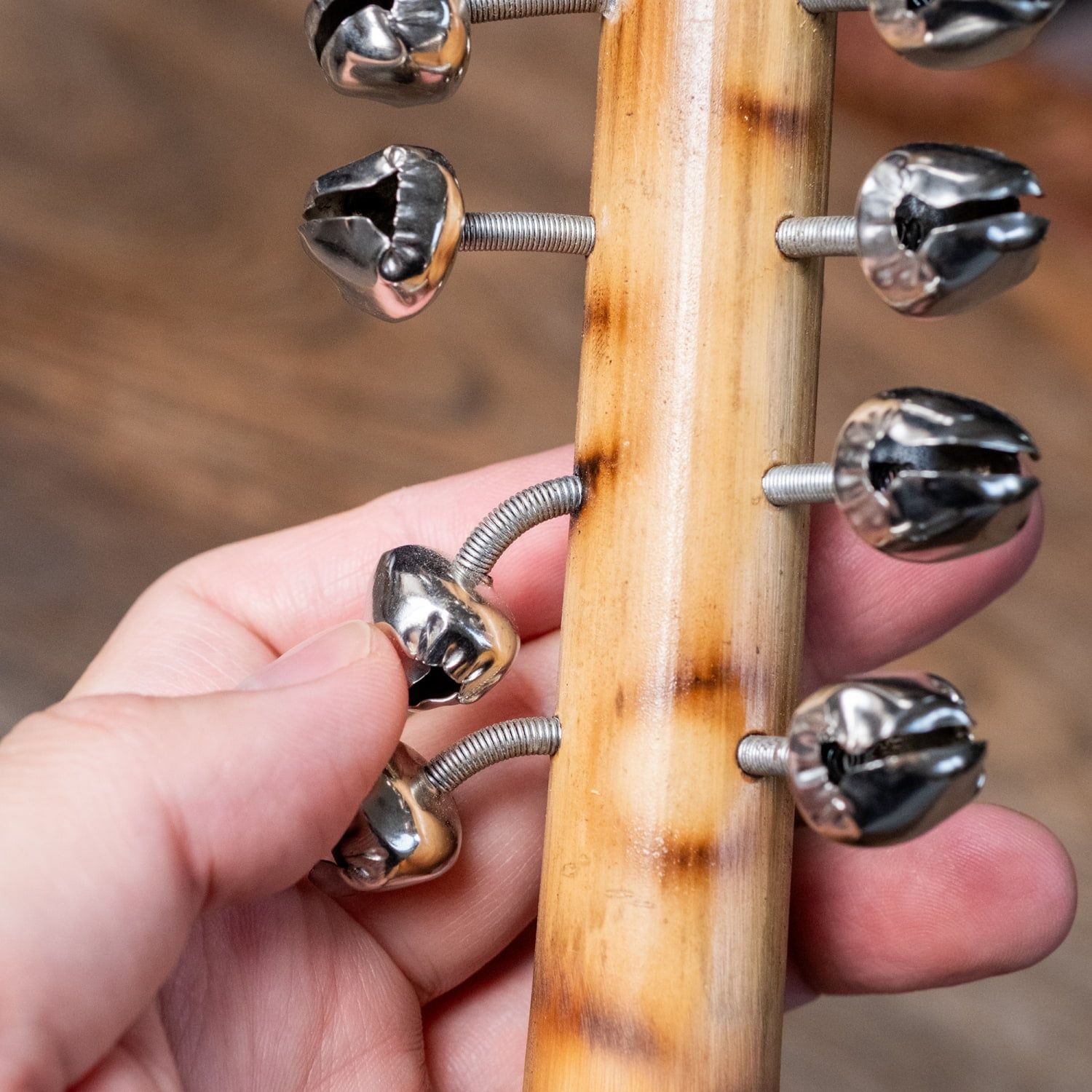 こちらは、棒に鈴が複数個付いたスレイベルという楽器です。クリスマスに空から降りてくる、トナカイの引くそりからシャンシャカ鳴っている、あのベルの音色を想像するとイメージしやすいと思います。