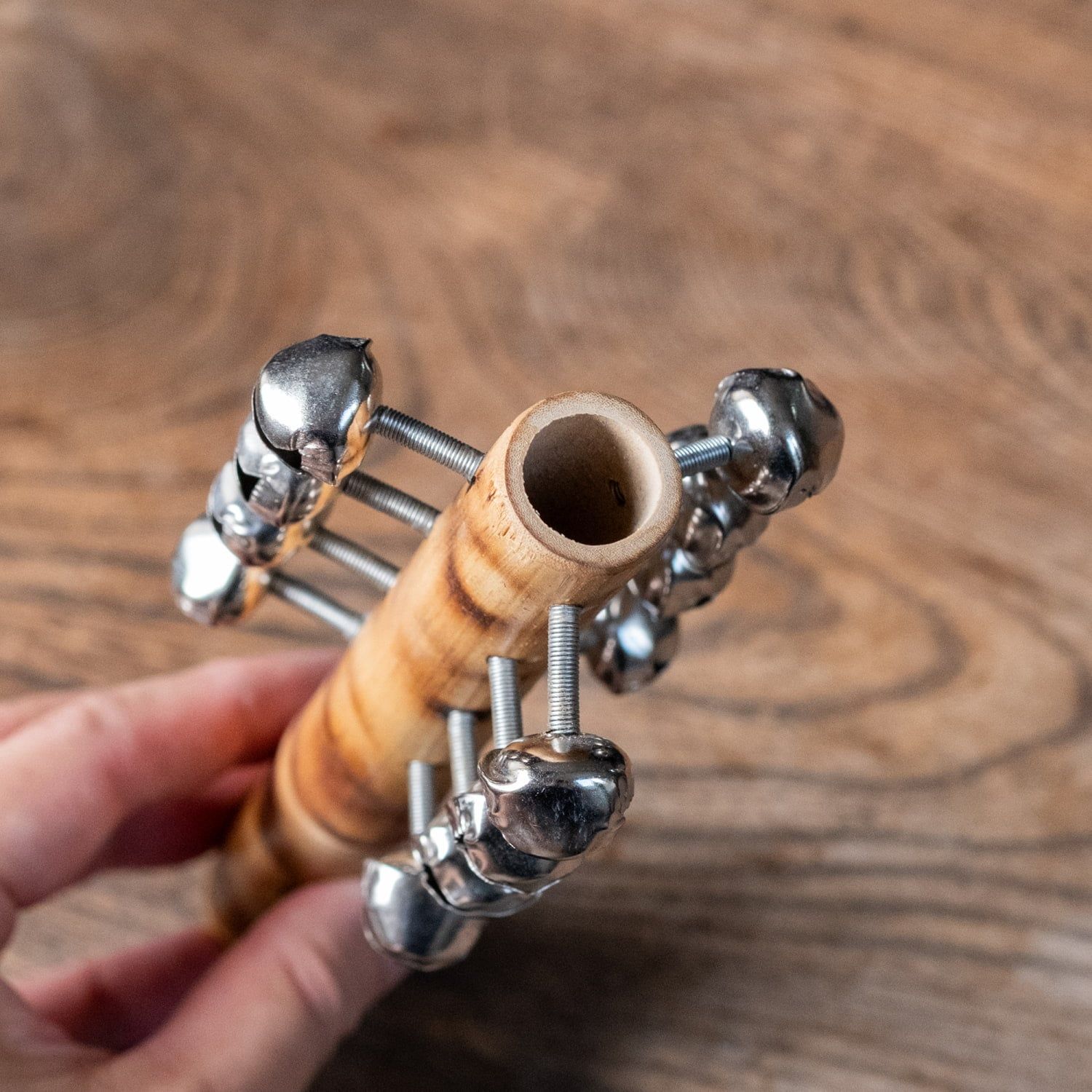 演奏は、ベルが付いている方を下向きに持って、片方の手で楽器を握り、もう片方で握った手を叩き鳴らす方法。ベルが付いている方を、上にした状態で素早く回転させて鳴らす方法。普通に振って鳴らす方法などがございます。