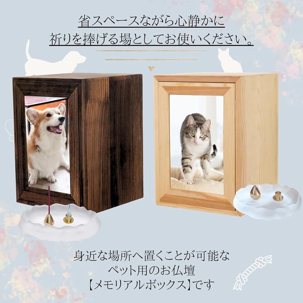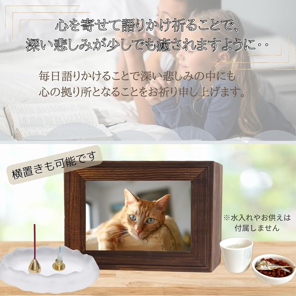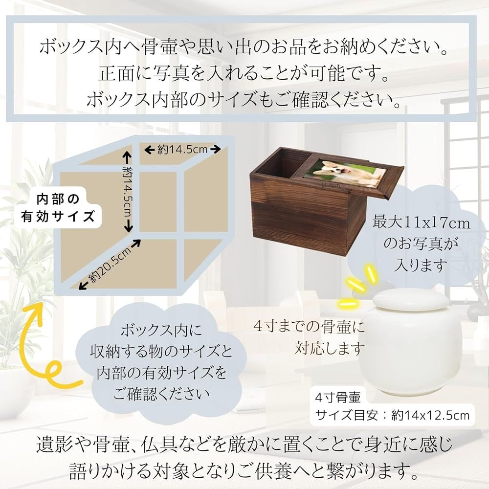 遺品や骨壷などをボックス内に厳かに安置し、遺影を飾っていただくことで、身近に感じ語りかける対象となりご供養へと繋がります。約14.5x14.5x20.5cm 約11x17cm
