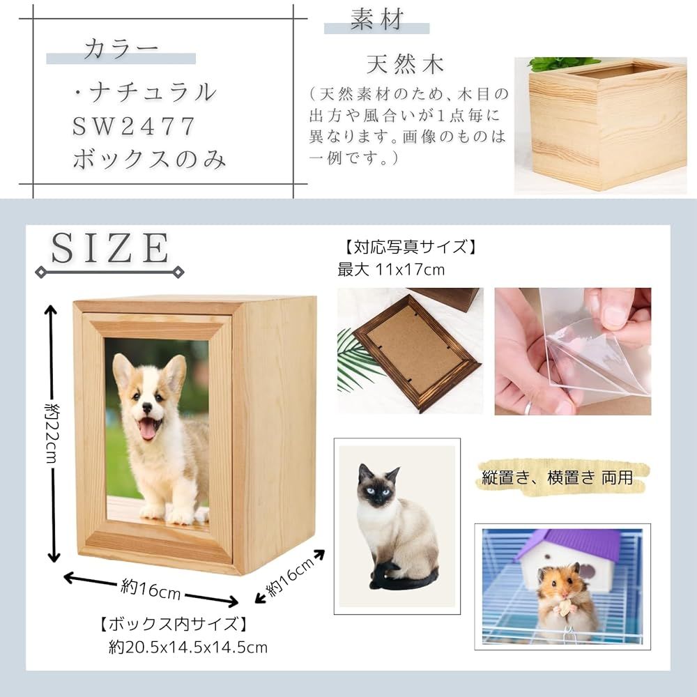天然木製のシンプルなフォルム。自然な風合いのナチュラルブラウン。【セット内容】メモリアルボックス 1個【サイズ】メモリアルボックス:幅 約16cm、高さ 約22cm、奥行 約16cm【素材】ボックス:天然木