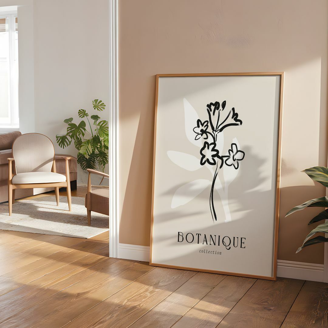 モノトーンで描かれた植物のラインアートが、シンプルでスタイリッシュな印象を与えるアートポスター。どんなインテリアにもなじみやすく、玄関やカフェ風スペースにも最適です。おしゃれ感を手軽にプラスしたい方、植物モチーフが好きな方へのプレゼントにもおすすめ。空間に落ち着きとナチュラルなアクセントをプラスします。