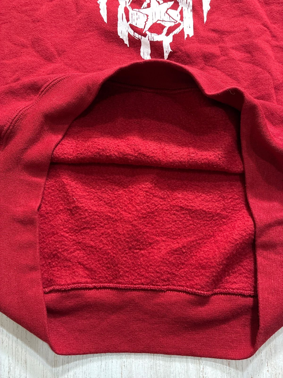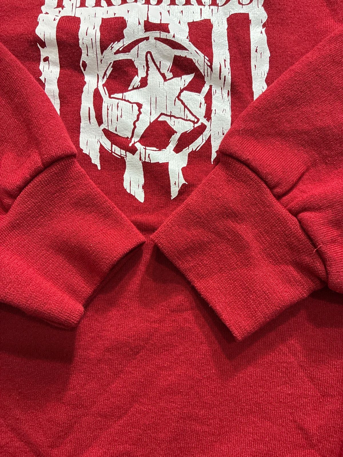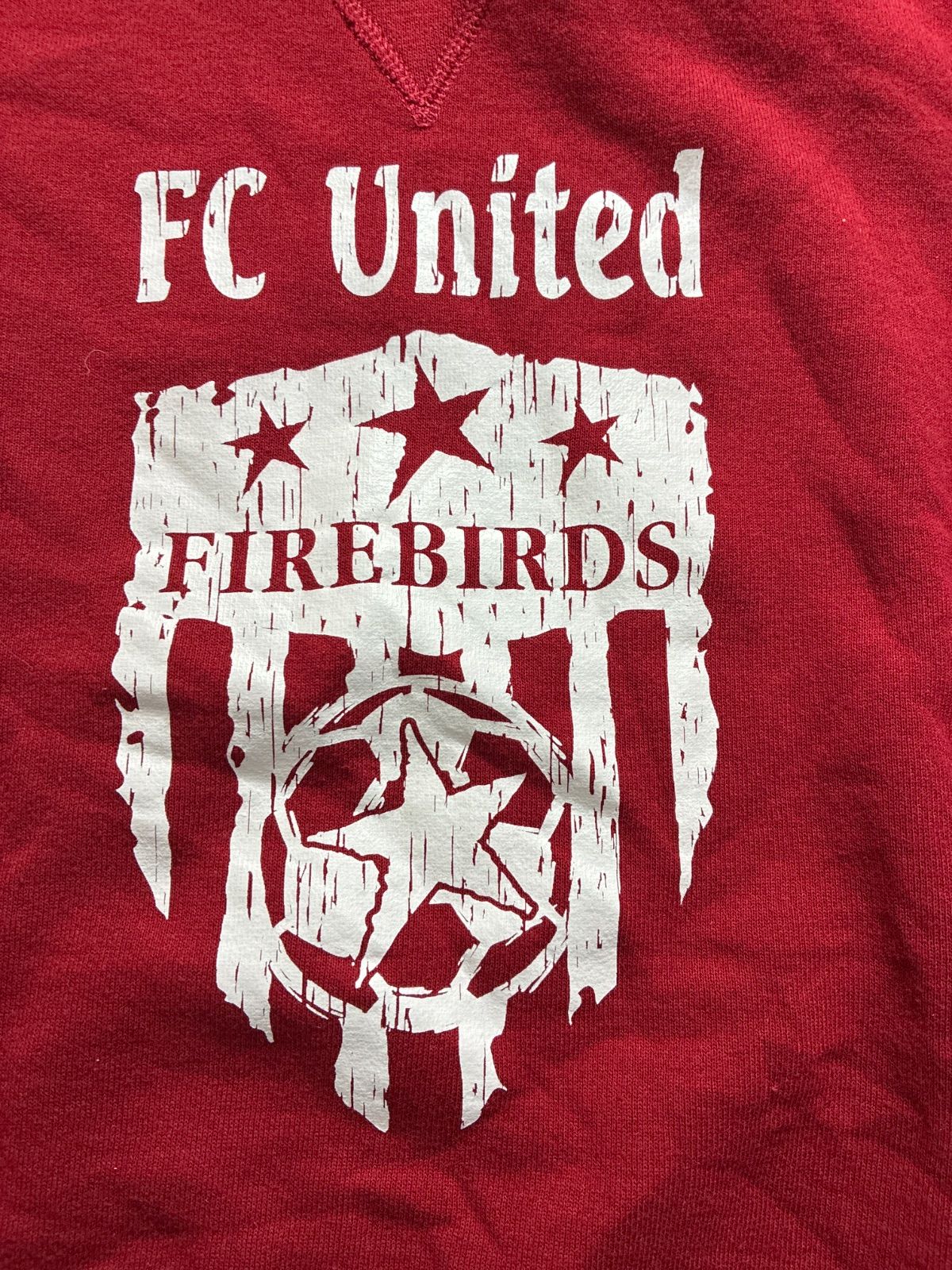アメカジの定番である鮮やかなレッドのボディに、フロントには「FC United FIREBIRDS」のチームロゴがプリントされています。あえてかすれたような「クラックプリント」が採用されており、手に入れたその日から古着ならではのこなれた雰囲気を楽しめます。