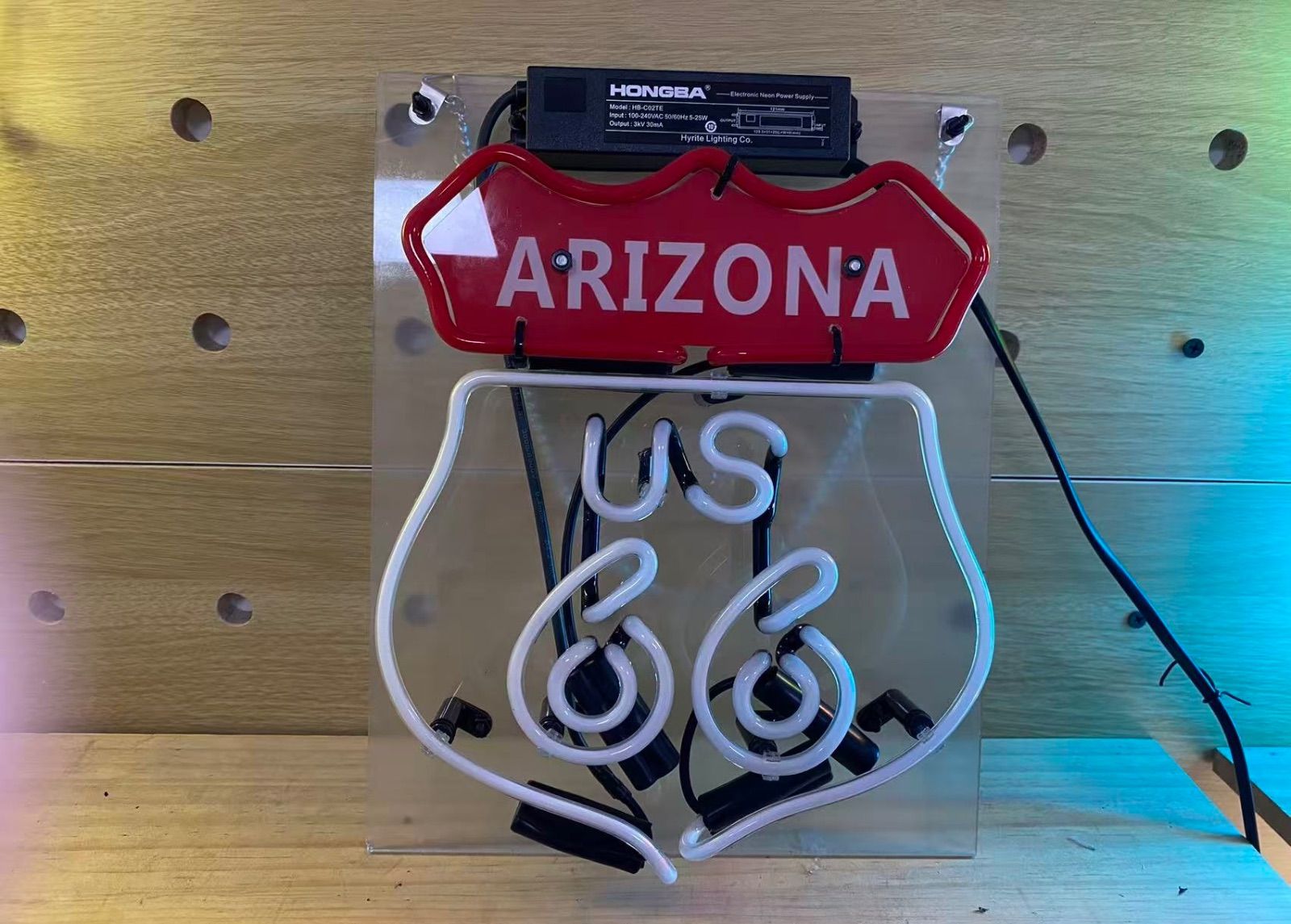 ・デザイン:アメリカ西部を象徴する「ARIZONA」と「US 66」のロゴをモチーフにしたヴィンテージ風ネオンサイン。赤・白・青のコントラストが美しく、アメリカン雑貨やガレージ装飾に最適です。