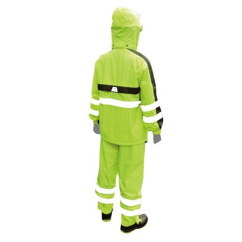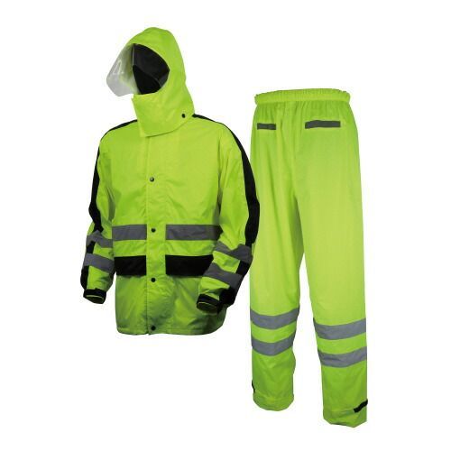 ●材質/表地:ナイロン100%・透湿PUコーティング、裏地:ポリエステル100%メッシュ●透湿性●防水加工●撥水性●裏メッシュ●反射テープ●手首・足首ファスナーテープ●ベンチレーション●視認性に優れたレインスーツ。昼でも夜でも着用者の存在が明らかです。