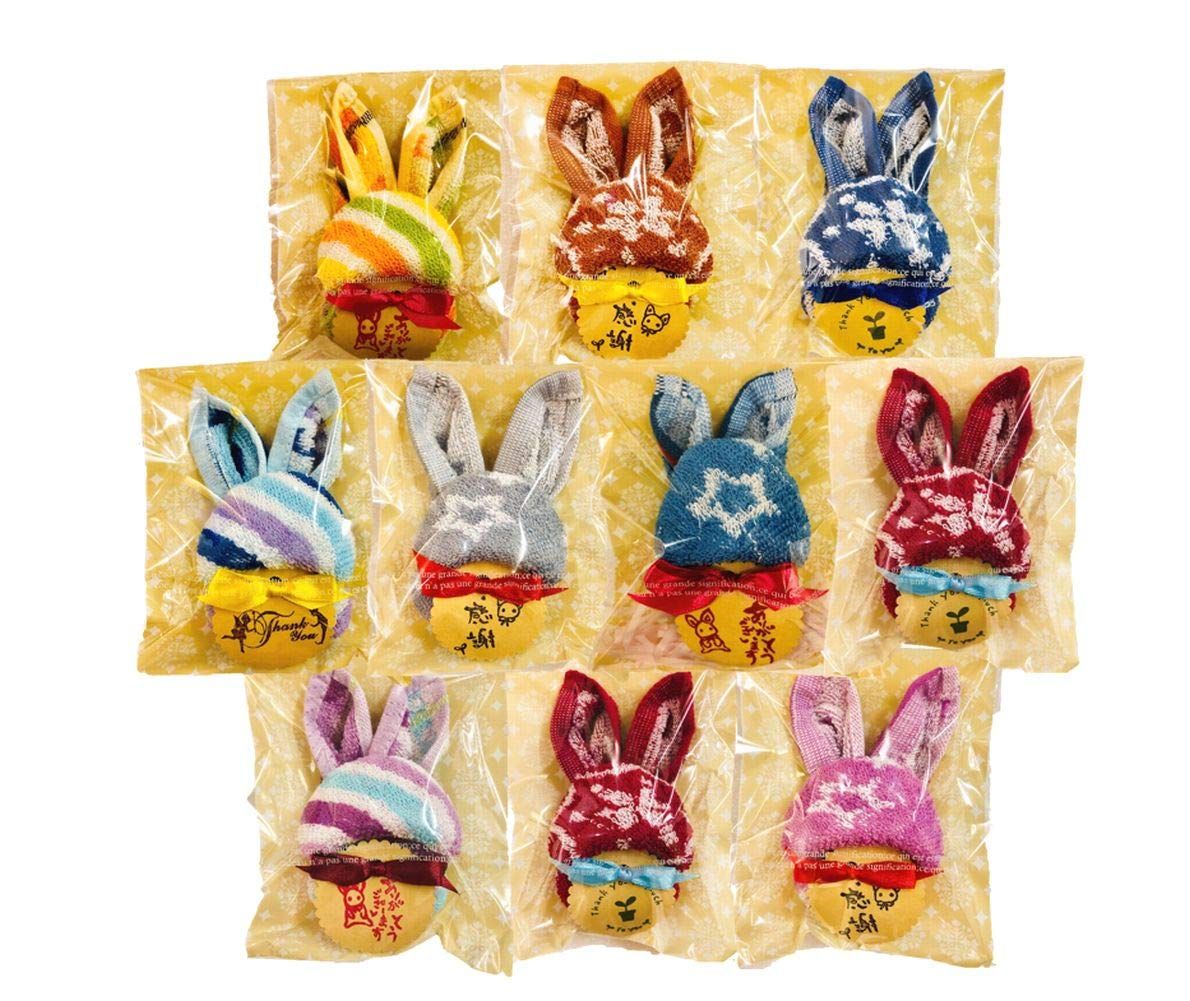 タオルハンカチで作ったかわいいタオルうさぎのセットです。一つずつ小袋に入っています。
