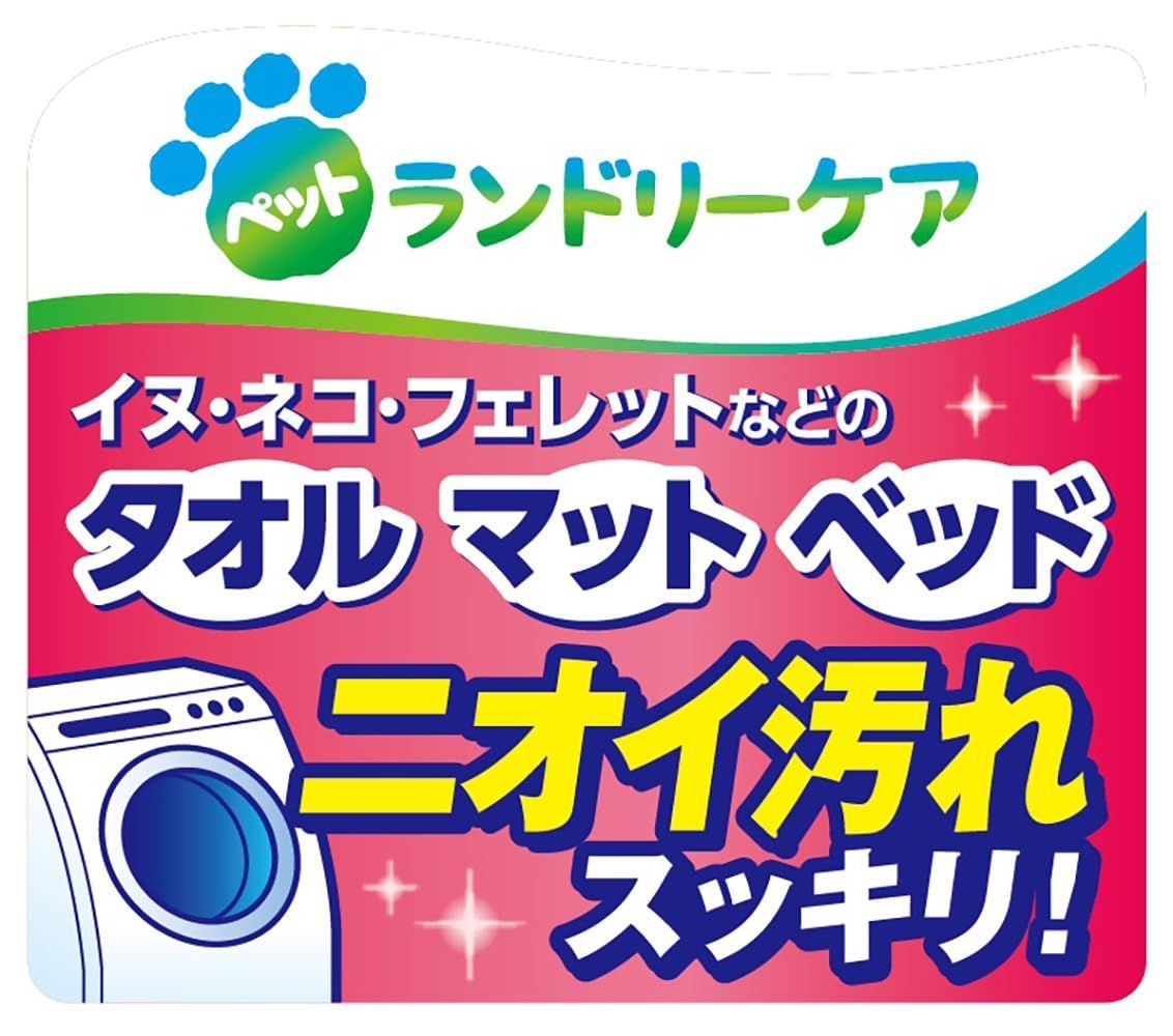 タオル、マット、ベッドなどのニオイや毛をスッキリ落とす液体コンパクト洗剤です。漂白剤でも落ちにくいペットのニオイ汚れを落とす専用洗浄成分を配合しています。植物生まれの除菌成分配合。洗たく物をペットがなめても安心。すすぎ1回でOK。ドラム式洗濯機にもおすすめです。グリーンフローラルのマイルドな香り。