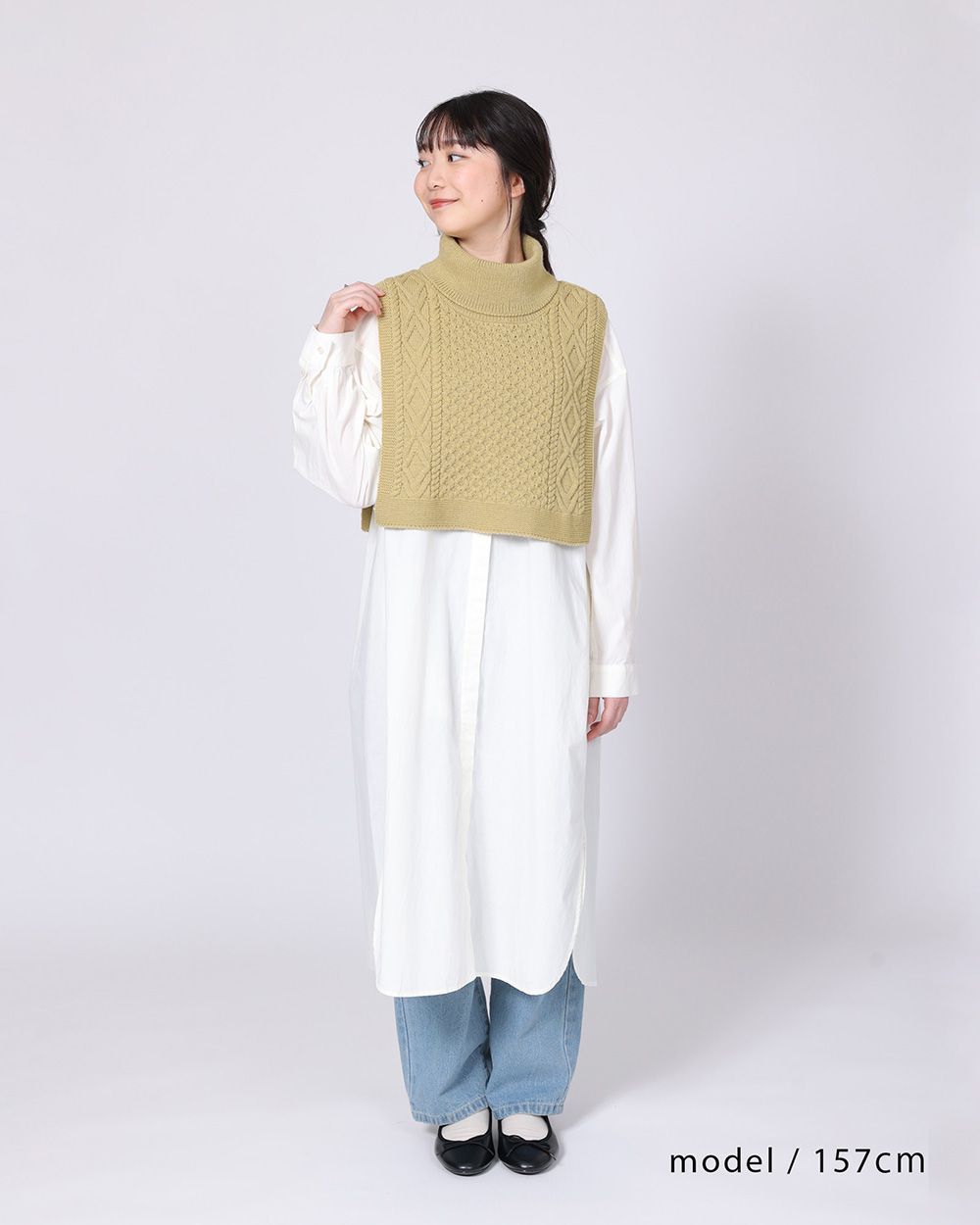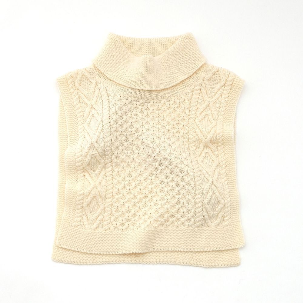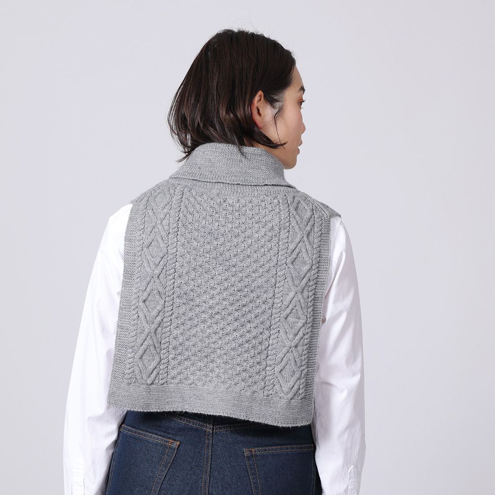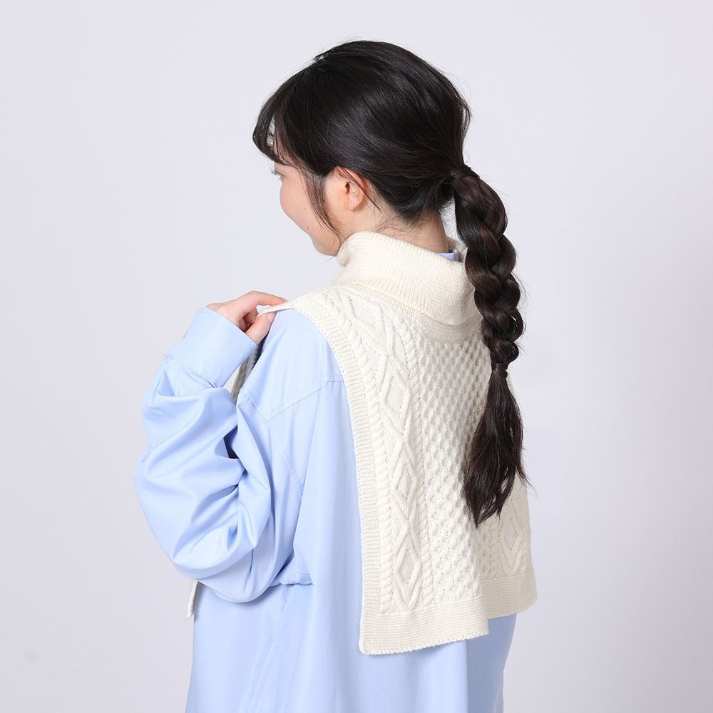 前年好評だったタートルネックケープ。24AWでは身頃にアラン編みをとりいれました。シャツやワンピースなどシンプルな装いに合わせれば、スタイリングにメリハリがでてポイントになります。レイヤードスタイルを気軽にお楽しめるアイテムです。初めての方はベストを着る感覚で、ぜひトライしてみてください。