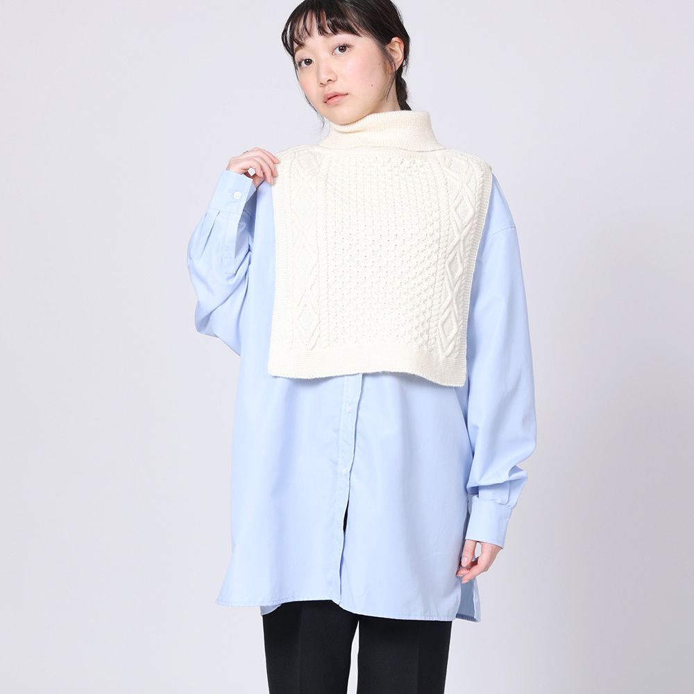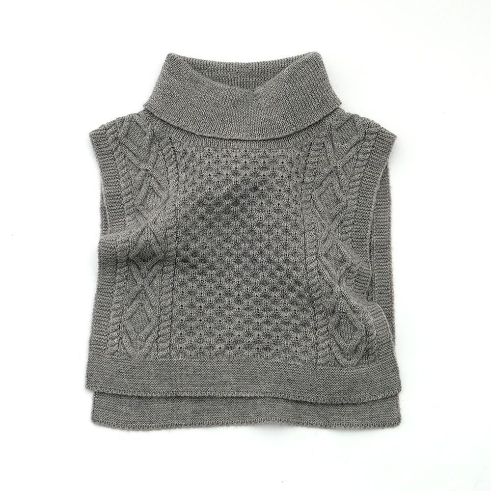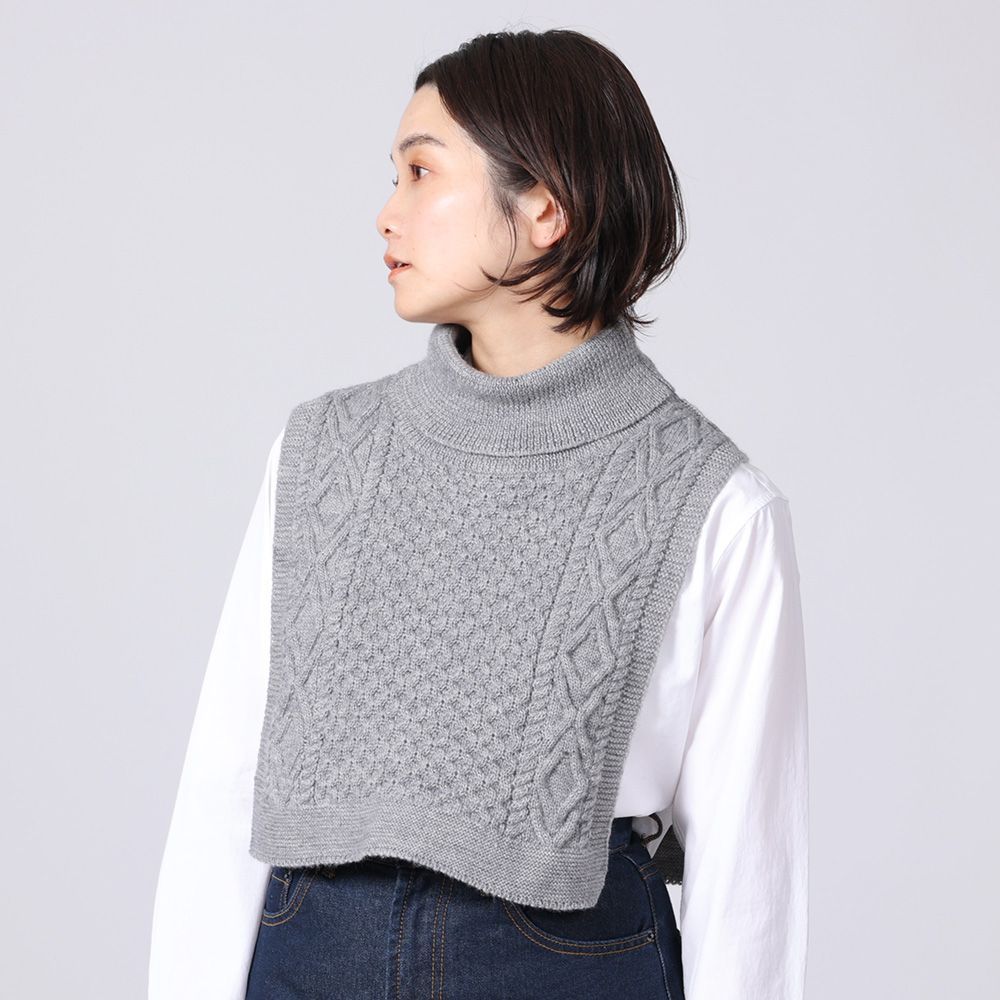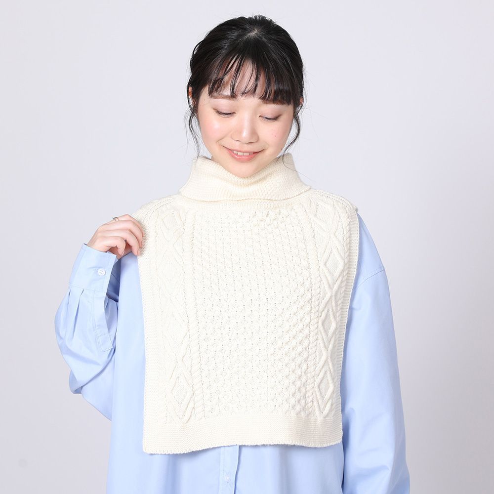 前年好評だったタートルネックケープ。24AWでは身頃にアラン編みをとりいれました。シャツやワンピースなどシンプルな装いに合わせれば、スタイリングにメリハリがでてポイントになります。レイヤードスタイルを気軽にお楽しめるアイテムです。初めての方はベストを着る感覚で、ぜひトライしてみてください。