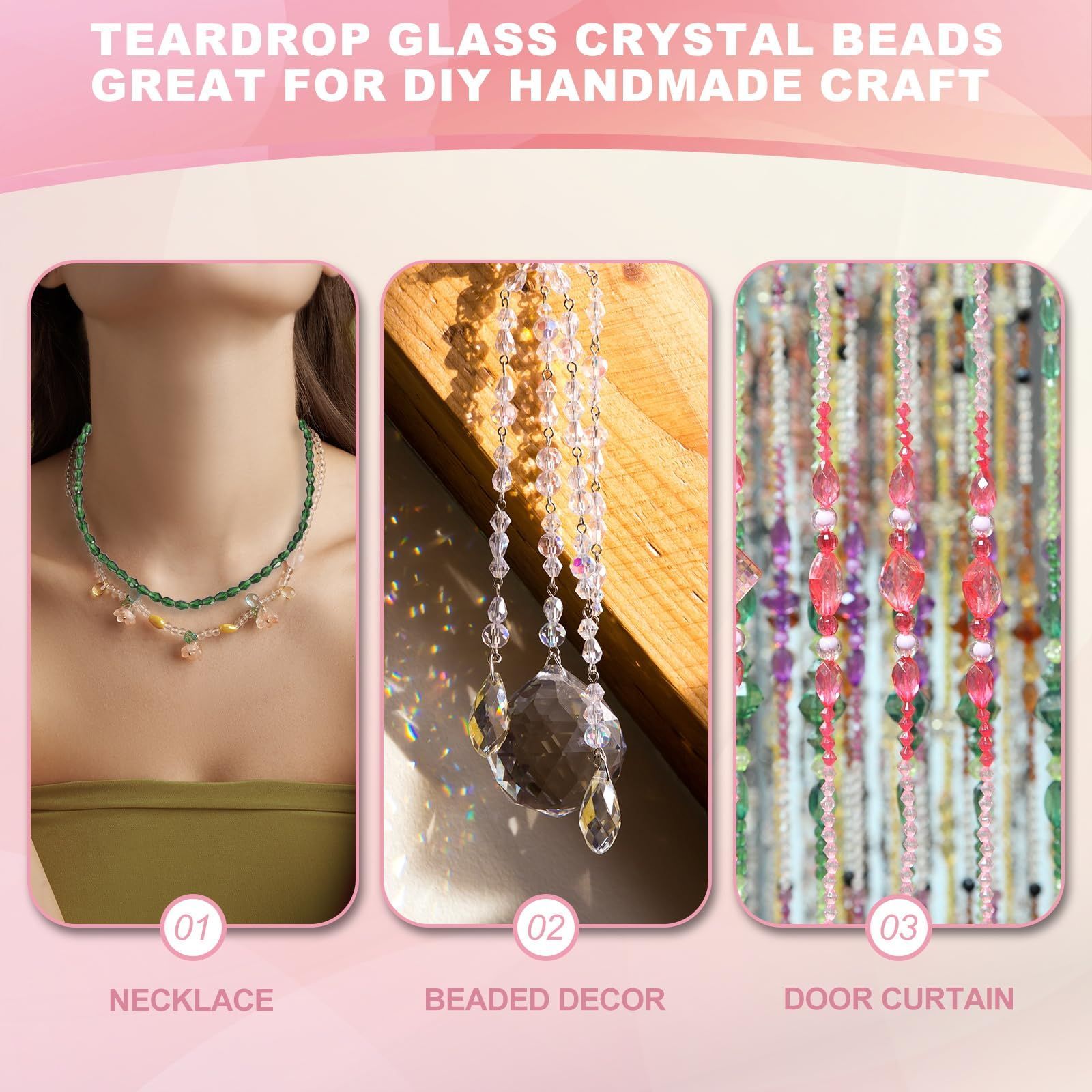 応用:垂直の穴が開いたこれらのティアドロップガラスビーズは、手作りの宝石、ビーズネックレス、DIYブレスレット、イヤリング、ペンダント、衣服の装飾、装飾、ヘアアクセサリーに最適です。また、DIYキャンドルホルダーペンダント、ビーズカーテン、結婚式の装飾にも最適です。