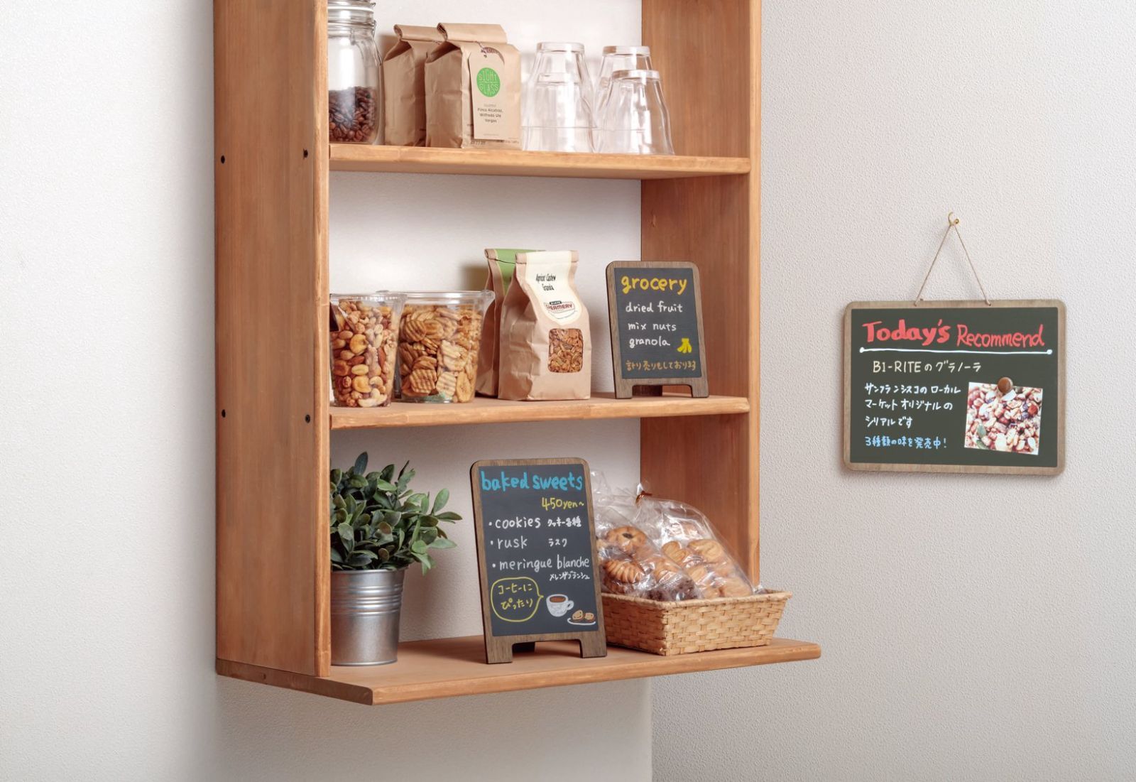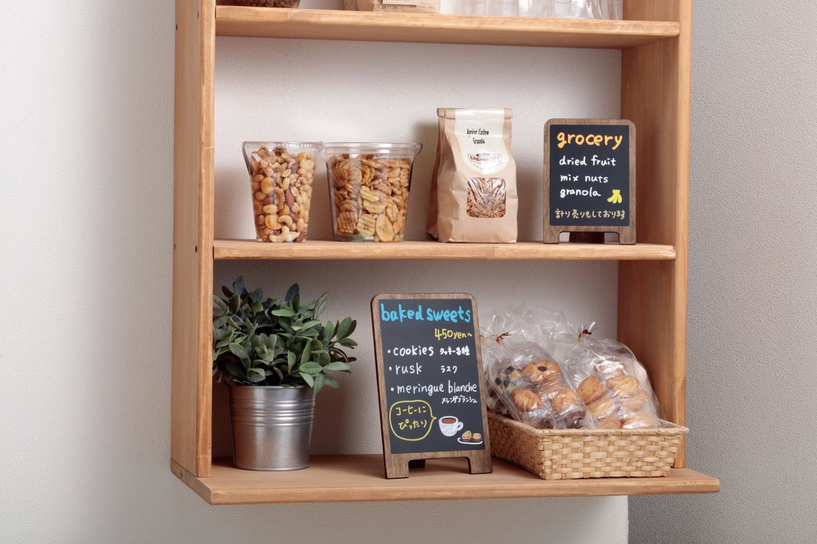 アンティーク仕上げの小さいブラックボードでお店を演出。