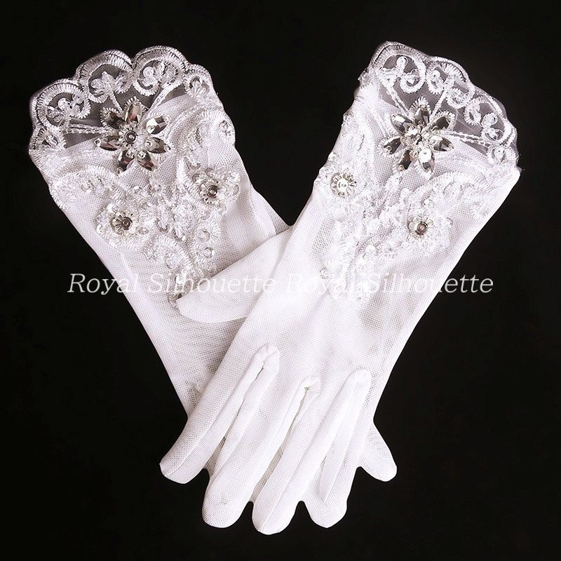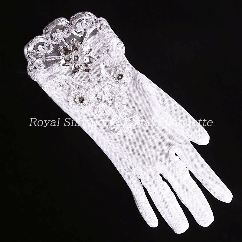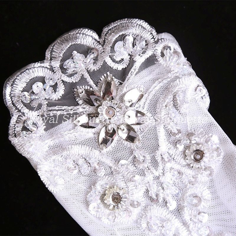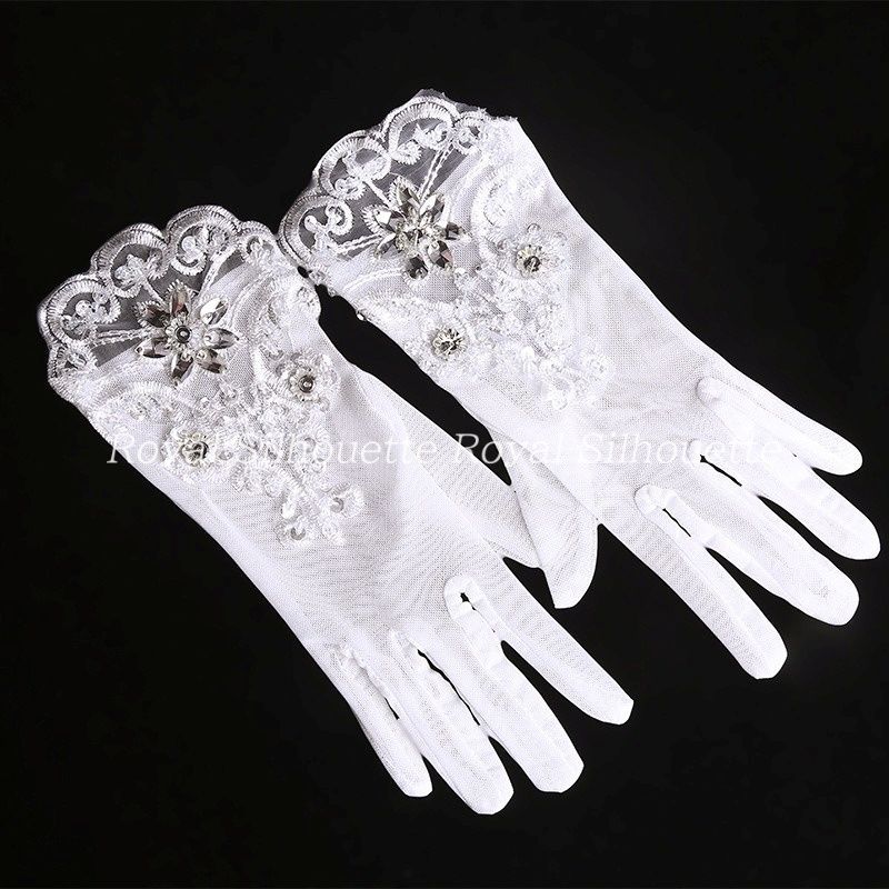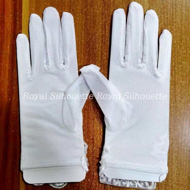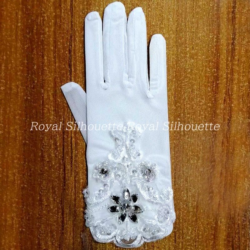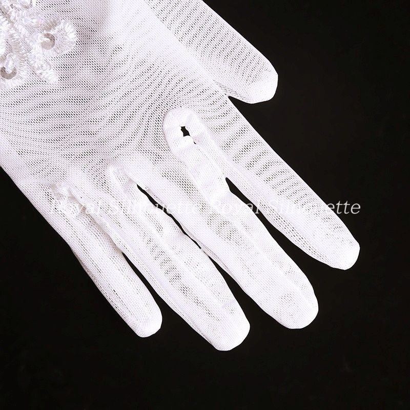 ロイヤルシルエットがご紹介するホワイトのショートグローブは、花嫁の手元を華やかに演出する上品なアイテムです。軽やかで透け感のある素材を使用しており、指先から手首までを美しく包み込みながらも、柔らかく自然な印象を与えます。挙式や披露宴はもちろん、前撮りやウェディングフォトでも写真映えするデザインです。