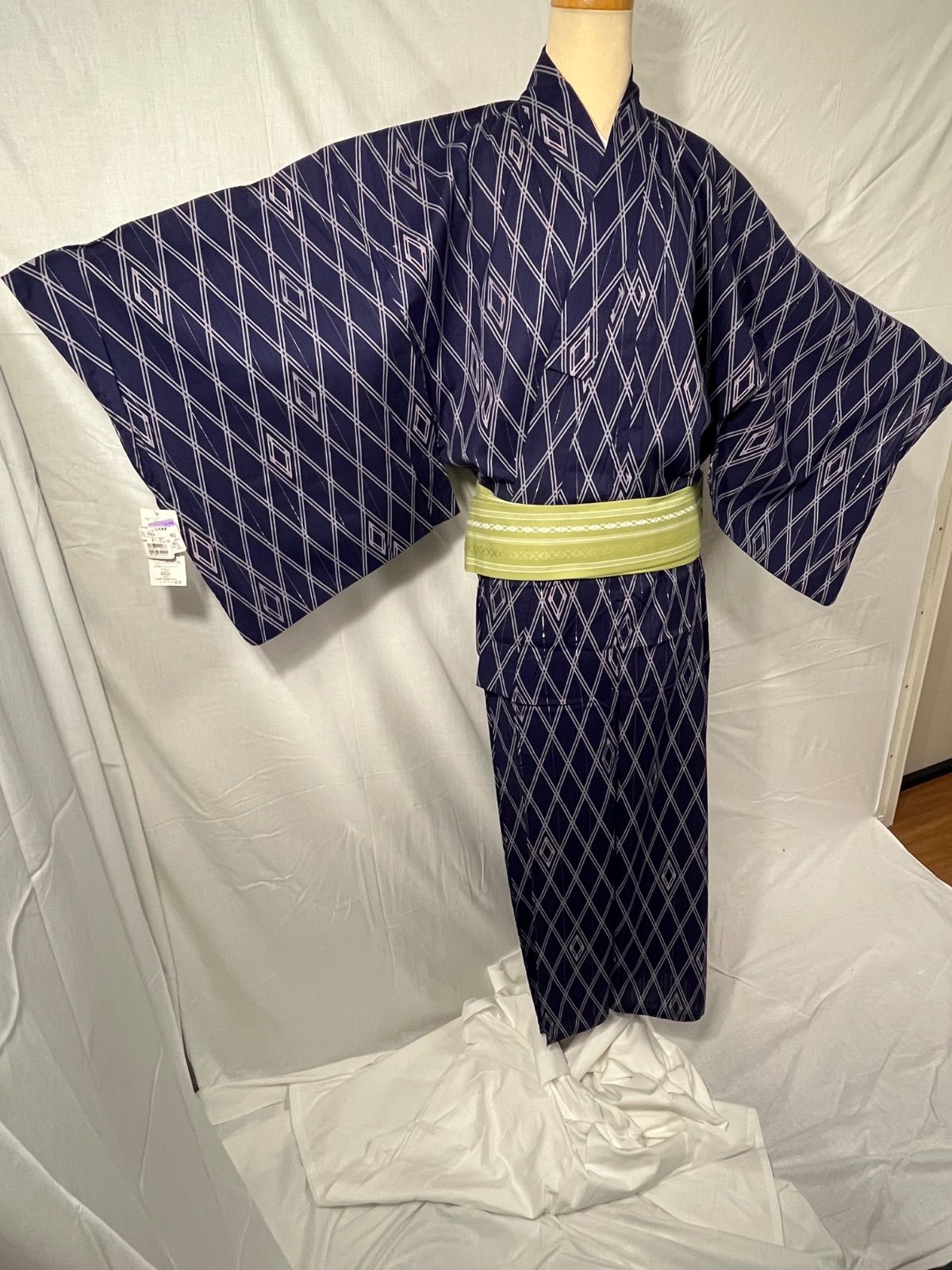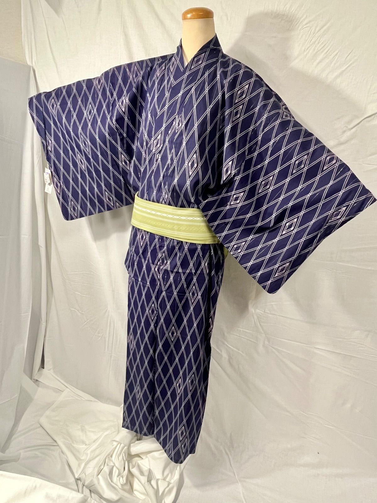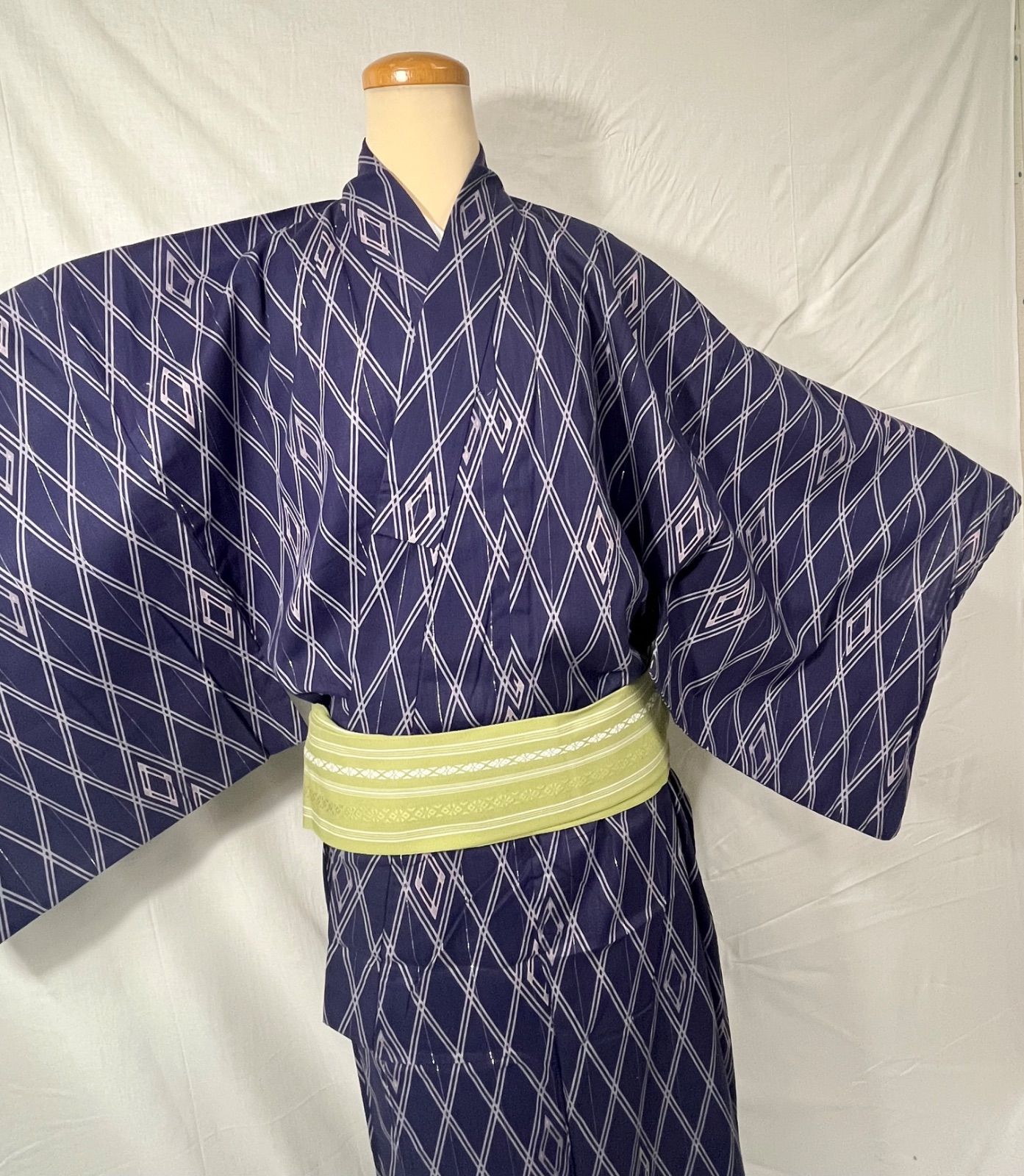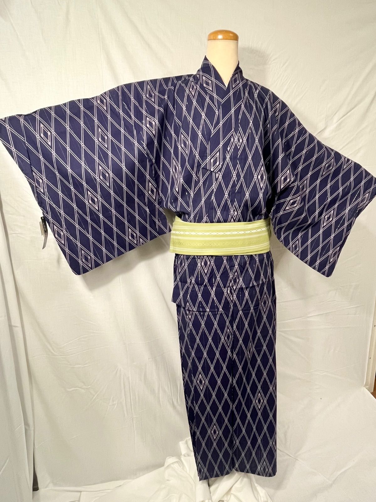 紺色で菱模様とシルバーのラメ糸がアクセントの浴衣です。