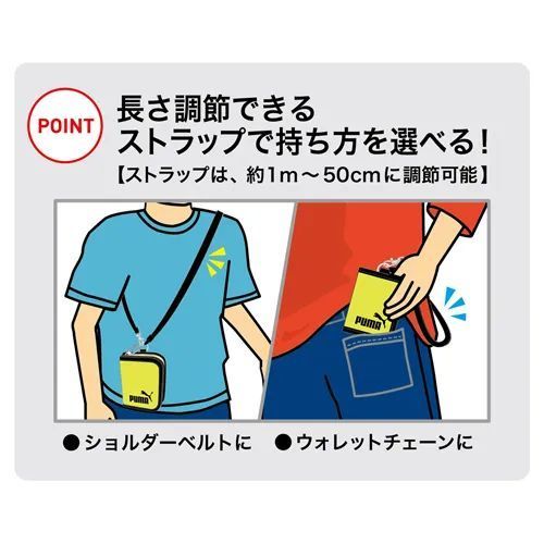 ・長さを調節できるストラップ付で持ち方が選べる、約1m〜50cmに調節可能