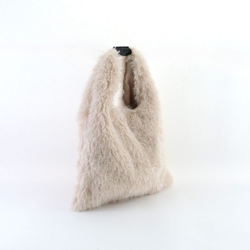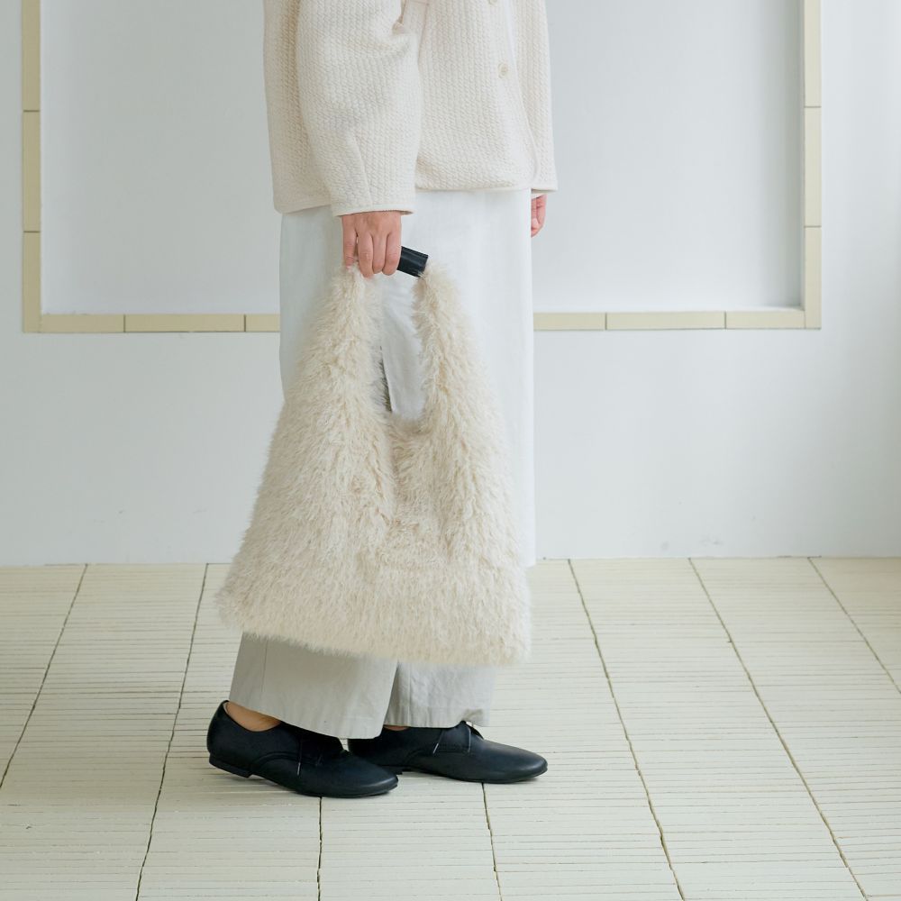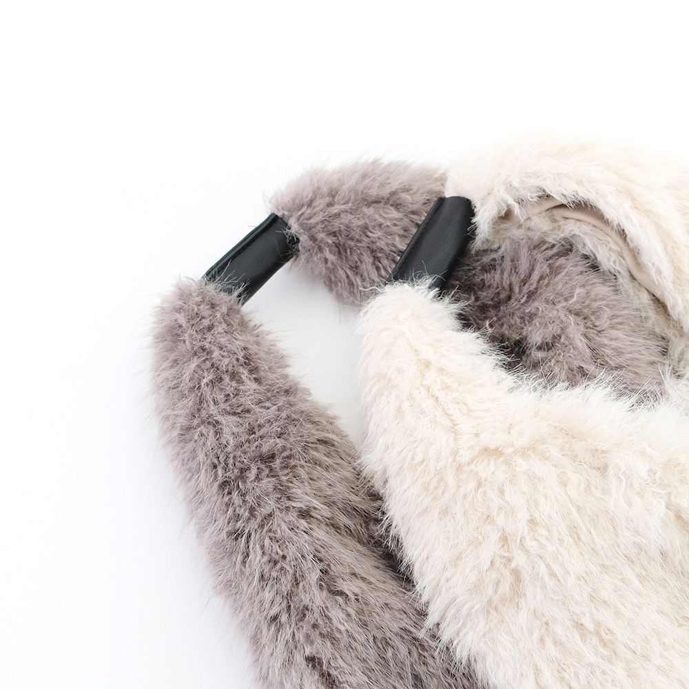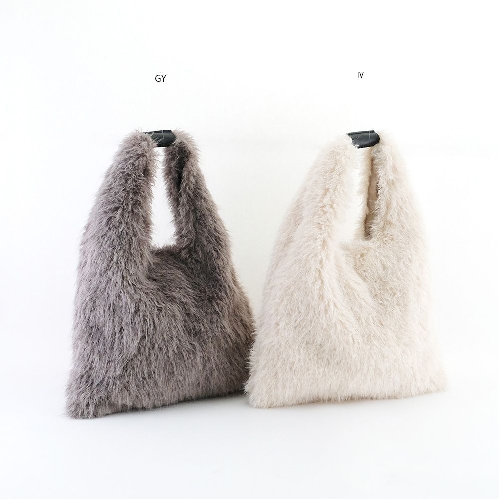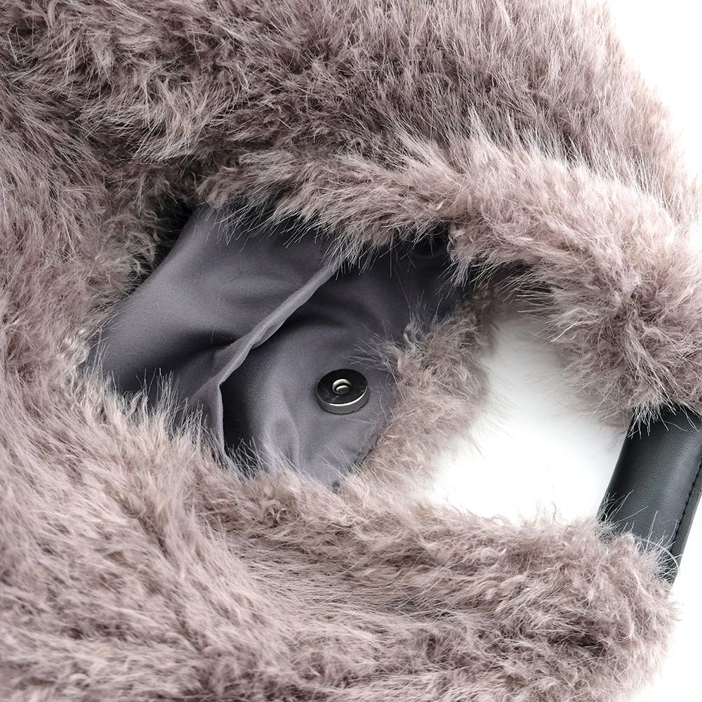カールが混ざったシャギーファーが魅力のボリュームバッグ。ふんわりとした軽さと滑らかな手触りで、持つだけで洗練された存在感を演出します。ワンハンドルデザインがシンプルながらもスタイリッシュな印象を与え、握りやすいPUハンドルがアクセントに。冬のコーディネートを華やかに彩る、上質でトレンド感あふれるアイテムです。