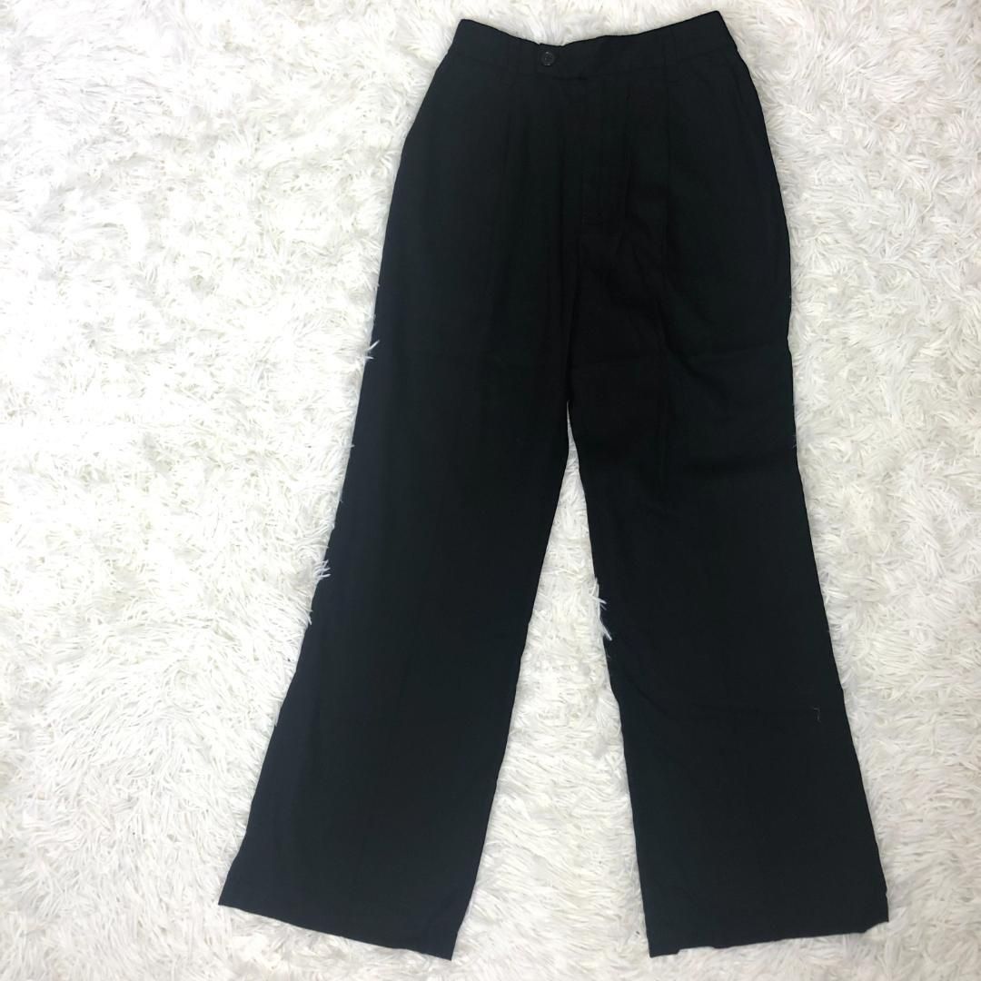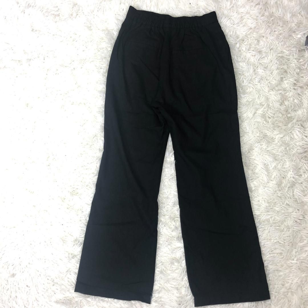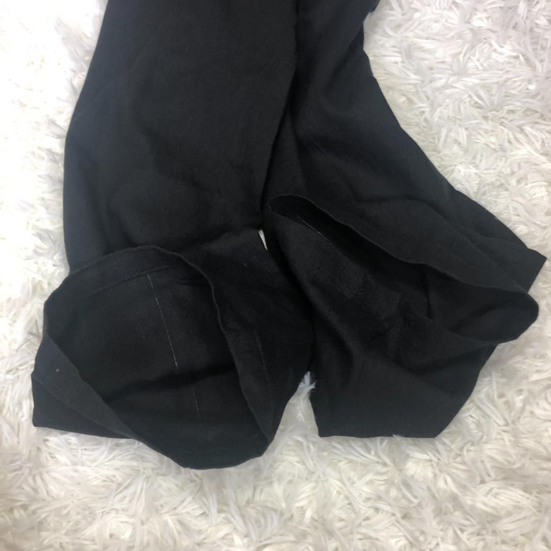 ウエスト後ろゴムの1タック入り・黒いパンツです。ファスナー+ボタン着脱。ポケット4つ付きです。ストレッチが効いています。