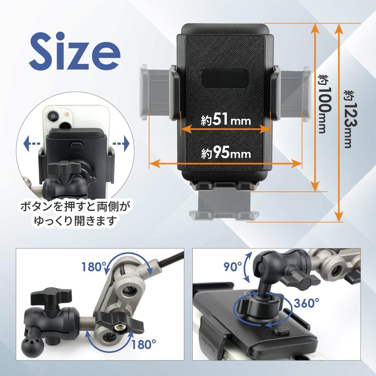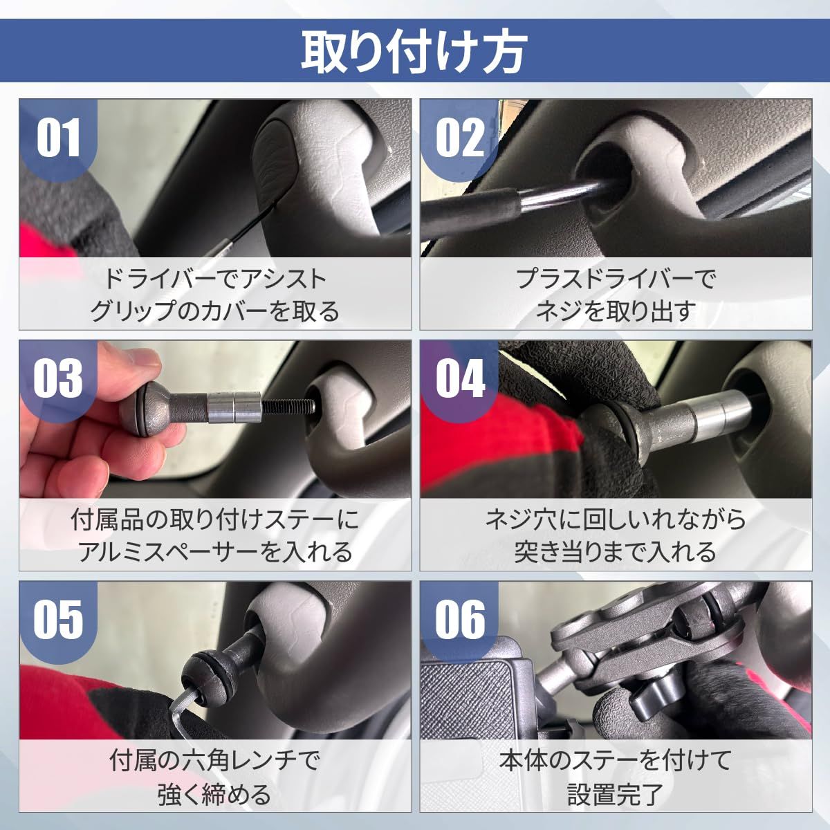 《取り付け方法》1:先端が鋭利または平たいドライバーでアシストグリップの下カバーを取り除きます。2:プラスドライバーでネジを取ります。3:取り付けステーに付属のアルミスペーサーを装着してネジ穴に回し入れます。4:手で回せるところまで入れます。5:六角レンチで強く締めます。6:ステーのボールジョイントにスマホホルダーを接続したら設置完了です。