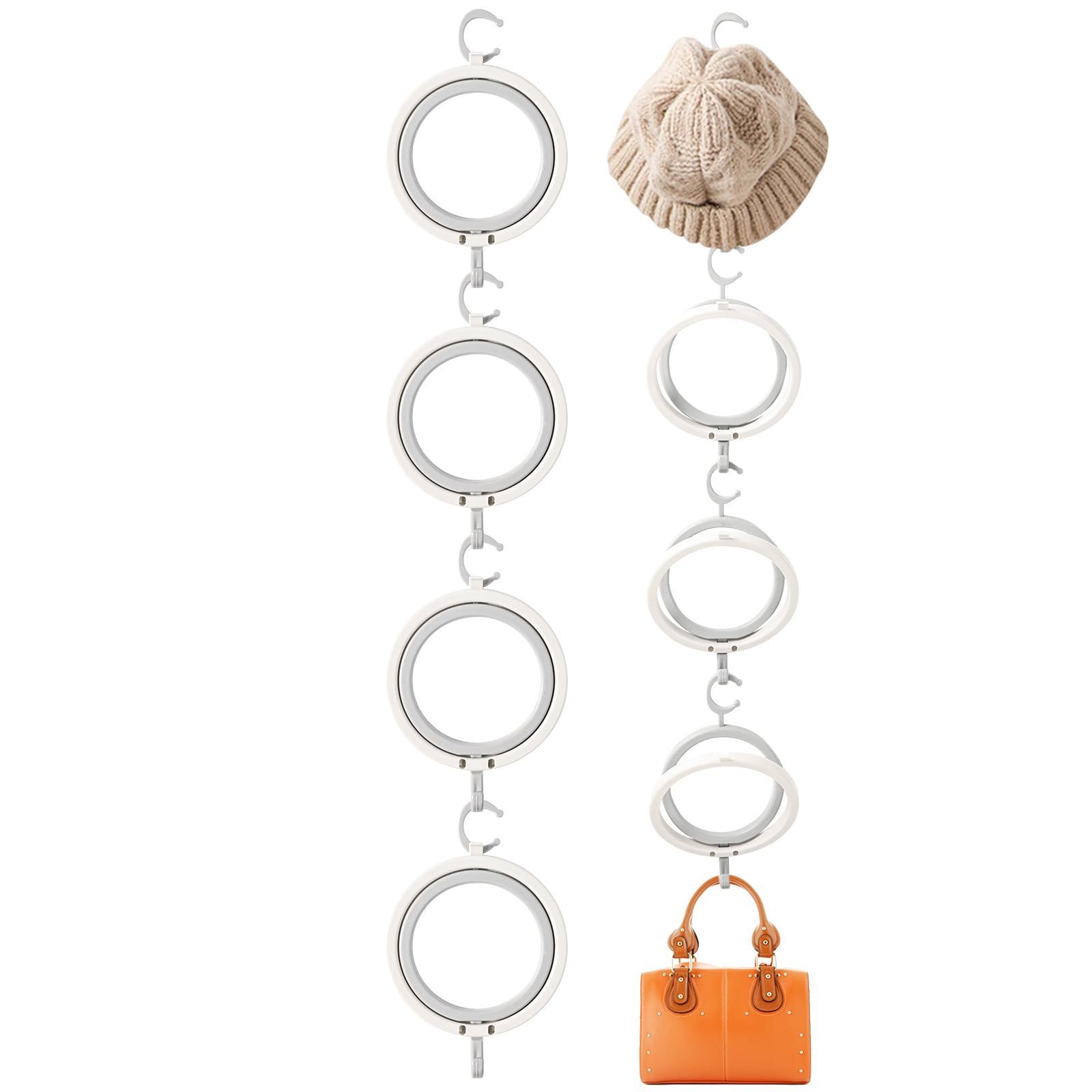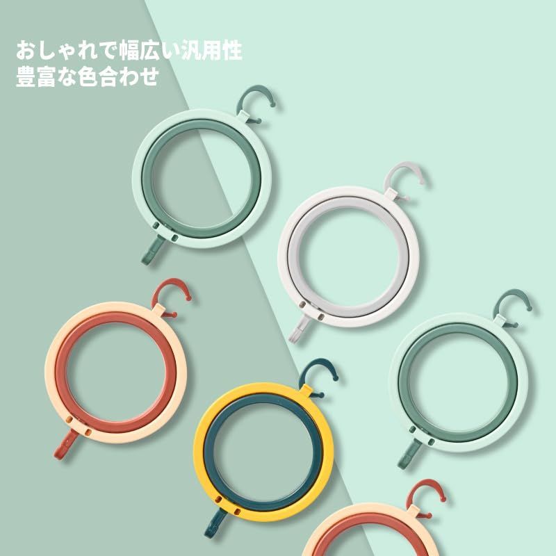 【使いやすい】リングの上のフックを、上のリングの下側にフックに引っ掛けるだけです。一番下に掛けたリングの下側のフックも使えます。輪っかのパーツは1個づつ別々の袋に入っており、それぞれの袋に1個、テープで壁などに貼れる粘着テープの付いたフックがついていました。こちらの商品と組み合わせなくてもこれ単独で使えます。