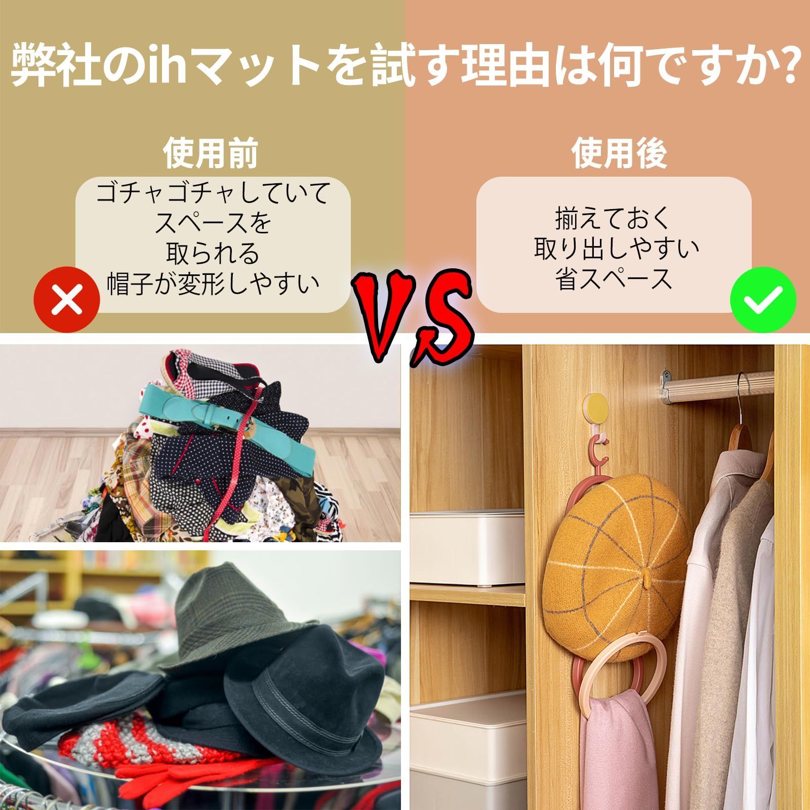 【空間有効活用 省スベース】縦に収納でき、収納場所も取りません。 吊るすことで壁面などを有効活用できます。帽子を平面にならべるとかさばるものですが、この製品を利用すると、限られた場所に4つくらいかけることができます。一つ一つ分離と連結が出来る所です。それぞれにシールタイプのフックも付いていたのでその点は良いです。空間を利用して収納出来るのは便利です。スペースを十分に活用できます。