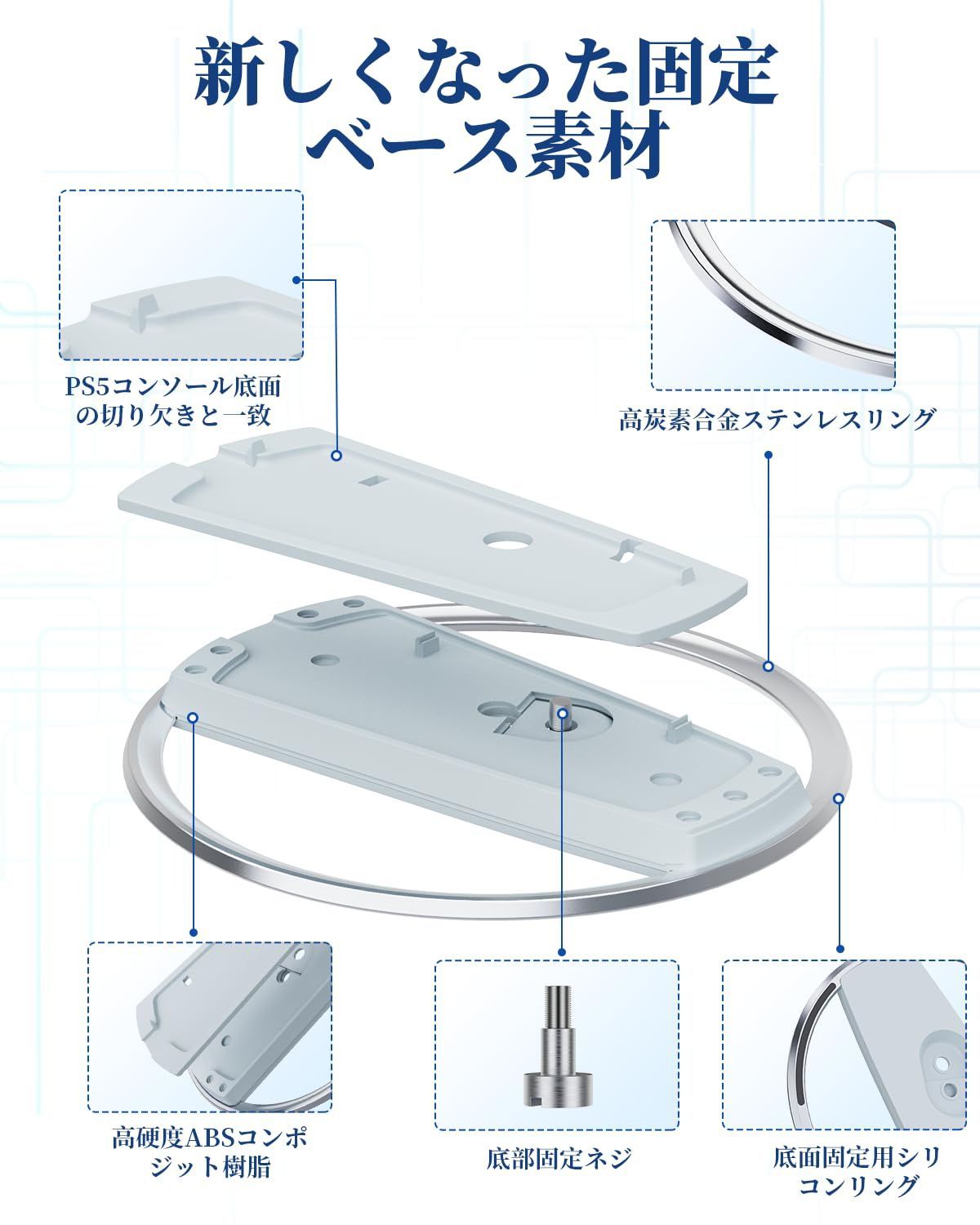 【高品質の素材で丁寧に作られた】:当社のPS5 Pro/PS5コンソールアクセサリーは高品質の素材で丁寧に設計されています。 リングは高炭素合金ステンレス鋼リングを採用し、硬くて耐磨耗性に優れ、表面は滑らかで美しいです;センターベースは高硬度ABS複合樹脂を採用し、耐久性とサポート力を強化します。 また、高品質のABSは耐腐食性、耐熱性、放熱性に優れ、無臭です。 PlayStation 5のスタンドとしてだけでなく、使用時にゲーム機の放熱機能を最適化し、長時間のゲーム中に最高のパフォーマンスを発揮し、ゲーム機の寿命を延ばすパフォーマンスエンハンサーでもあります。