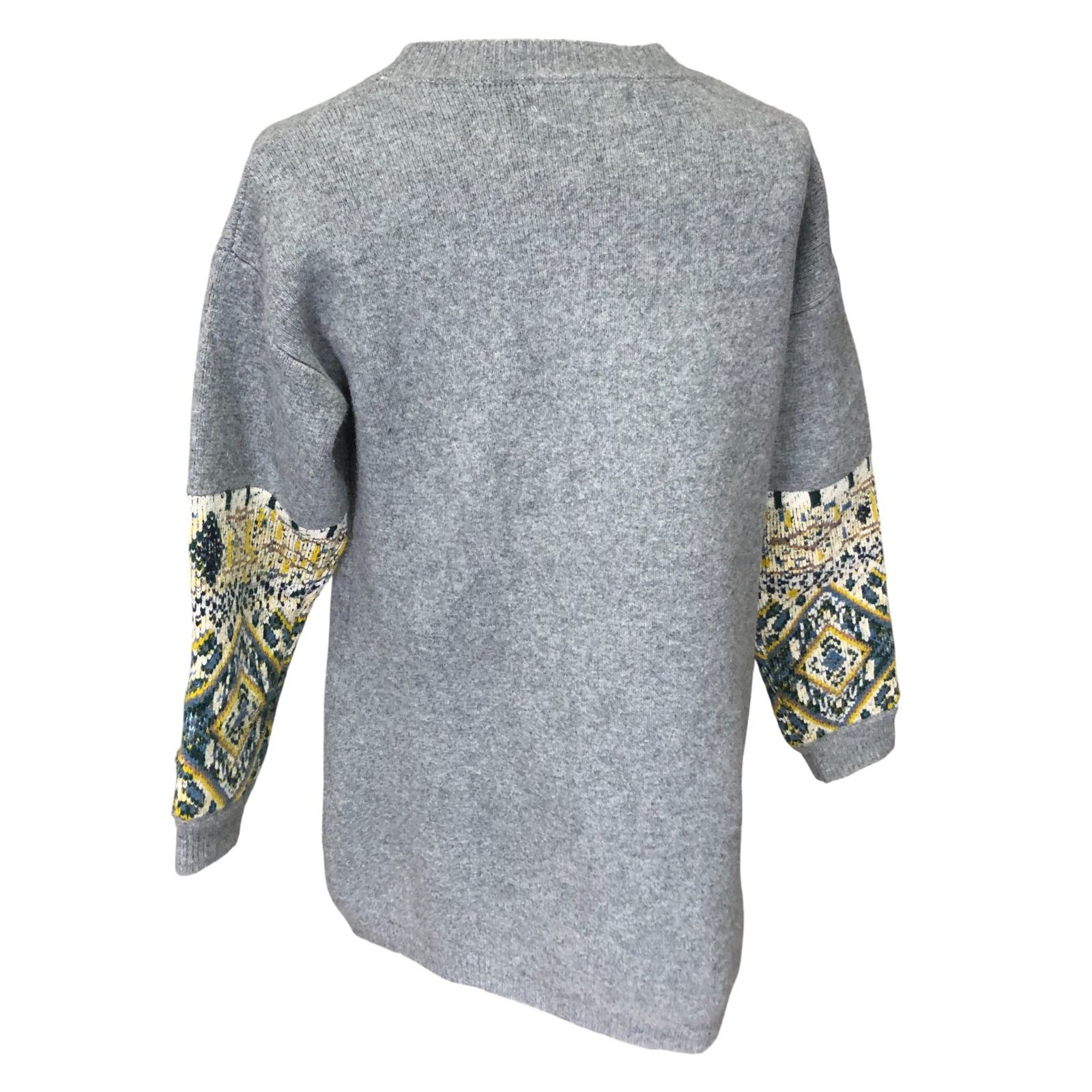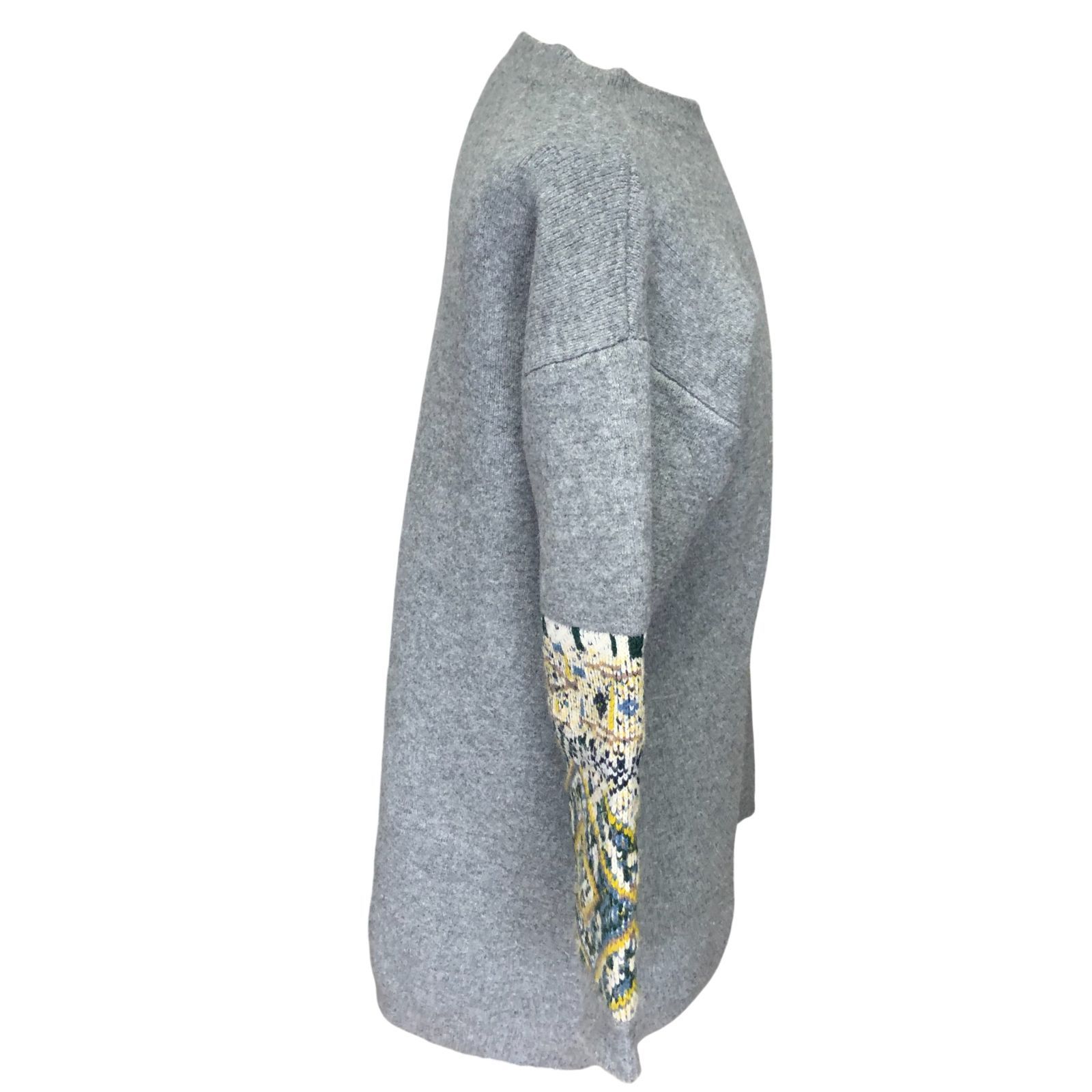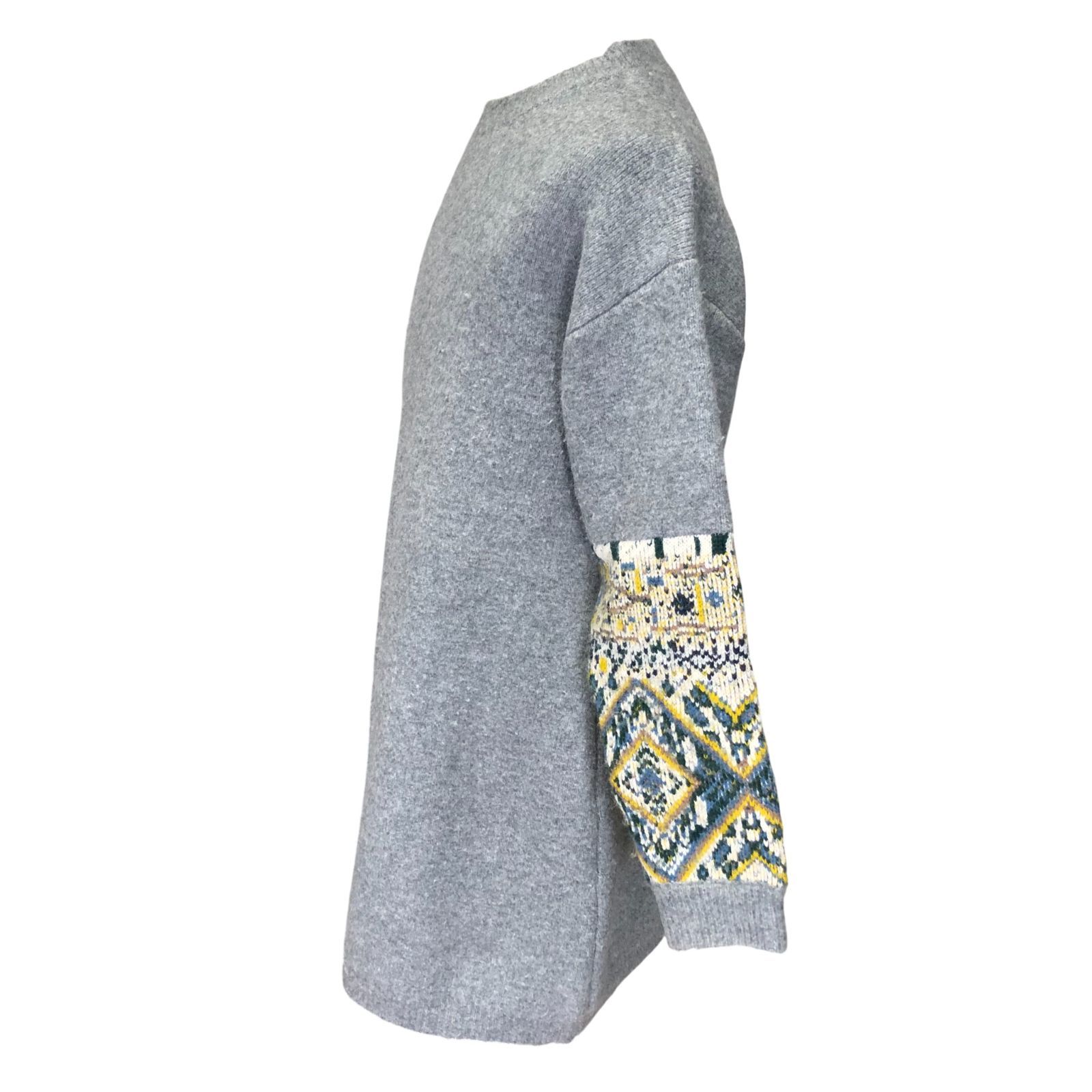 グレーのミニ丈・ゆったりとしたシルエットのニットワンピースです。両袖に施されたカラフルな幾何学模様が特徴的なデザインです。身長160cm着用で膝上丈です。