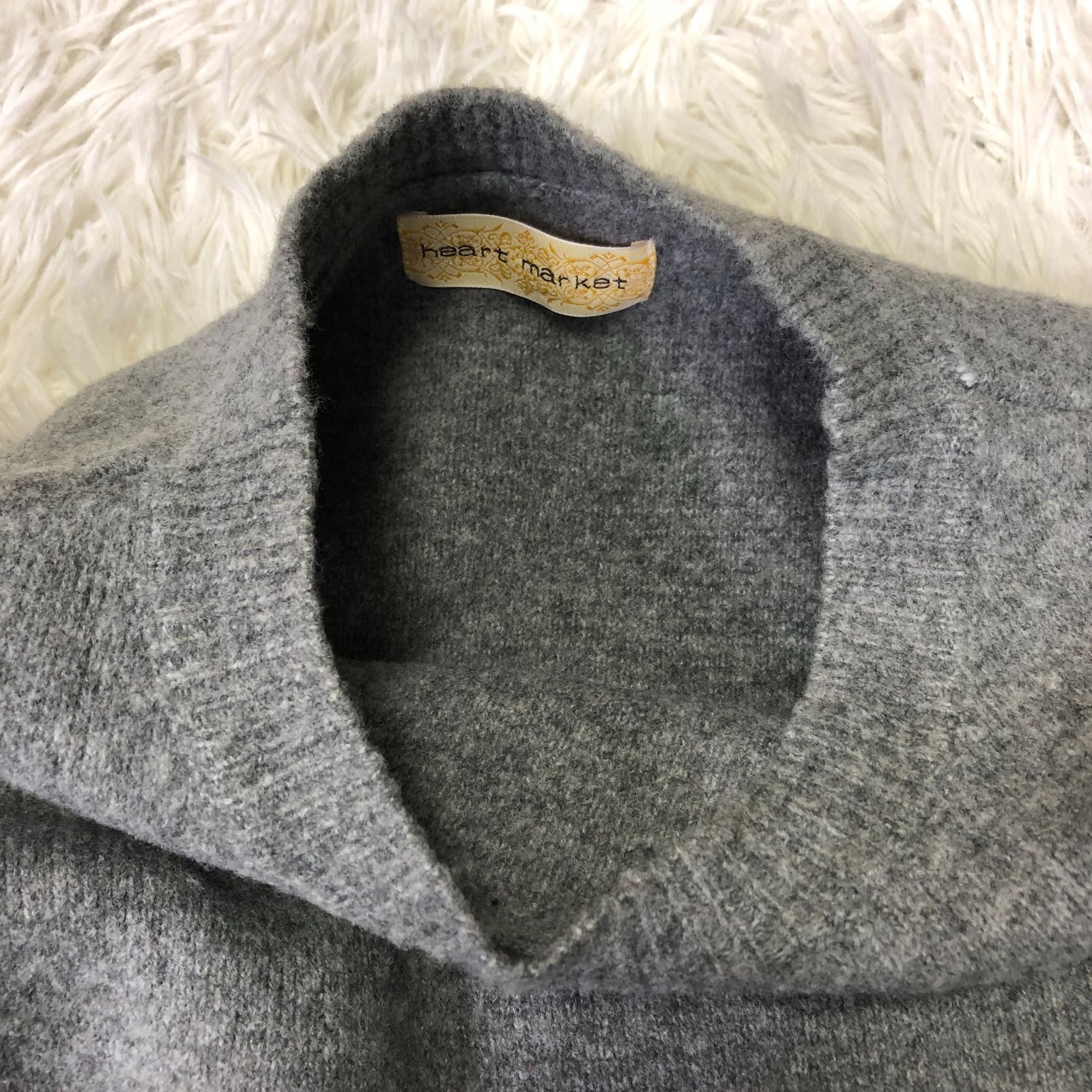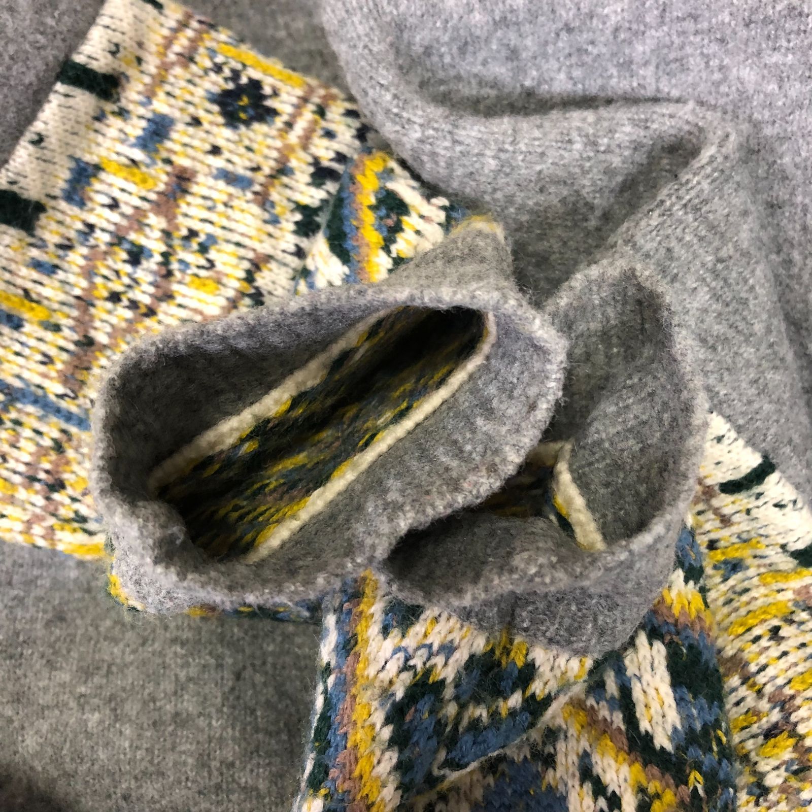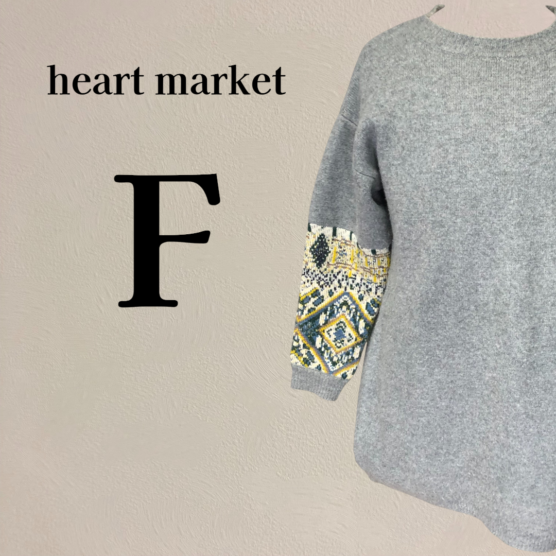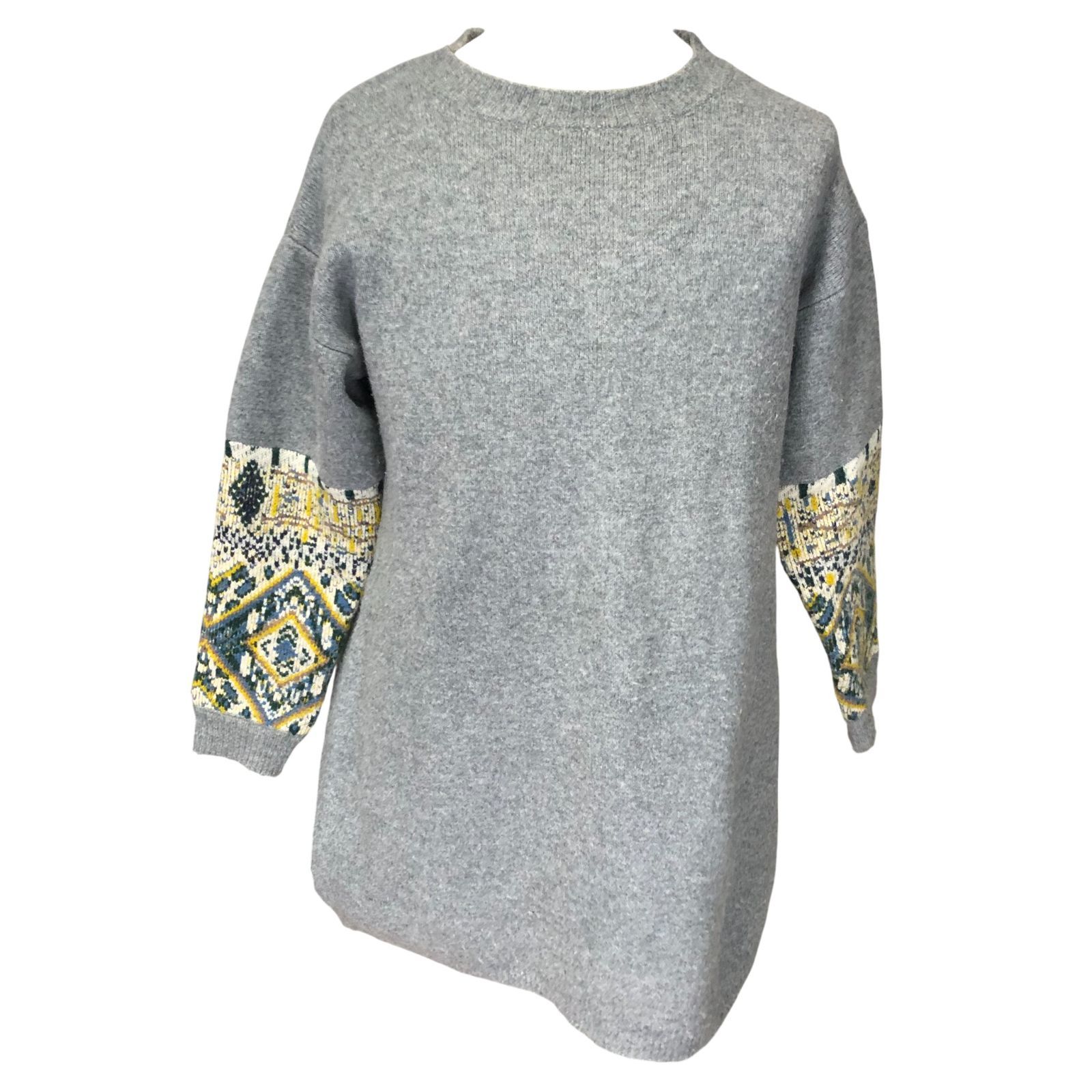 グレーのミニ丈・ゆったりとしたシルエットのニットワンピースです。両袖に施されたカラフルな幾何学模様が特徴的なデザインです。身長160cm着用で膝上丈です。