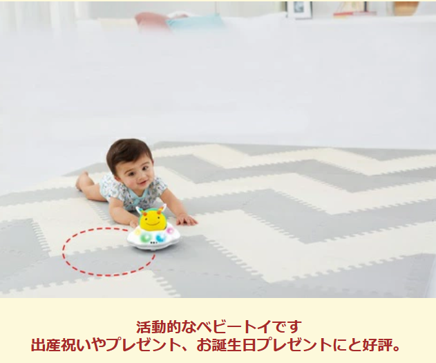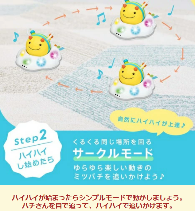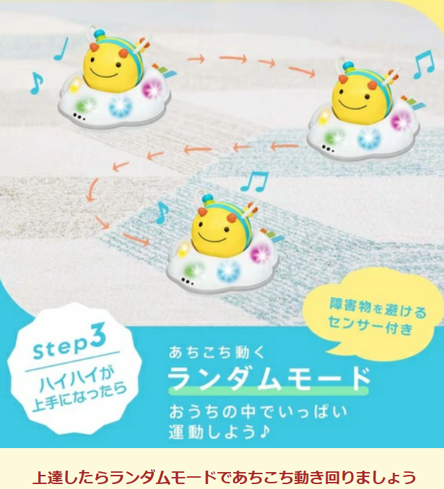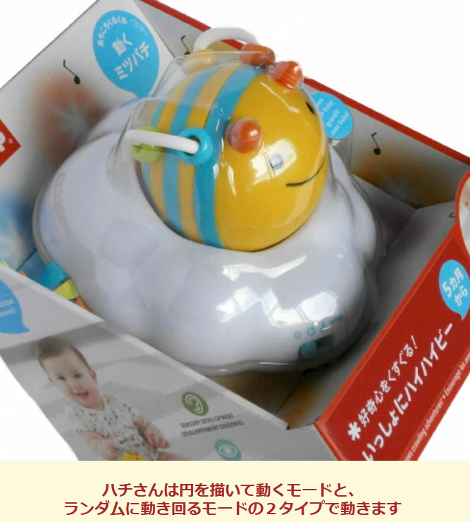 光とライトと楽しいメロディで動き回るハチさんを目で追っかけ、ハイハイで追っかけます。
