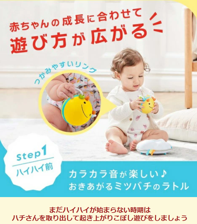 ハイハイ前はハチさんは取り外しができますので カラカラ音がたのしい♪ おきあがるミツバチ で遊びましょう。