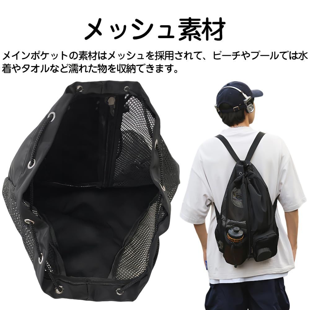 メッシュ素材:メインポケットにはメッシュ素材を採用しており、ビーチやプールでは濡れた水着やタオルなどの収納に便利でございます。