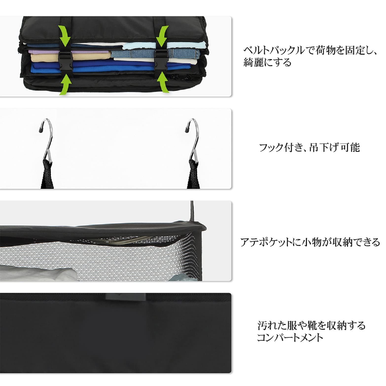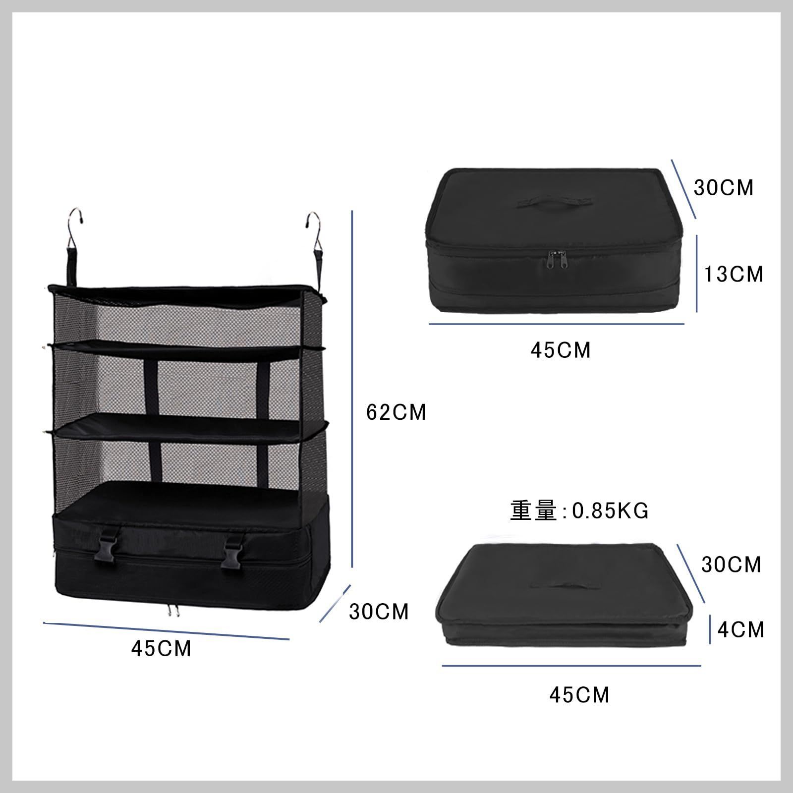 【素材】ポリエステル 【カラー】ブラック ブルー グレー ローズ カチオングレー 【吊り下げサイズ】Lサイズ:30*30*61CM XLサイズ:45*30*62CM 【荷物を入れた収納サイズ】Lサイズ:30*30*13CM XLサイズ:45*30*13CM 【不使用時の折畳みサイズ】Lサイズ:30*30*4CM XLサイズ:45*30*4CM