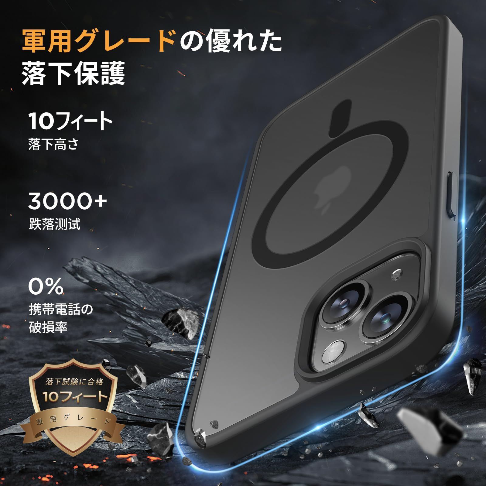 【米軍規格レベルの耐衝撃性】iPhone 13 ケース,360°エアバッグ構造+3層TPUクッションを採用。3メートル高さからの3000回落下試験をクリア,試験端末破損ゼロ。日常の落下衝撃からスマートフォンを確実にガード