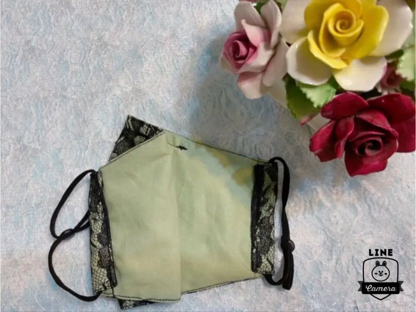 表地はお洒落な光沢のあるレース、中はブロード(綿100よりシワになりにくい生地)くすみ緑 裏はWガーゼ、くすみある緑色を使用しています。全て日本製の生地です。