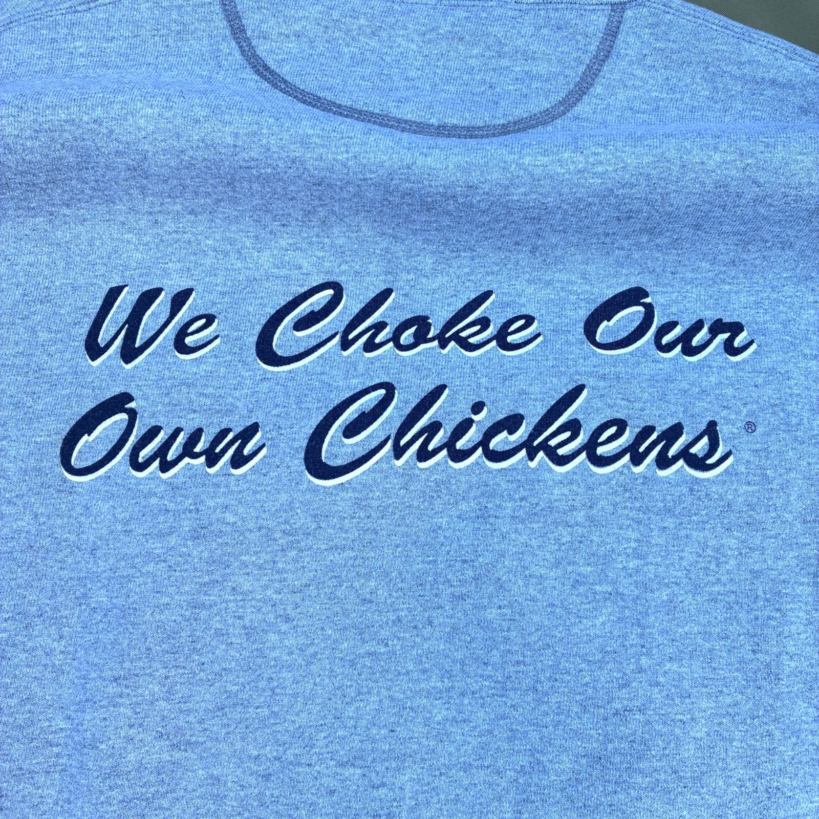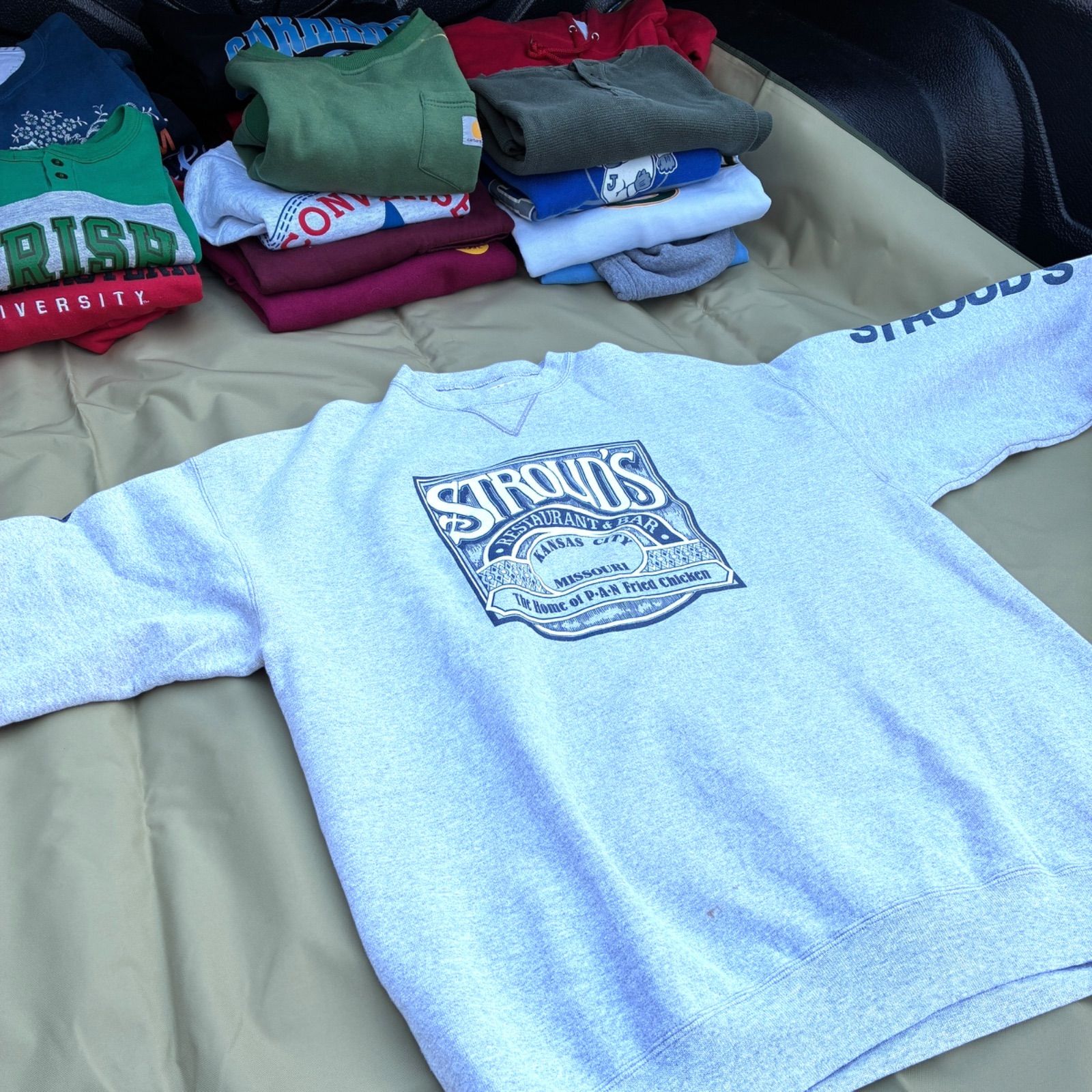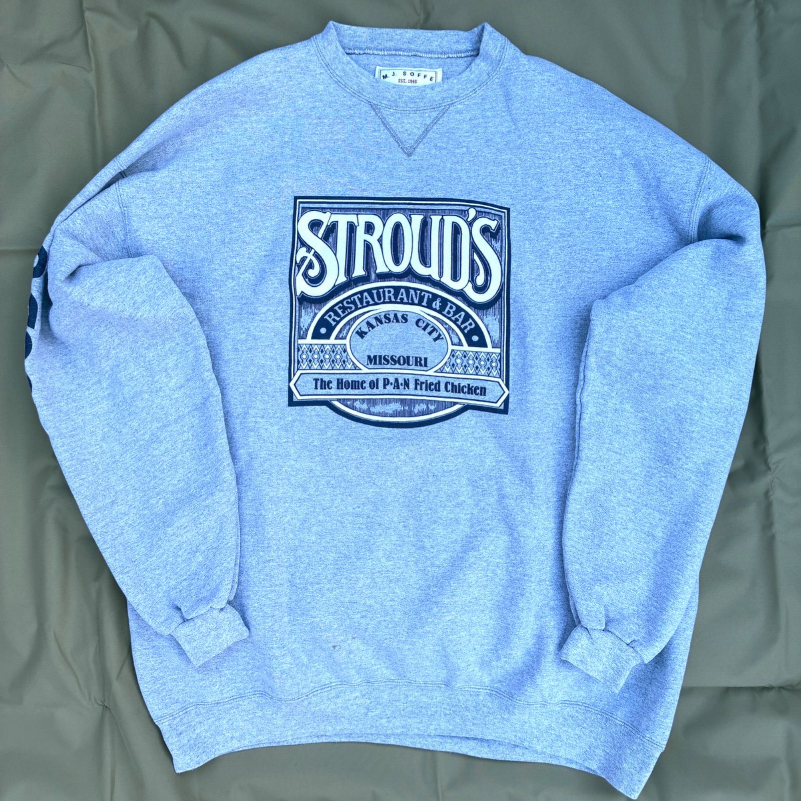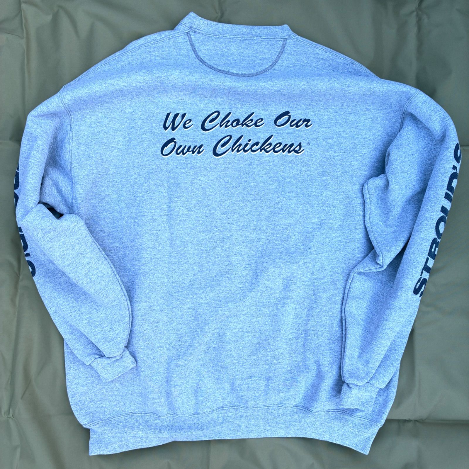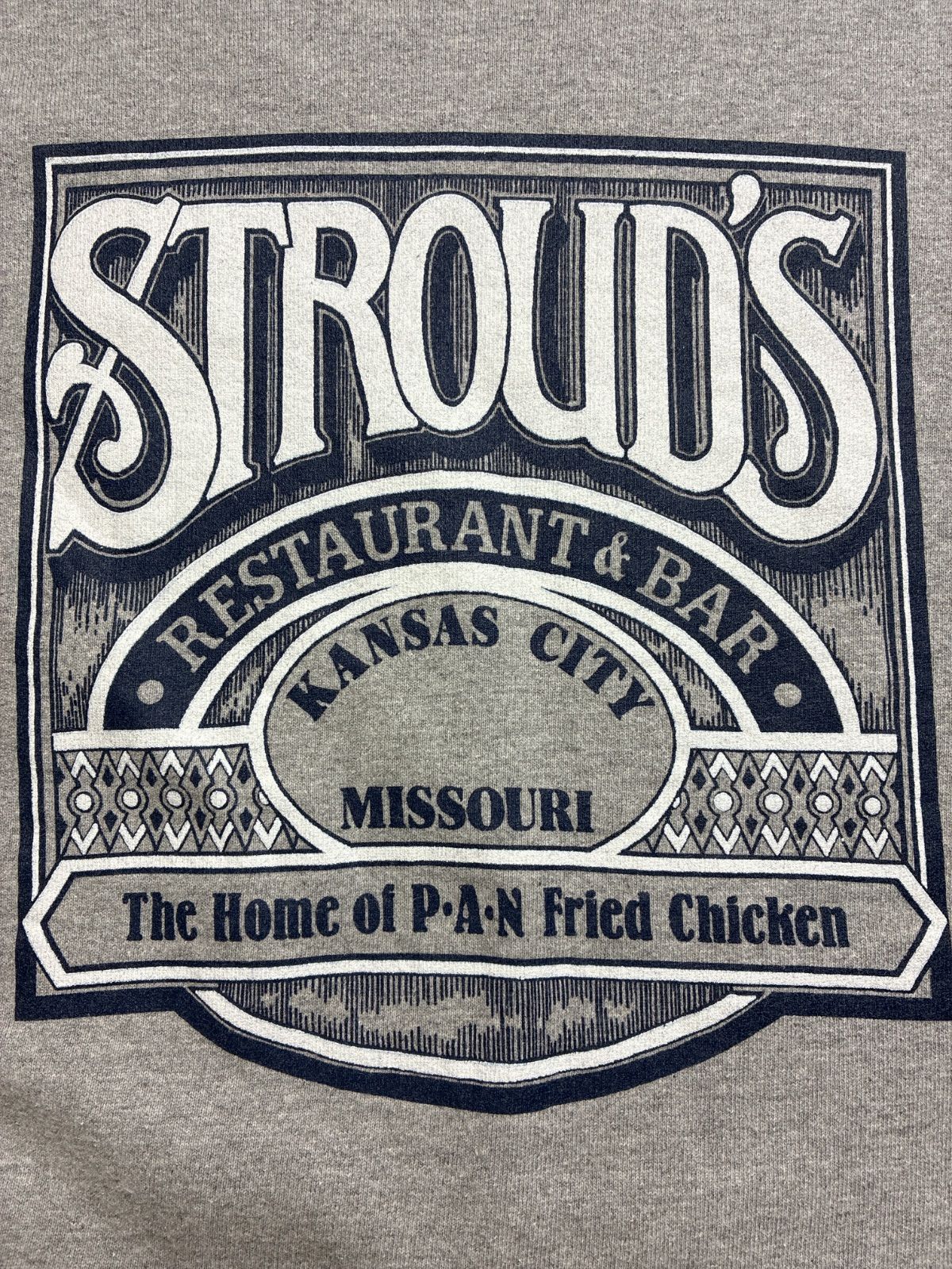 • Description: A fantastic piece of Americana. This vintage M.J. SOFFE sweatshirt features "Stroud's Restaurant & Bar" (Kansas City) graphics. The back print features their famous, cheeky slogan: "We Choke Our Own Chickens." Highly collectible advertising piece.