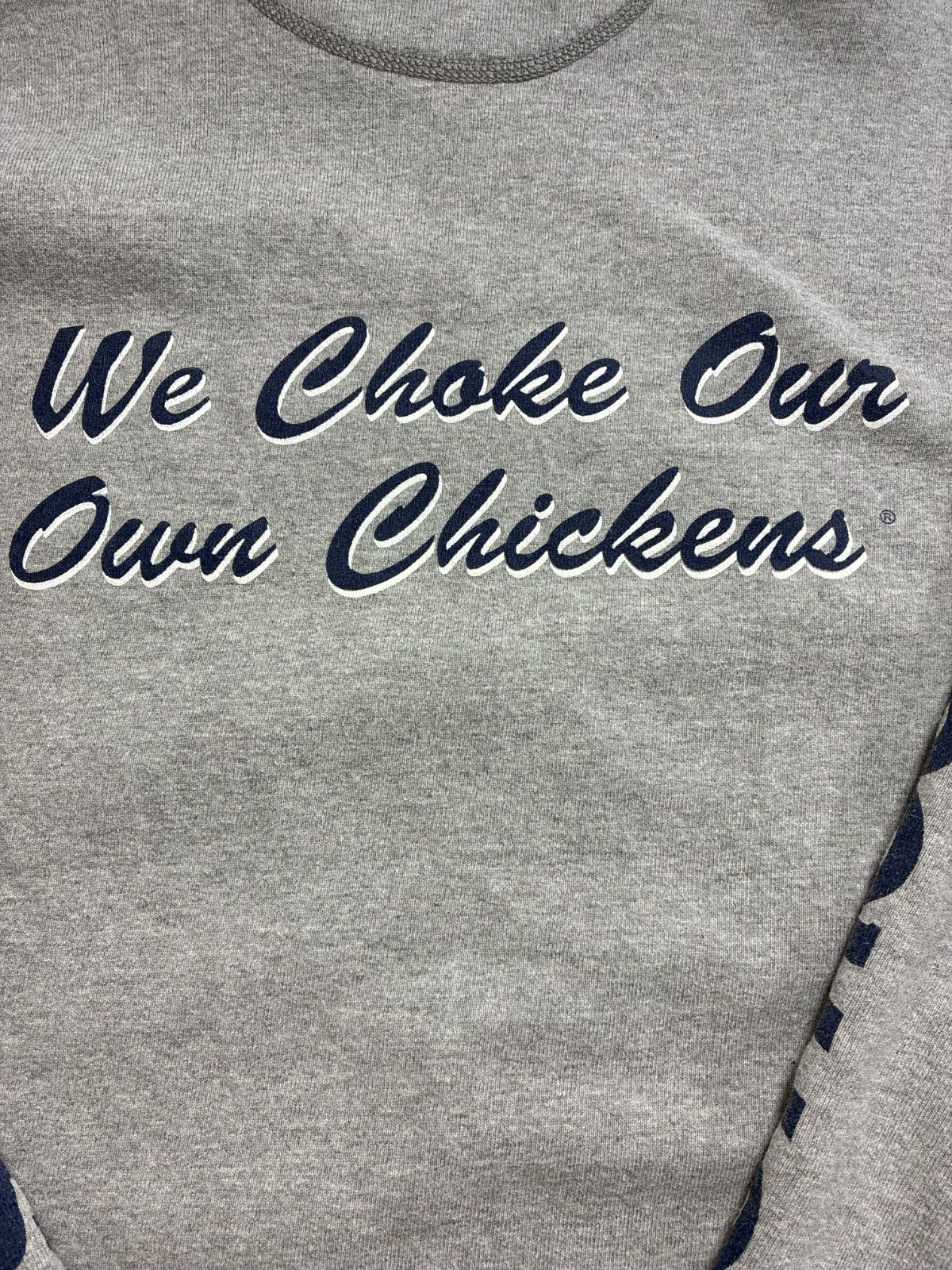 特筆すべきは背面の "We Choke Our Own Chickens" というプリント。この店独特のブラックユーモアが効いた名作デザインです。