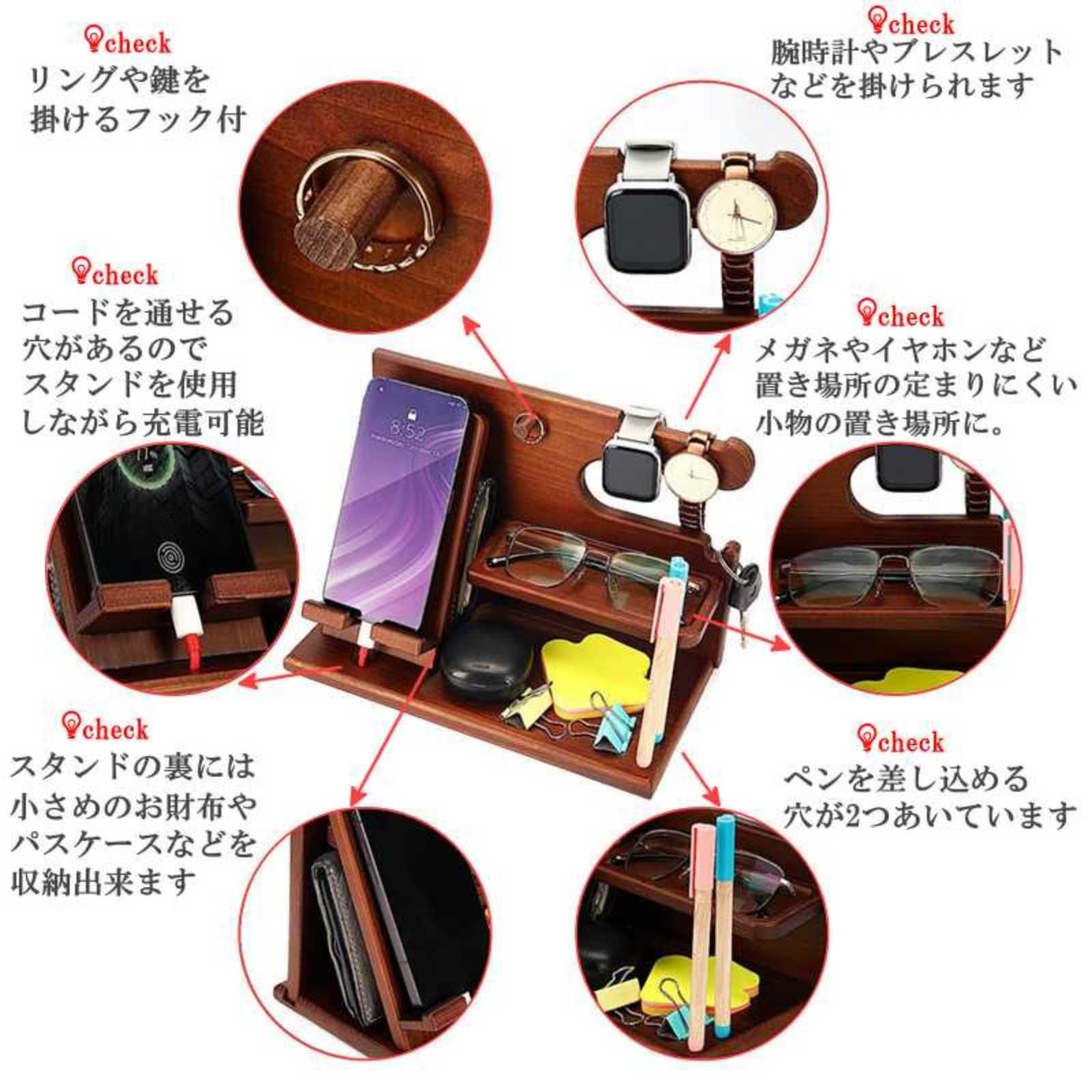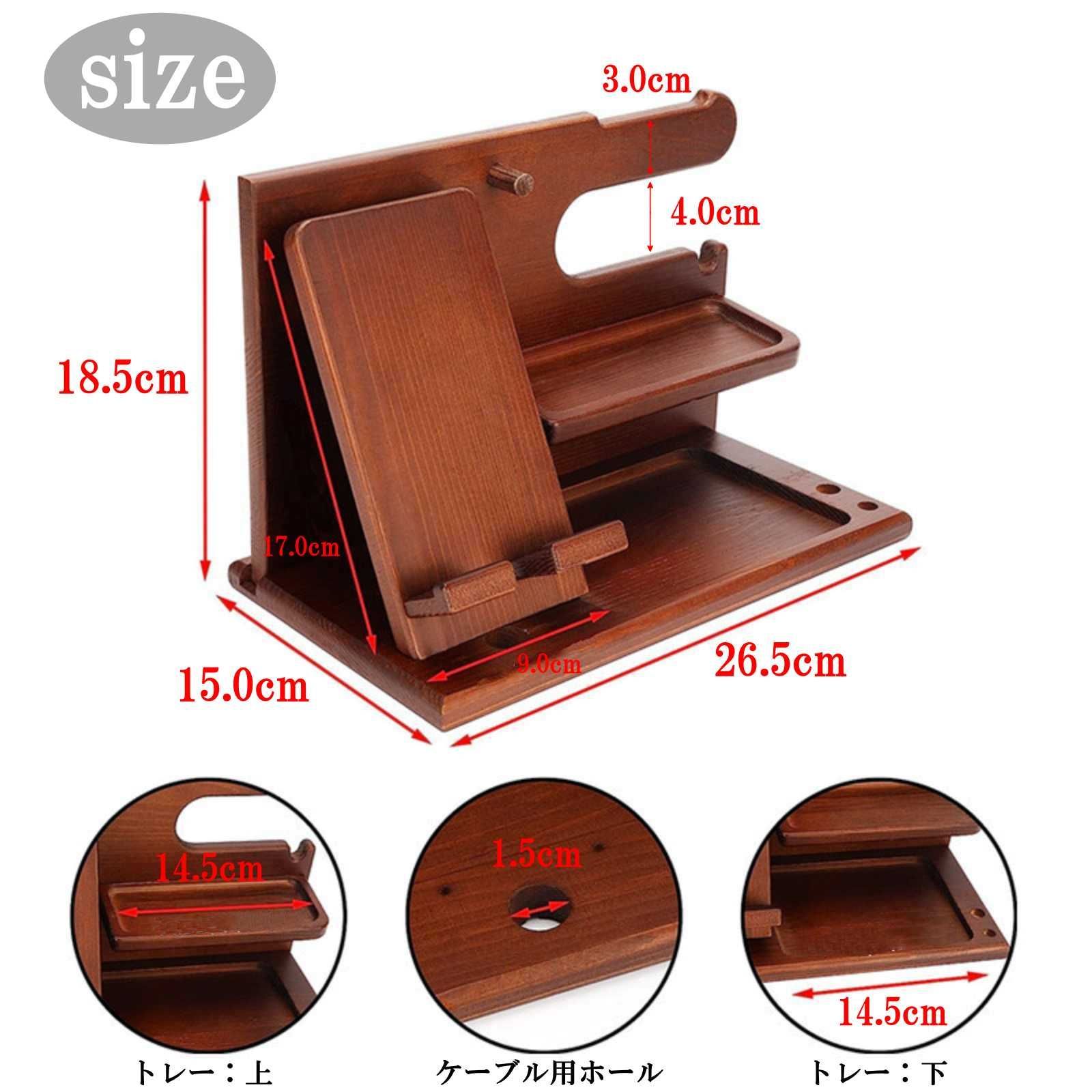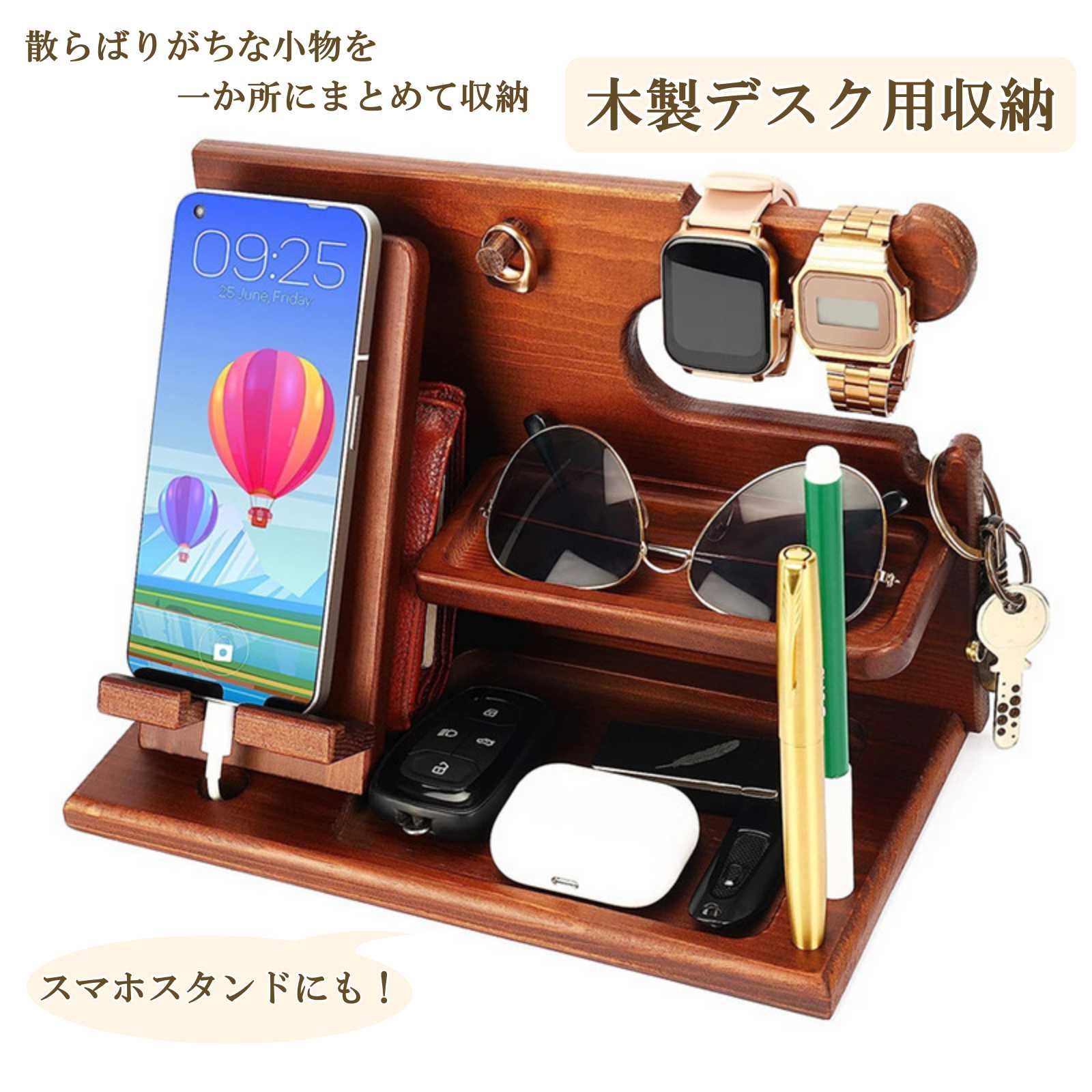 スマホスタンドにも使える木製デスク収納です。