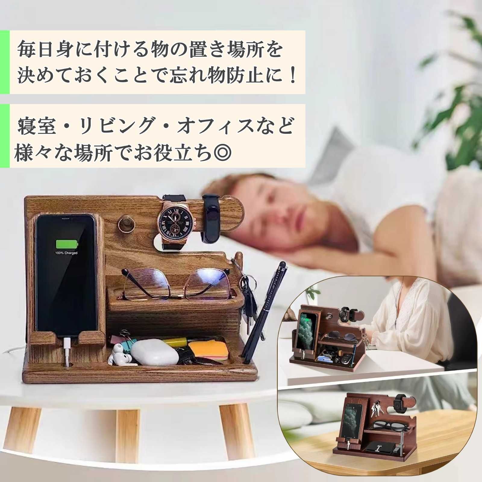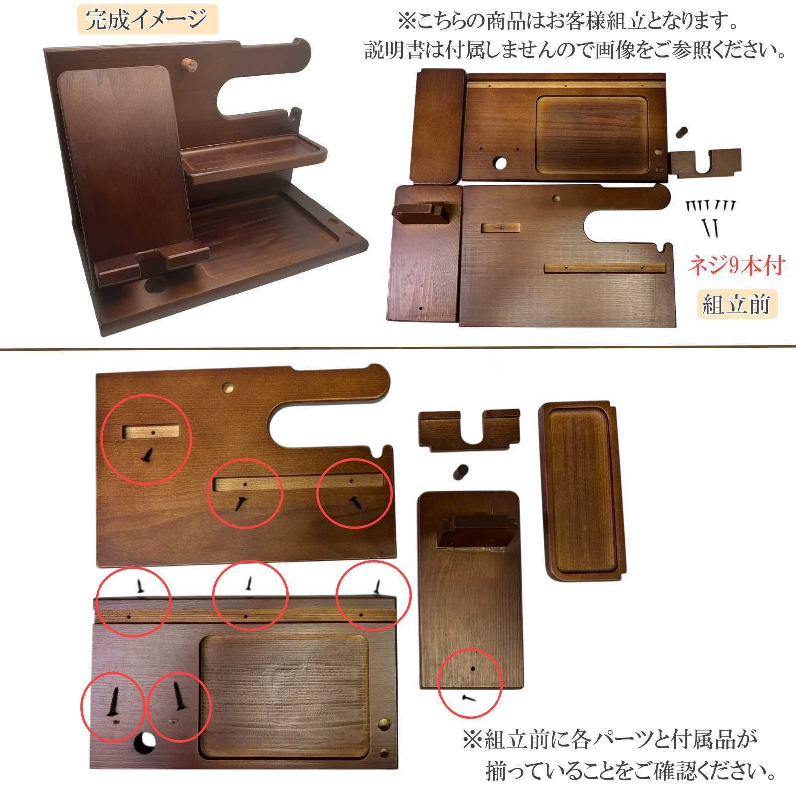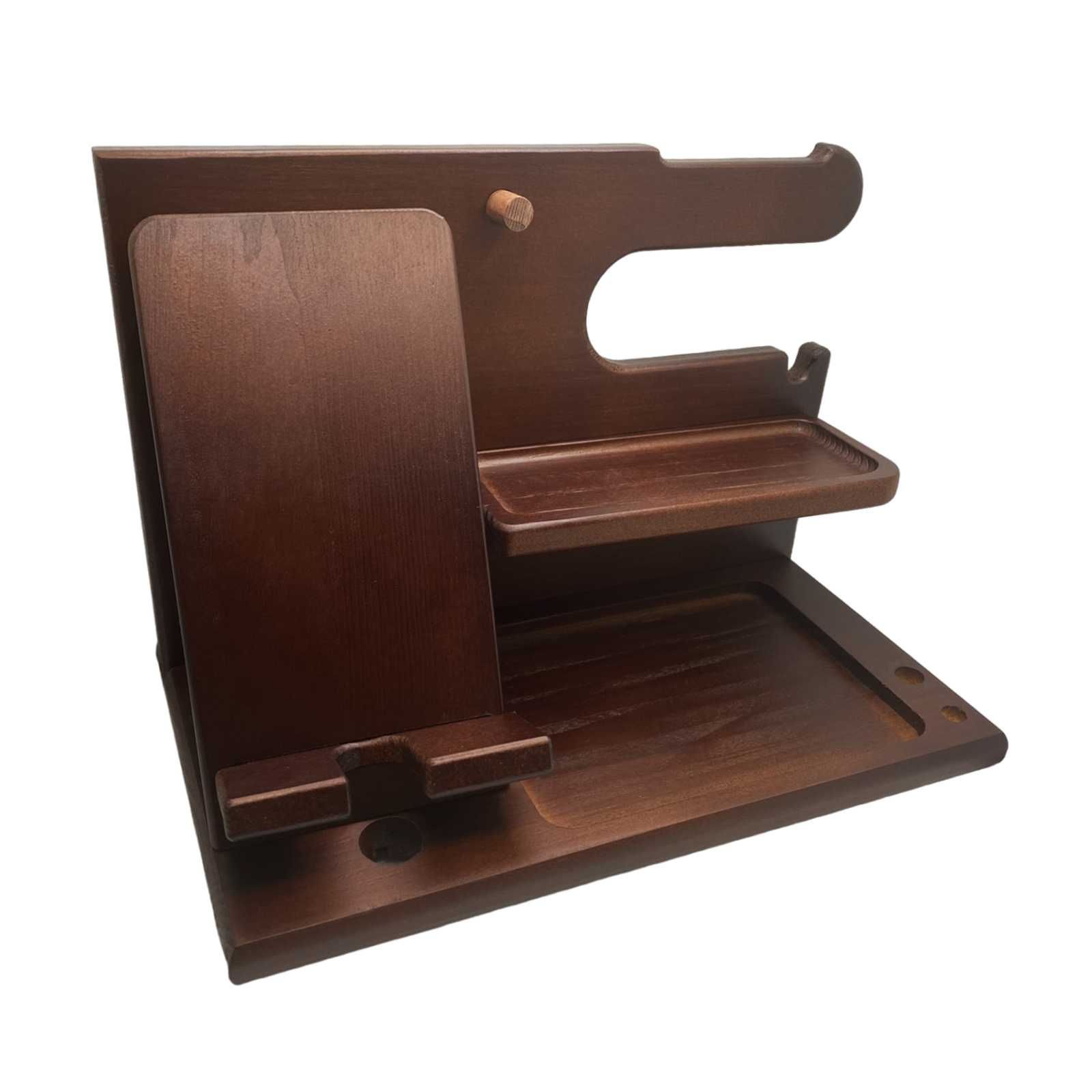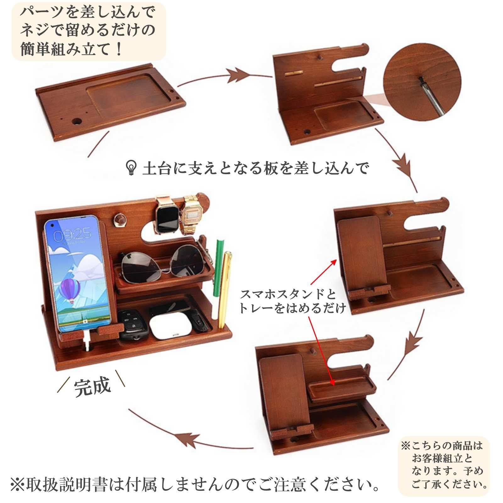 スマホスタンドにも使える木製デスク収納です。