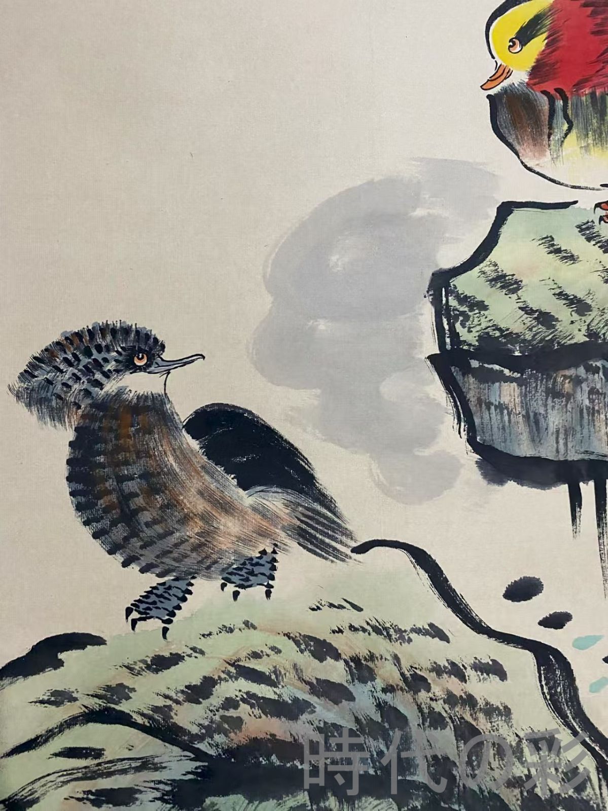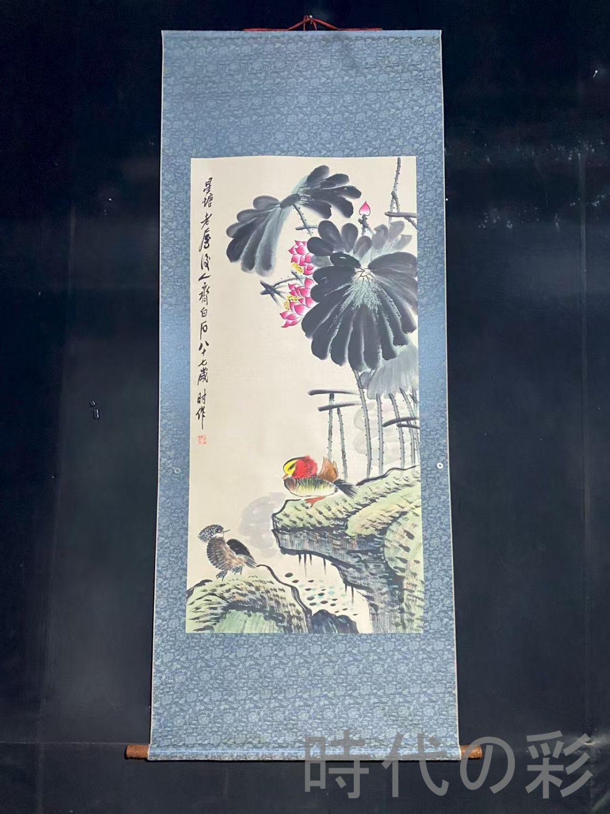 近代巨匠齊白石の花鳥画を基にした四尺中堂画。宣紙に伸びやかな筆致で花と鳥が描かれ、生命力溢れる作風が特徴です。唐物美術として収蔵価値があり、書斎飾りや鑑賞用に最適な逸品です。保存状態も良好です。