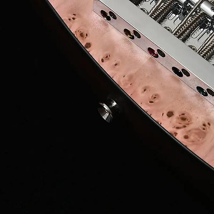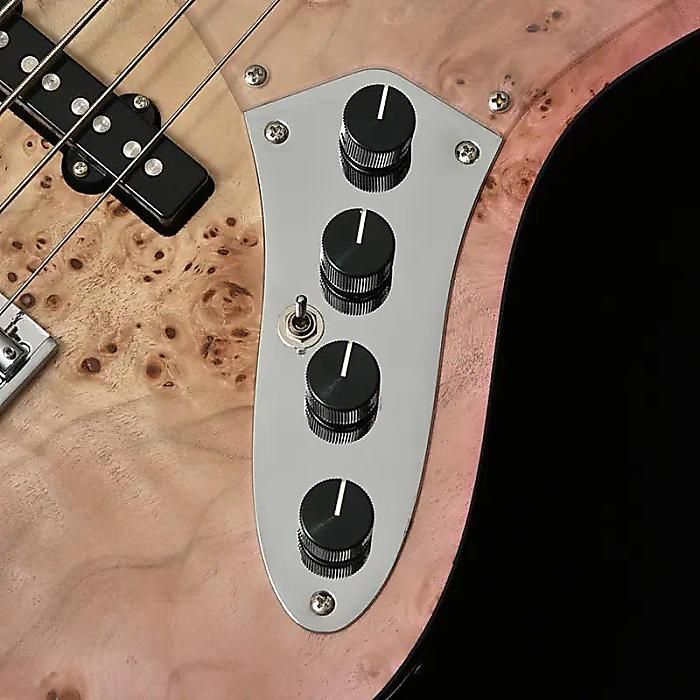 ボディトップにバールポプラを採用 Bacchus -Japan Tune-up Series- 経験豊富な日本の職人の手によって行われる最終工程。ディバイザーが有する国内部署「 WDG ( Workshop Deviser Guitars )」にて、プレイアビリティに直結する部分を丁寧に仕上げます。 ■ ボディトップ バール杢の出ているポプラ材。個体、個体で違った顔があり、非常に特徴的な杢目となっています。 本モデルは過去に Bacchus Handmade Series から限定モデルで登場した、 KRB (渓流ブルー)のカラーリングを踏襲した淡い色合いで仕上げています。メイプルの指板を含めてベース全体の外観を柔らかな雰囲気でまとまっています。 ■ ボディー Handmade シリーズで培った “WOODLINE” の持つ、ディンキーシェイプのボディを継承。一般的な JB タイプのエレキベースよりややスリムに設計されており、プレイアビリティに優れます。 ■ ネックプレート プレートには比重の高い真鍮(ブラス)製のオリジナルネックプレートを採用。従来品に比べて重量があり、密の詰まった中低音域にかけて広がるベース・トーンが特徴です。 ■ サーキット、コントロール系 Handmade シリーズのアクティブモデルと同様に 2 バンド EQ を備え、演奏中の細かなサウンドメイキングをサポートします。そしてしっかりとしたボトムを放出。ミニスイッチの切り替えにより、パッシブタイプとしても利用いただけます。 Body Top : Burl Poplar Body : Nyatoh Neck : Maple Fingerboard : Maple Nut : PPS Bridge : JB bridge w/ brass saddle Machineheads : Opengear Fret : Nickel Silver Pickup : Original JB set Preamp : Bacchus BBP2 Control : 1Vol, 1Bal, Treble, Bass, Preamp On / Off Switch Scale : 864mm(34inch) Fingerboard Radius : 400R Width at Nut : 45.0mm Finish : Open-pore String : D’addario XL-165-5 Accessories : ギグバッグ、保証書、レンチ ※ 掲載画像と実際の楽器の木目、色味などは印象が異なる場合がございます。全て新品。ケーブル・消耗品以外メーカー 1 年保証書付のでご安心してお買いもの頂けます。