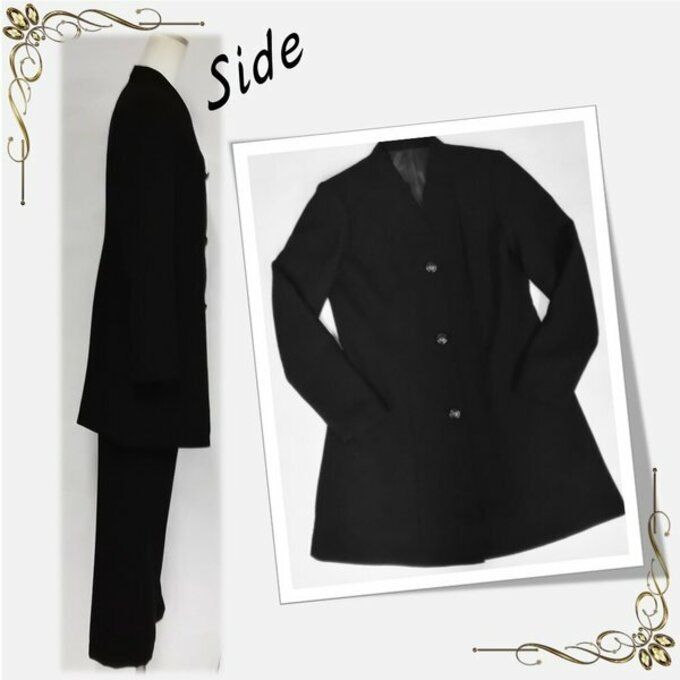 ジャケットとパンツが縦のラインが強調して、V開きの首周りはお顔をすっきりしてスタイリッシュな大人の女性に見せてくれます。