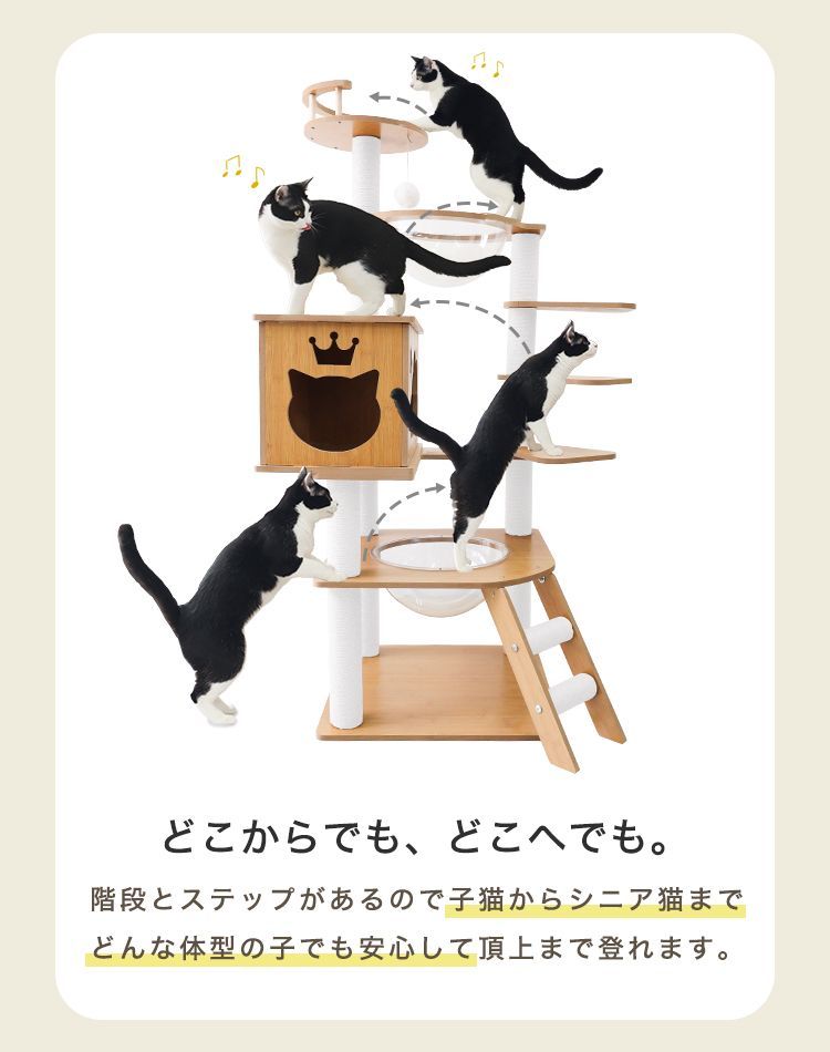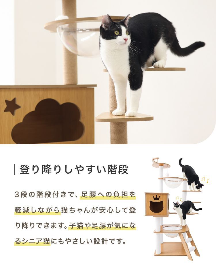 階段があるから、年齢や体型を問わないやさしい設計。子猫やシニア猫にもおすすめです。