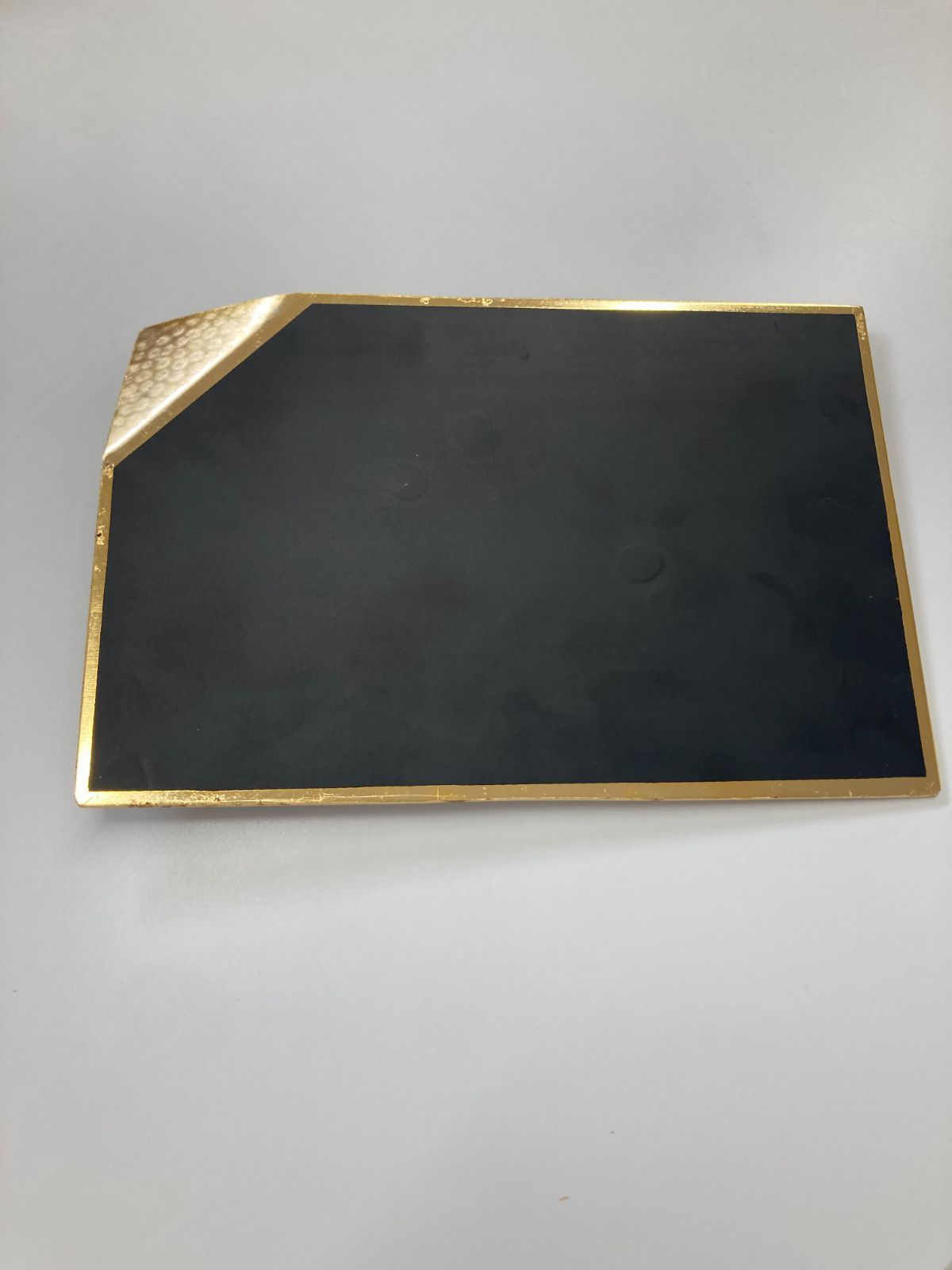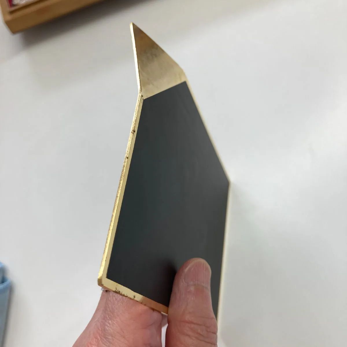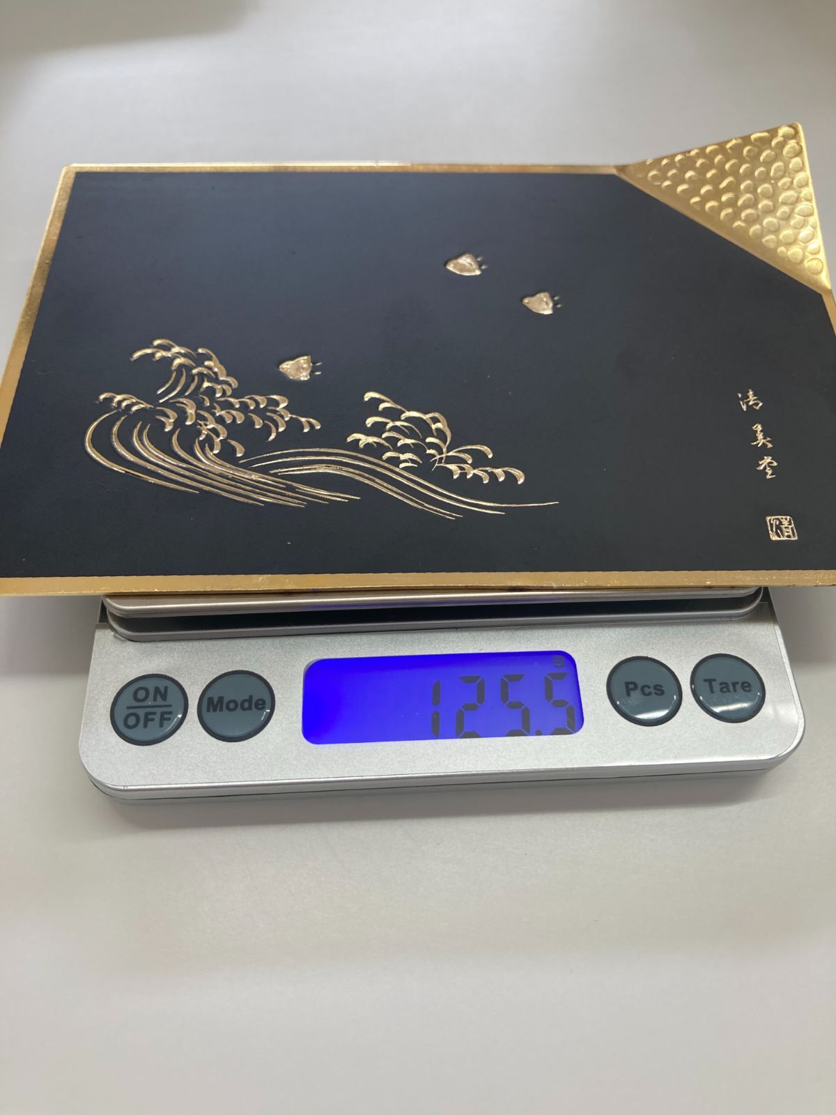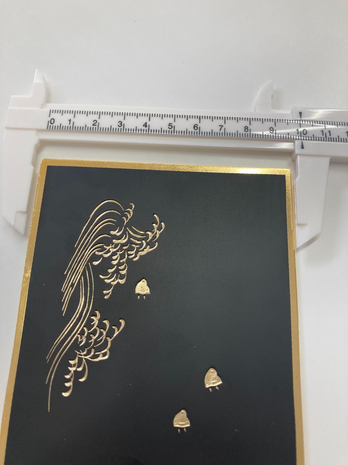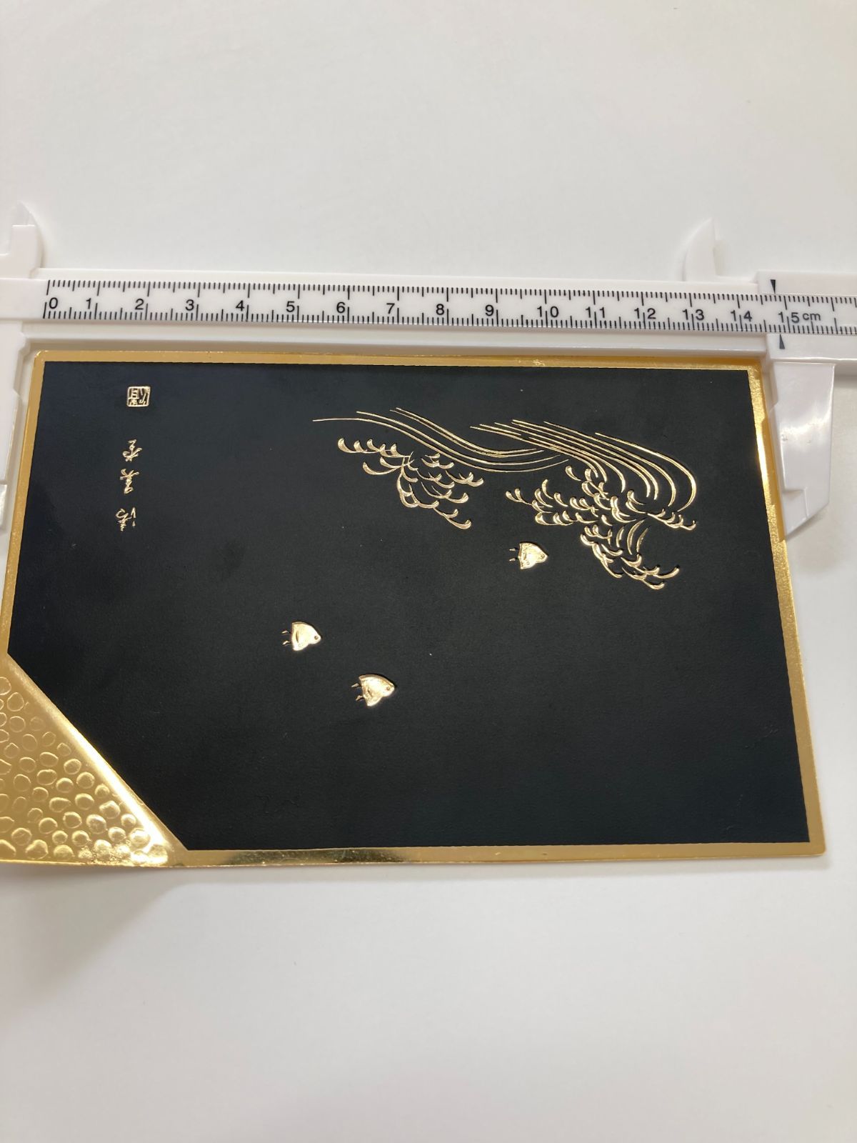 NCBブライト鋼板を材質に金属が持つ重厚感に手彫りに仕立てた純金をメッキ加工した