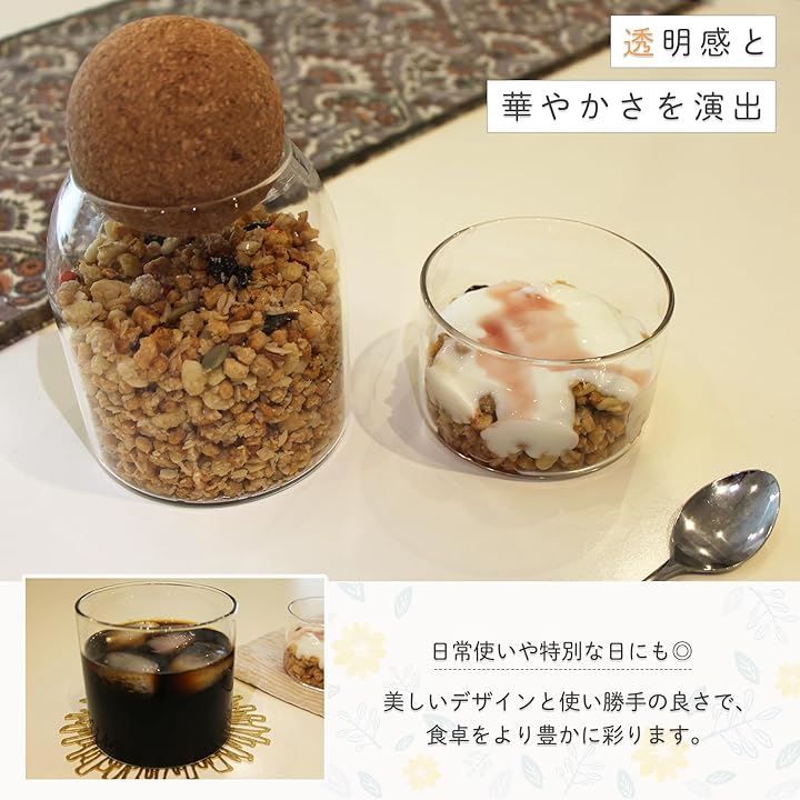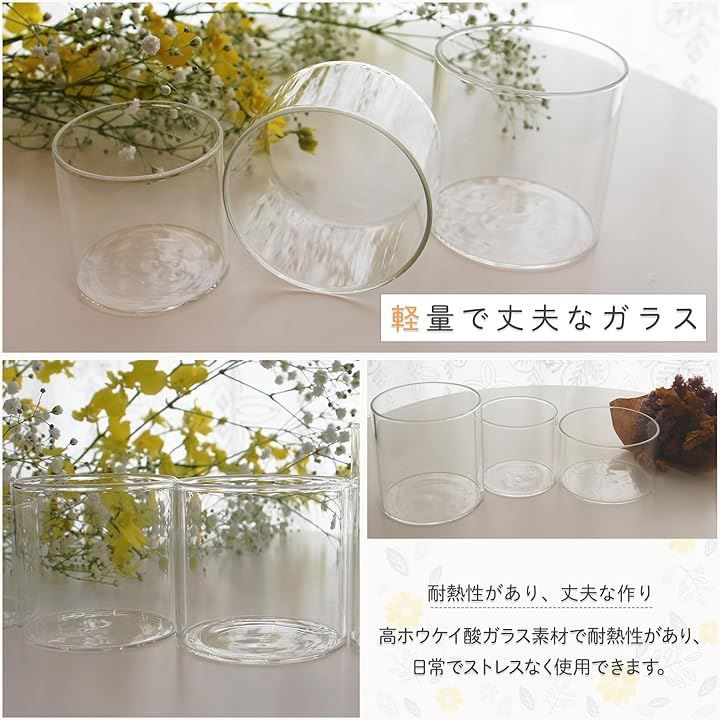 「商品詳細」 材質:高ホウケイ酸ガラス サイズ3種(直径6.5x6cmx、直径8x高さ5cm、直径8x高さ8cm) スタイル2種(6個セット、12個セット)
