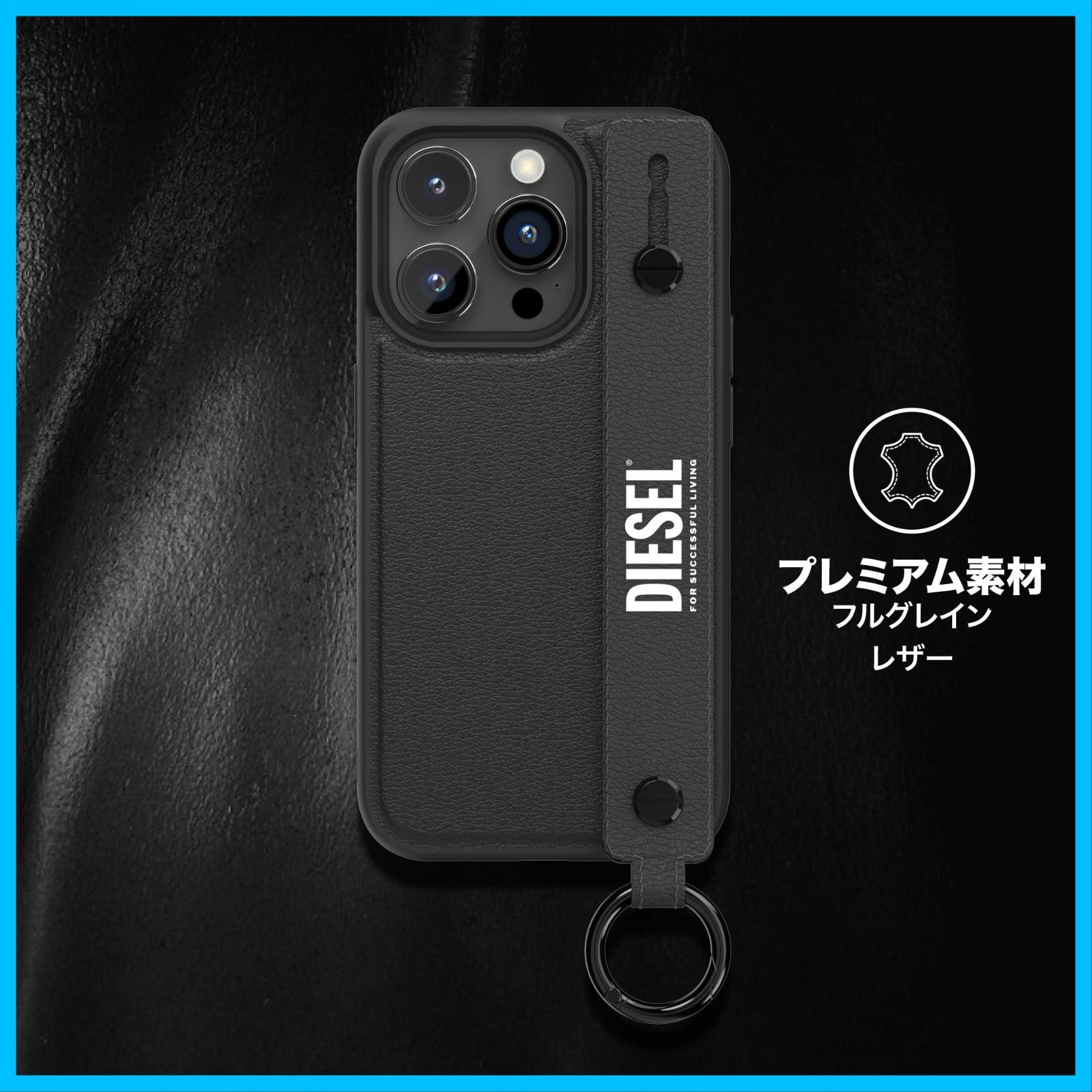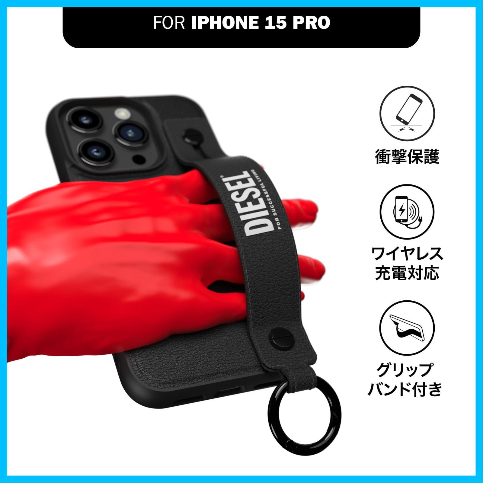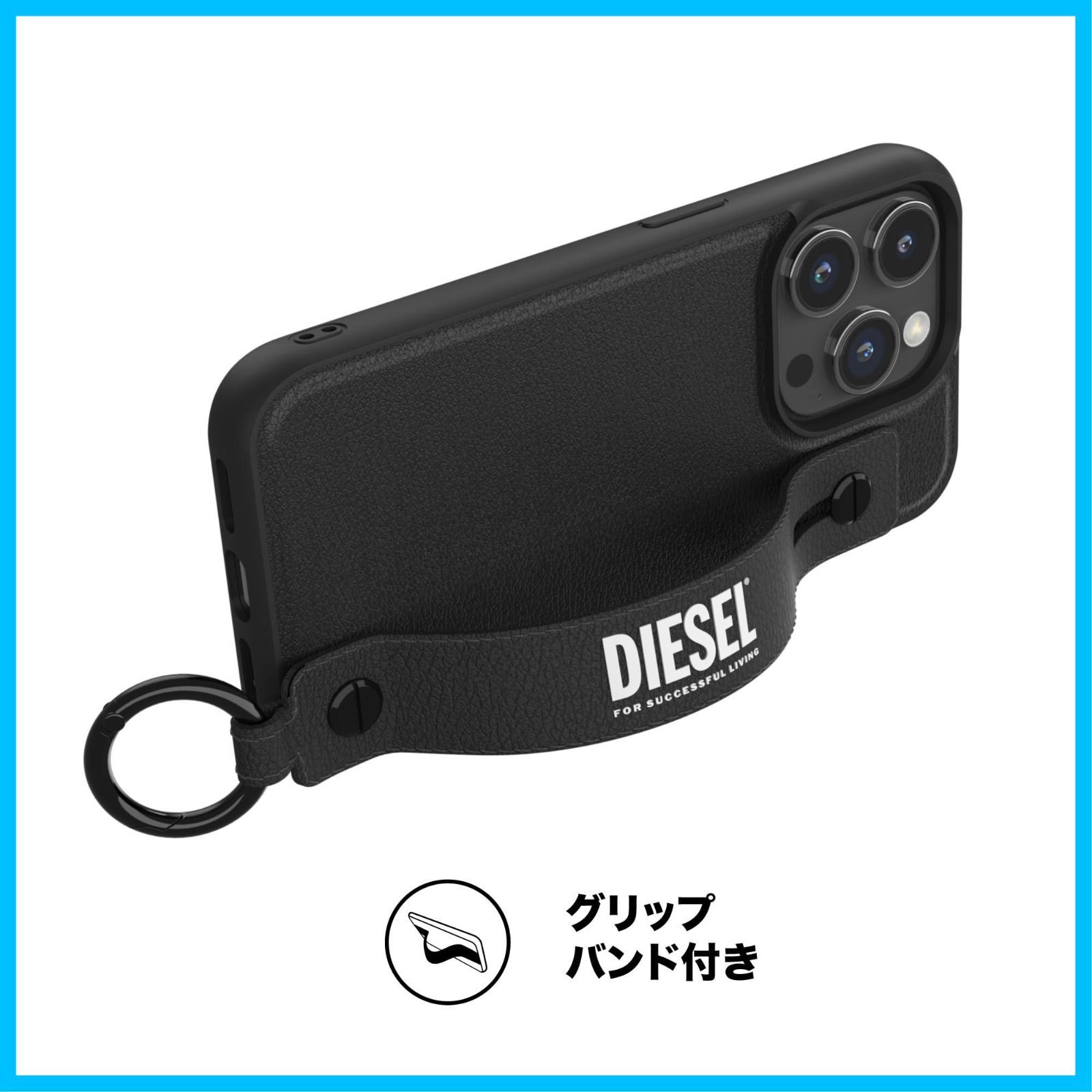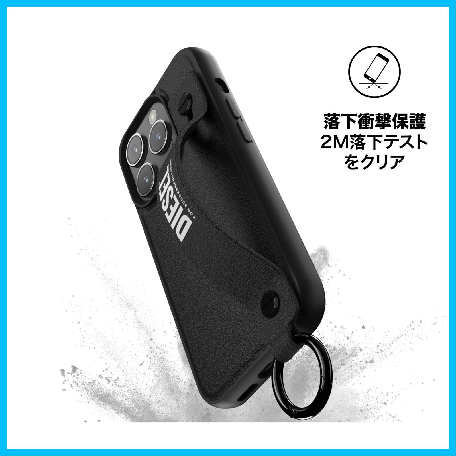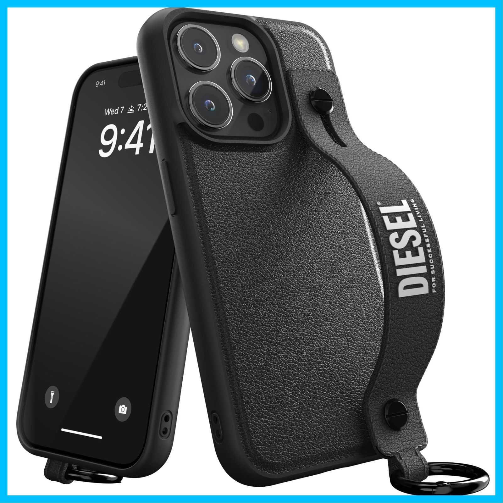 DIESEL iPhone15Proケース レザー ハンドストラップ スマホケース グリップ & スタンド付き 黒(ディーゼル ブランド ロゴ iPhone 15 Pro カバー ブラック)