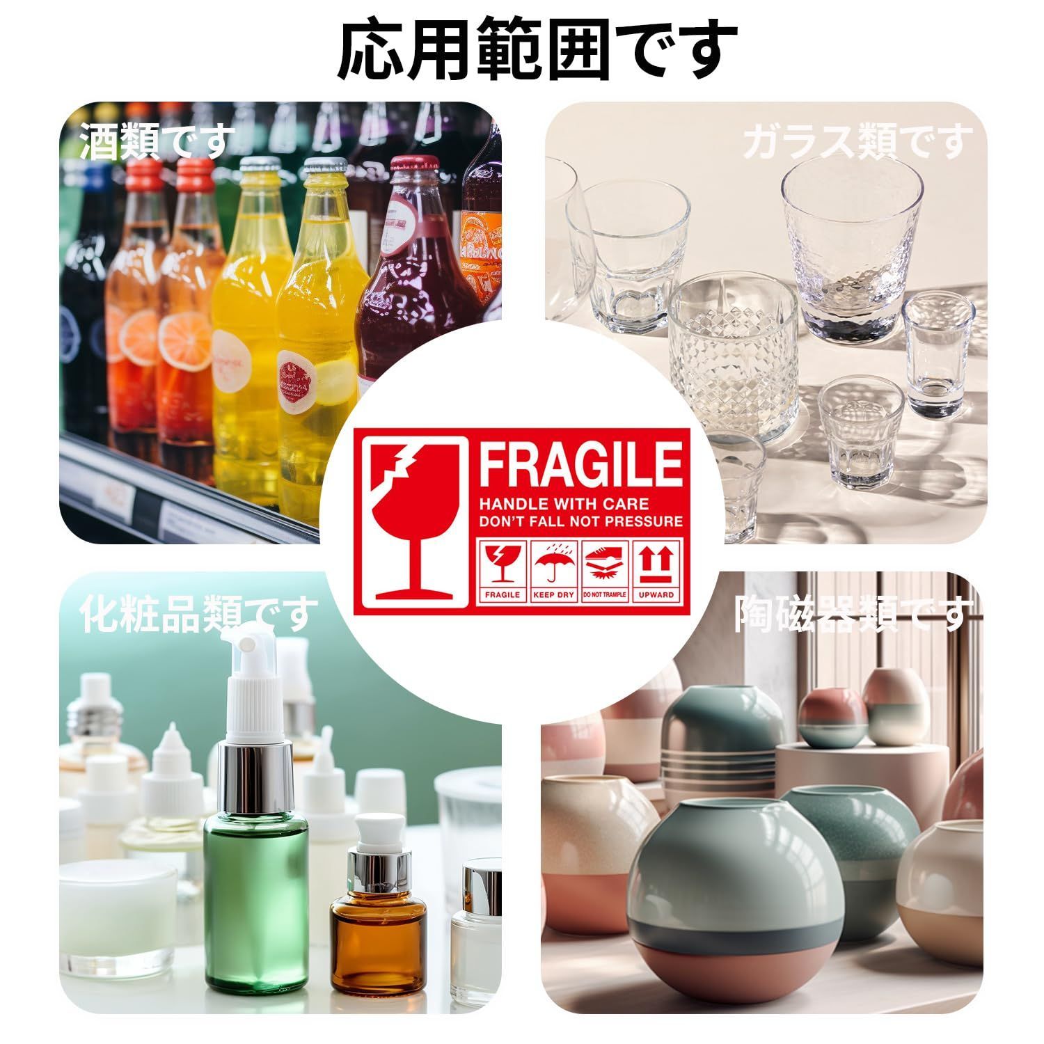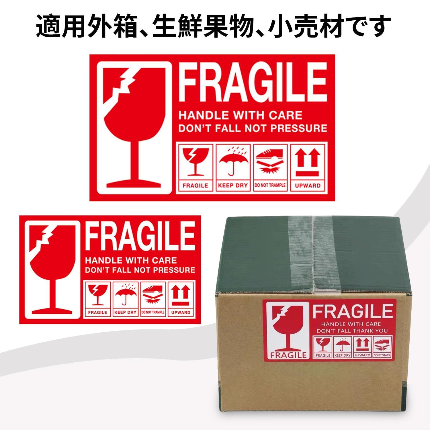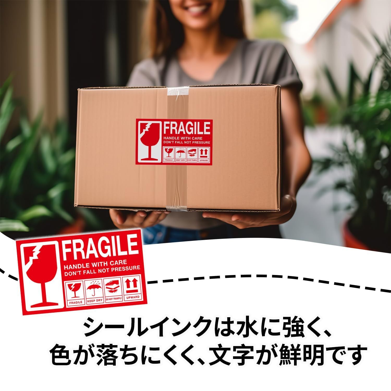 【目立ちやすいデザイン】当社の荷札シールは赤色の文字とわかりやすい絵のデザインになっておりますので、目立ちやすく海外の発送する際も伝わる英語表記になっております。また天地無用や水濡れ防止の表記もされております。