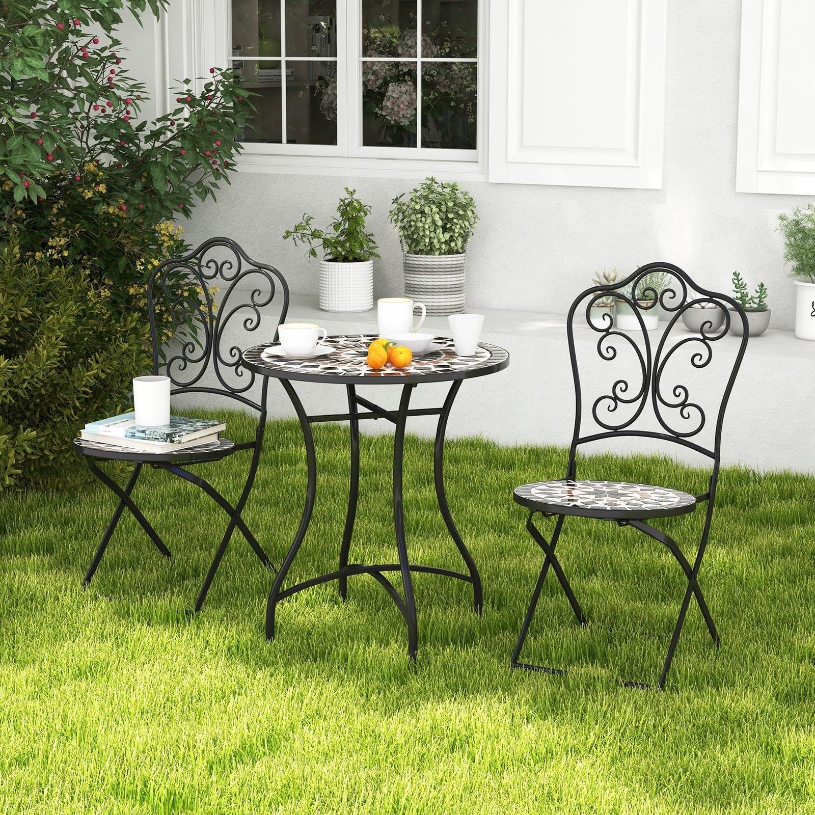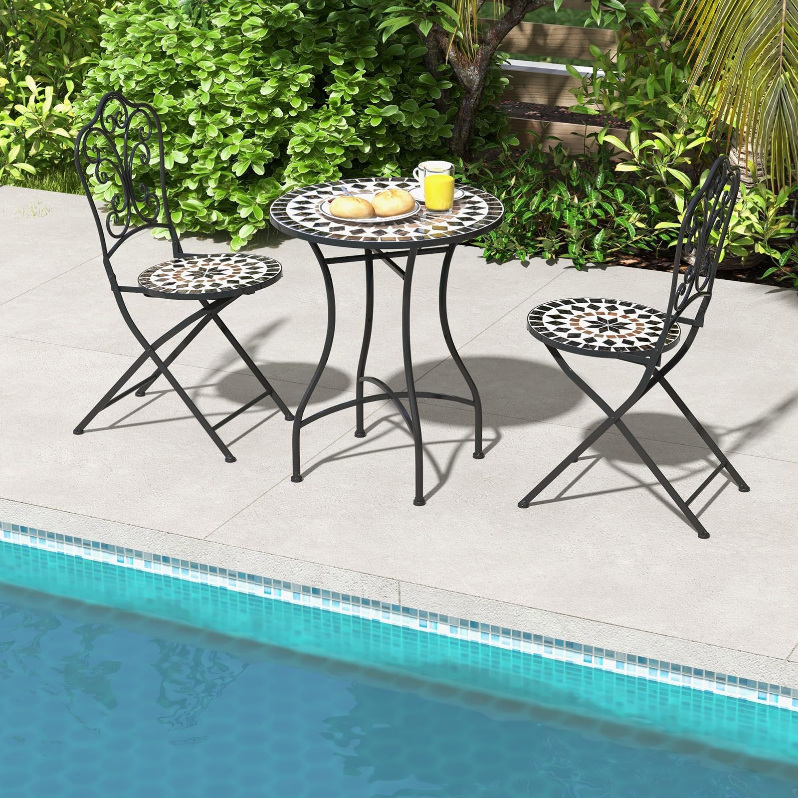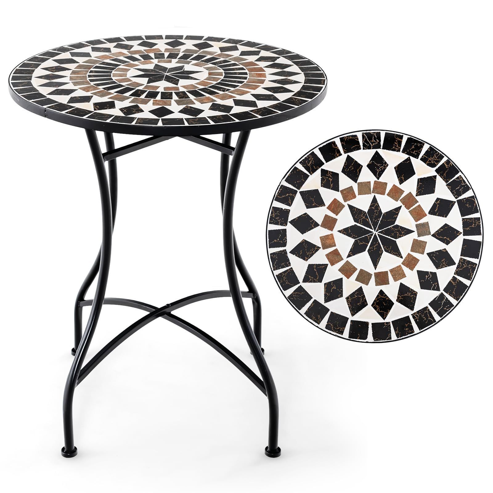 TANGKULA ガーデンテーブル 直径60cm 耐荷重50kg タイルテーブル 防水 モザイク柄 アンティーク調 机 庭 パティオ テラス アウトドア ベランダ 屋外 屋内 アイアン製 おしゃれ 組立簡単 ブラック