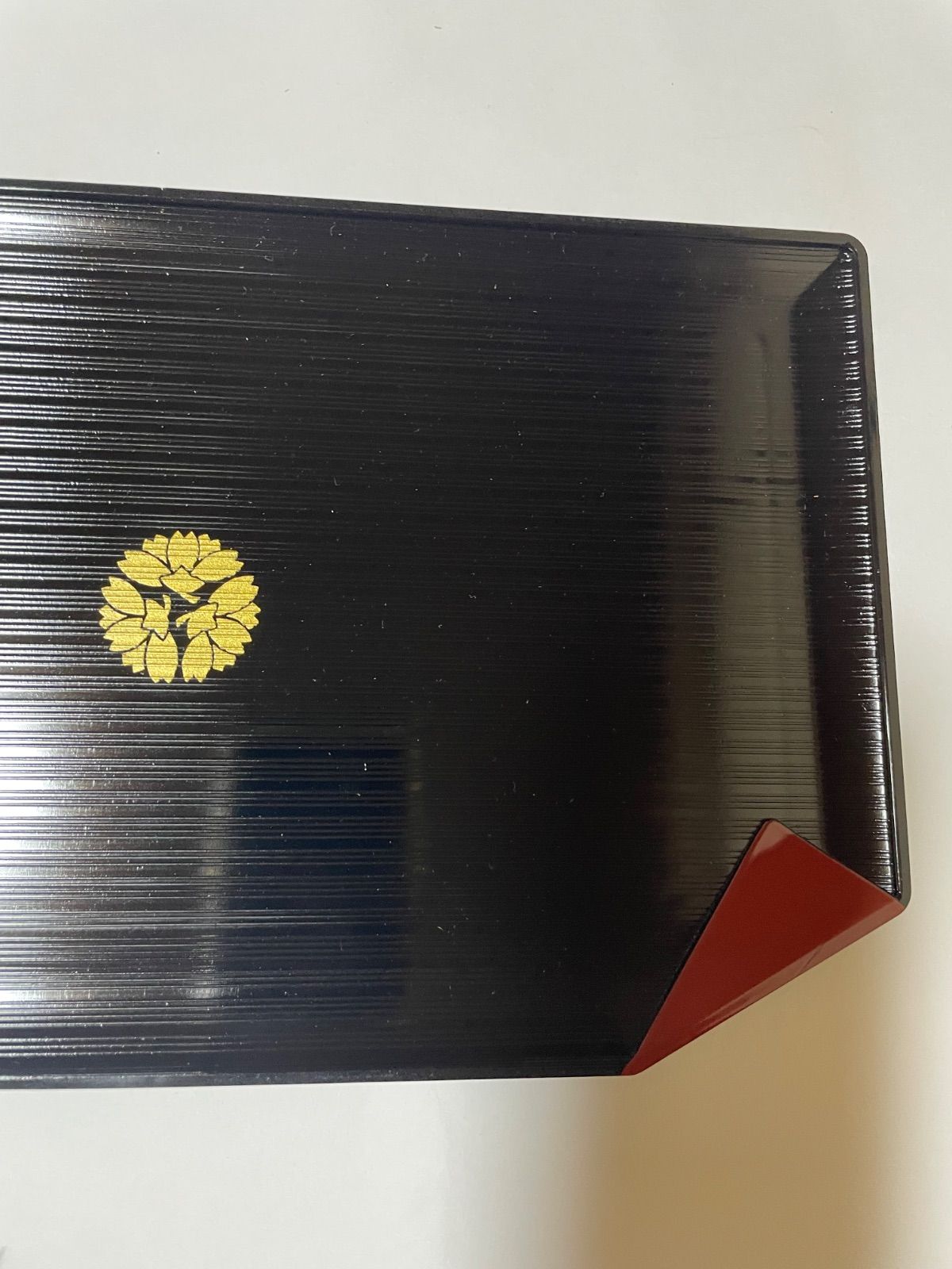 山中塗り 紋入妻折れ盆 黒塗り金 三ツ桜紋入