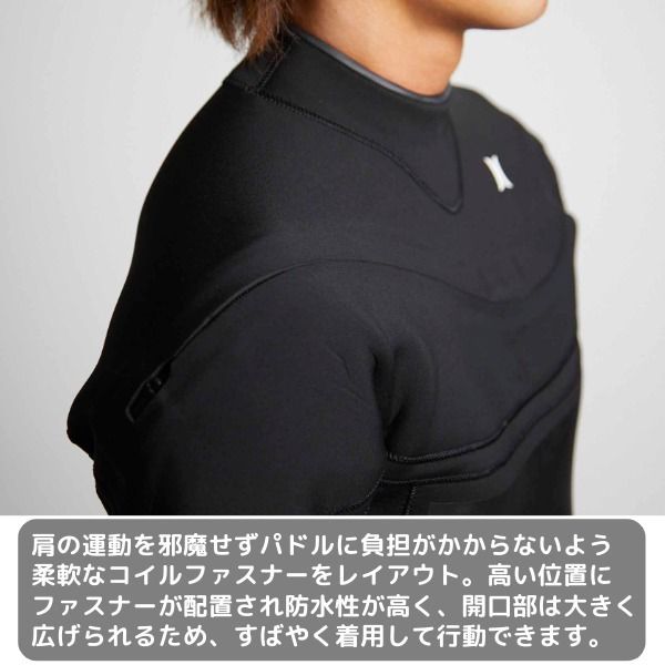 肩の運動を邪魔せずパドルに負担がかからないよう柔軟なコイルファスナーをレイアウト。高い位置にファスナーが配置され防水性が高く、開口部は大きく広げられるため、すばやく着用して行動できます。
