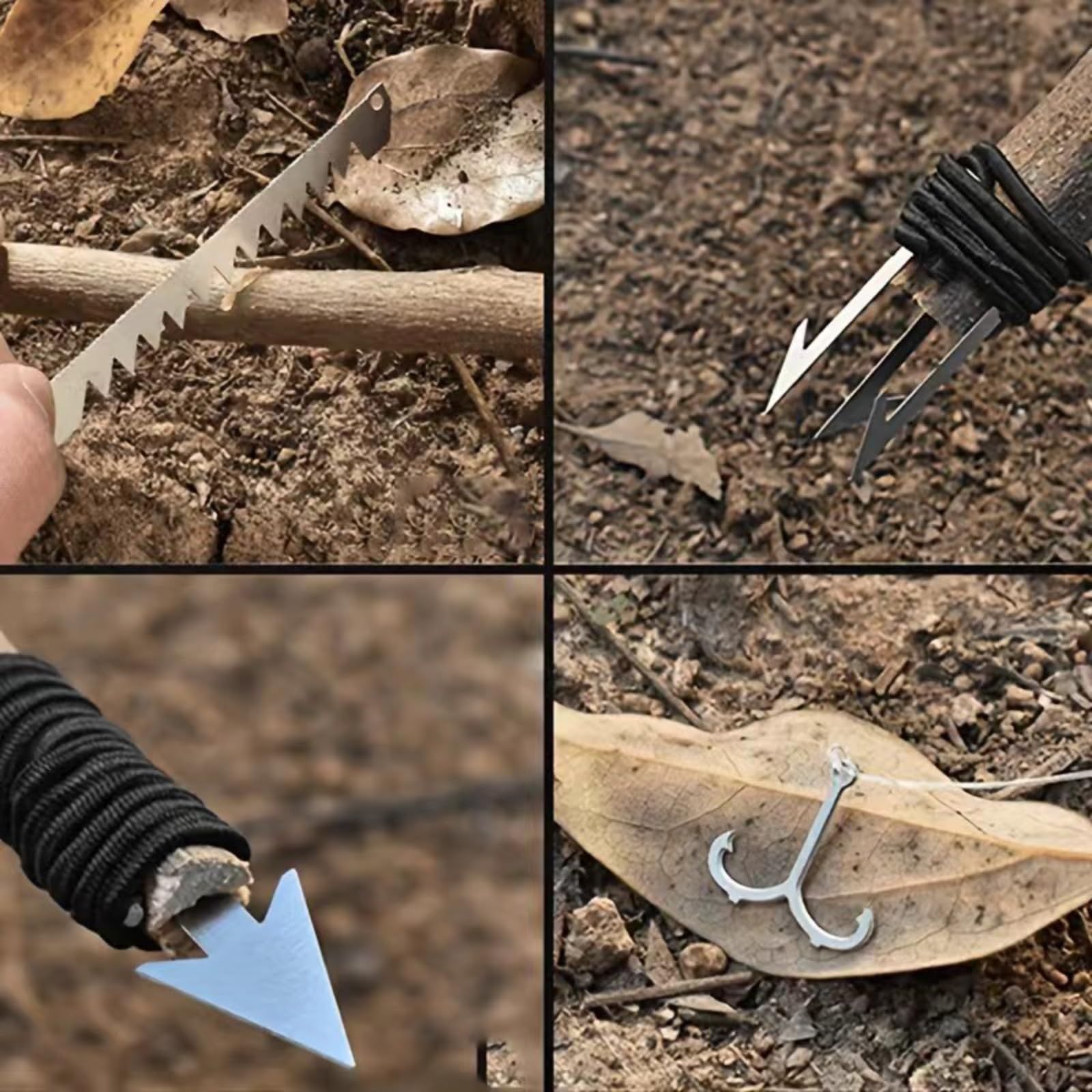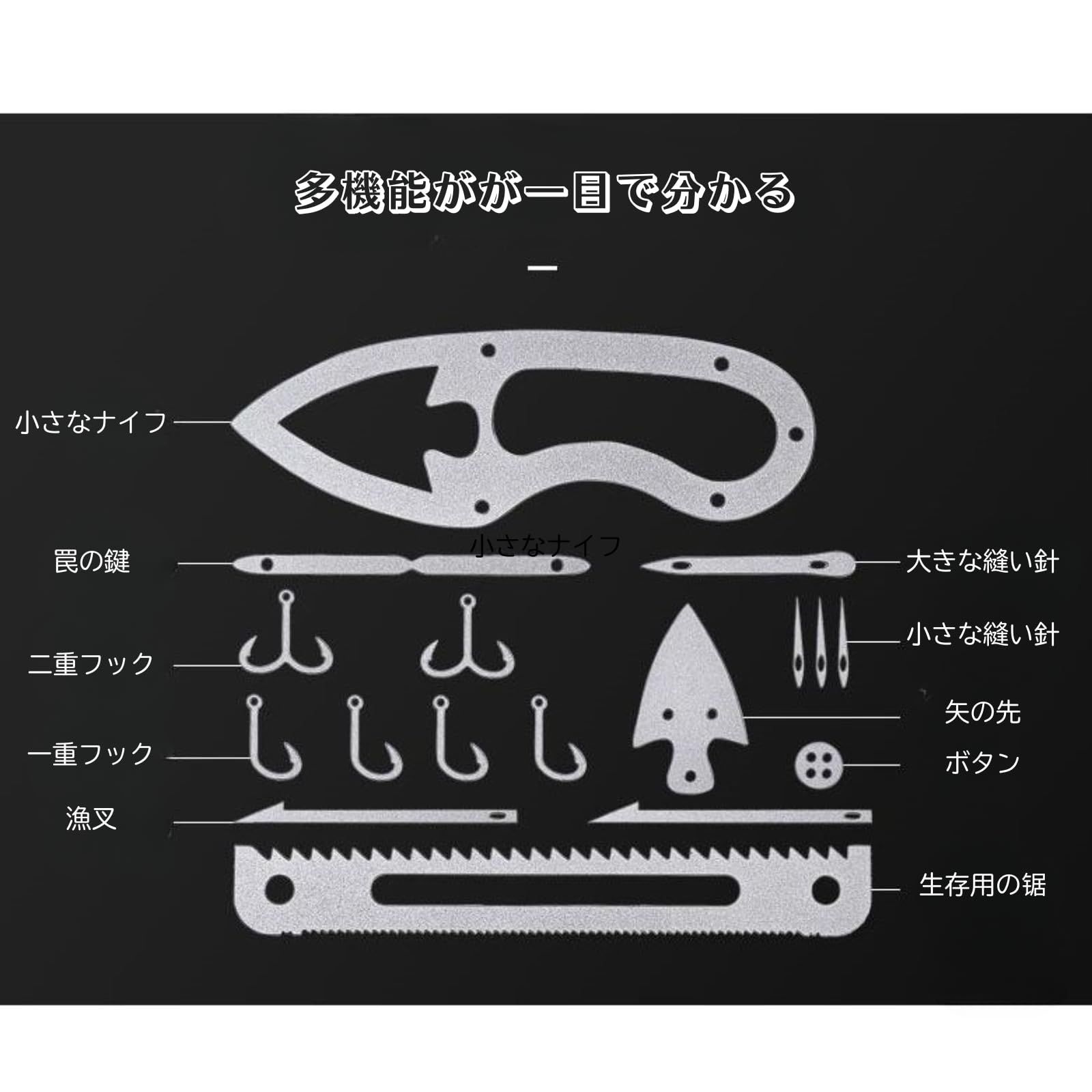 【 数の機能をカード1枚に凝縮 】 釣り針(大)、釣り針(小)、銛先(大)、銛先(小)、裁縫針(大)、裁縫針(小)、トラックバックル(大)、トラックバックル(小)、ロングトラップ、矢先、両刃ノコギリ、カーブ型ノコギリの合計17の機能を搭載