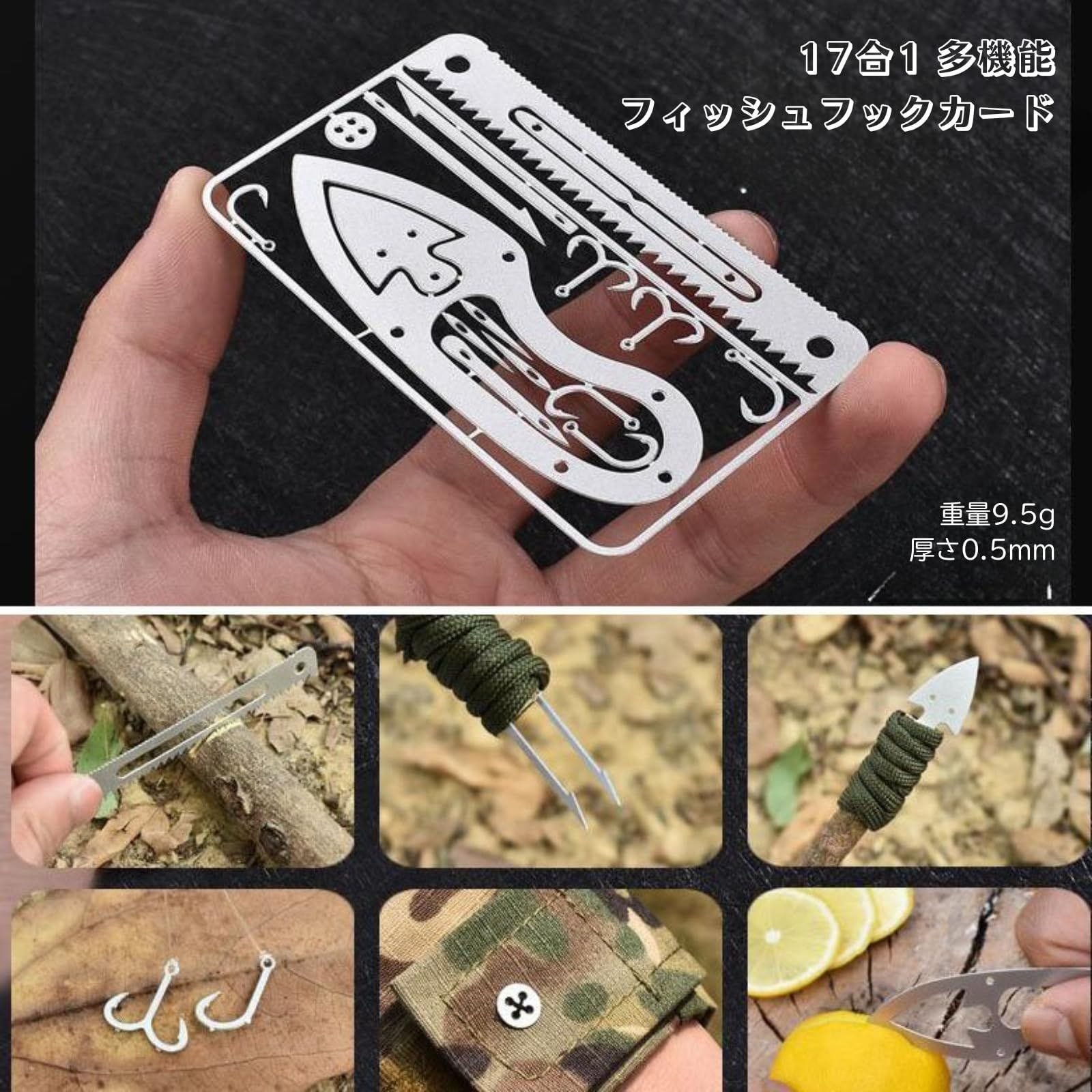 【 数の機能をカード1枚に凝縮 】 釣り針(大)、釣り針(小)、銛先(大)、銛先(小)、裁縫針(大)、裁縫針(小)、トラックバックル(大)、トラックバックル(小)、ロングトラップ、矢先、両刃ノコギリ、カーブ型ノコギリの合計17の機能を搭載 【様々な場所大活躍】:山登り ハイキング 、 魚 釣り フィッシング 、 サバゲー サバイバル ゲーム 、 キャンプ レジャー などなど あらゆる場面に対応します。登山 山登り ハイキング 、 魚 釣り フィッシング 、 サバゲー サバイバル ゲーム 、 キャンプ レジャー などなど あらゆる場面に対応します。 【錆びにくい】 ステンレス 製 なので さびにくく 、 耐久性 に優れています。ステンレス 製 なので さびにくく 、 耐久性、耐腐食性に優れています。 【軽量 & コンパクト】 約15g と 軽量 なので、 装着 していても 負担 に なりません 。また、 カード型デザイン で 持ち運び 携帯 が 簡単 にできる サバイバルツール です。超軽量 なので、 携帯していても 負担 に なりません 。また、 カード型デザイン で 持ち運び 携帯 が 簡単 にできる サバイバルツール です。 【サイズ】約10.1cm×5.3cm×0.7cm