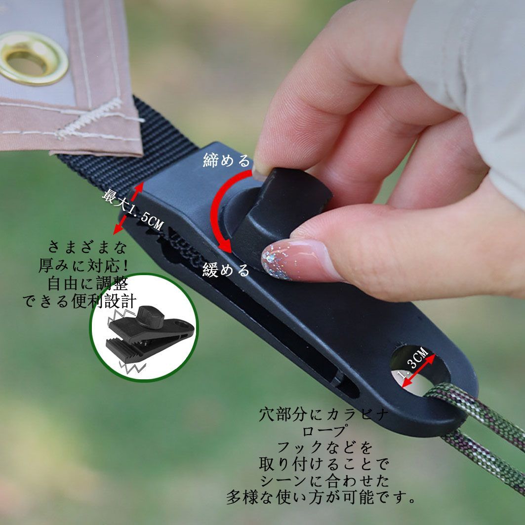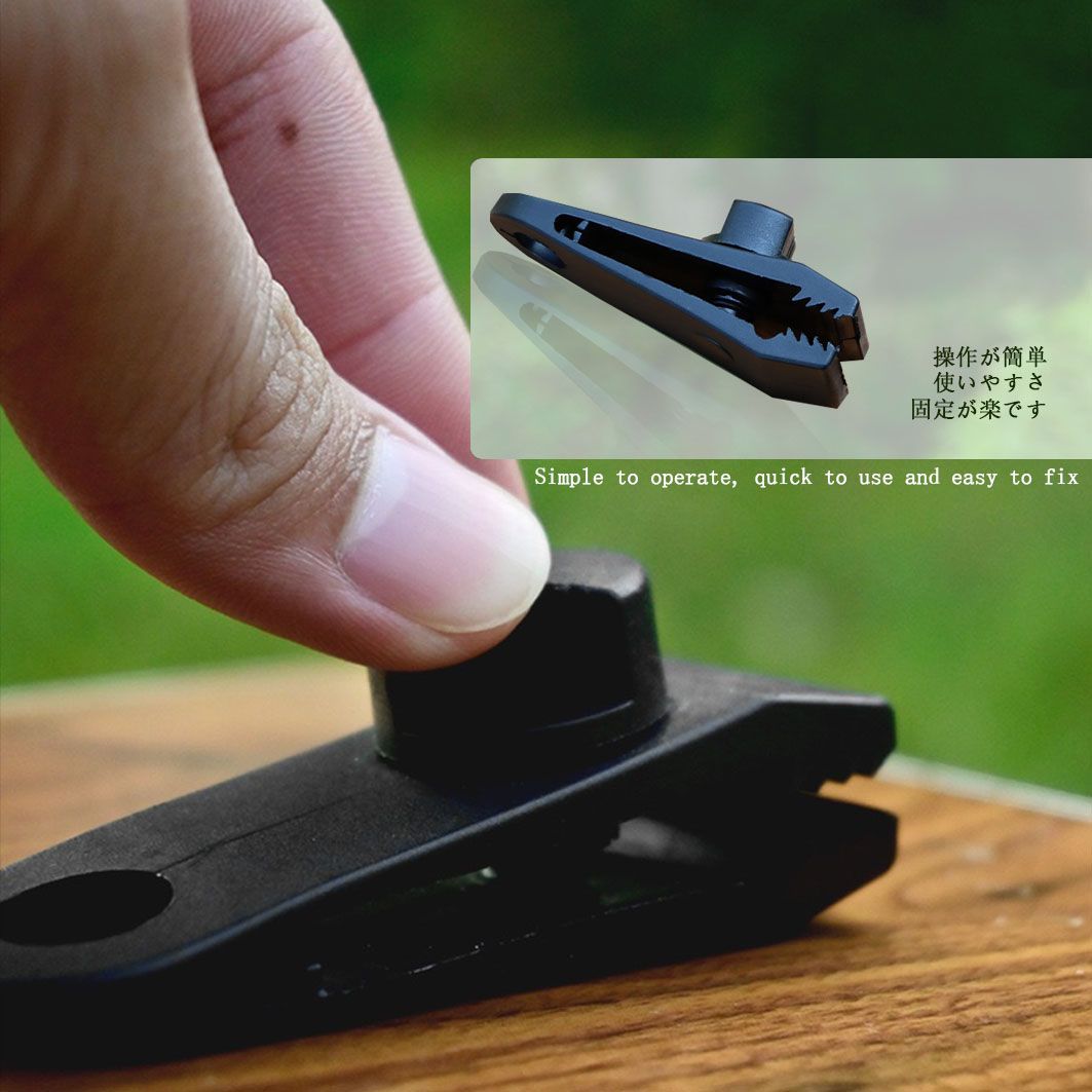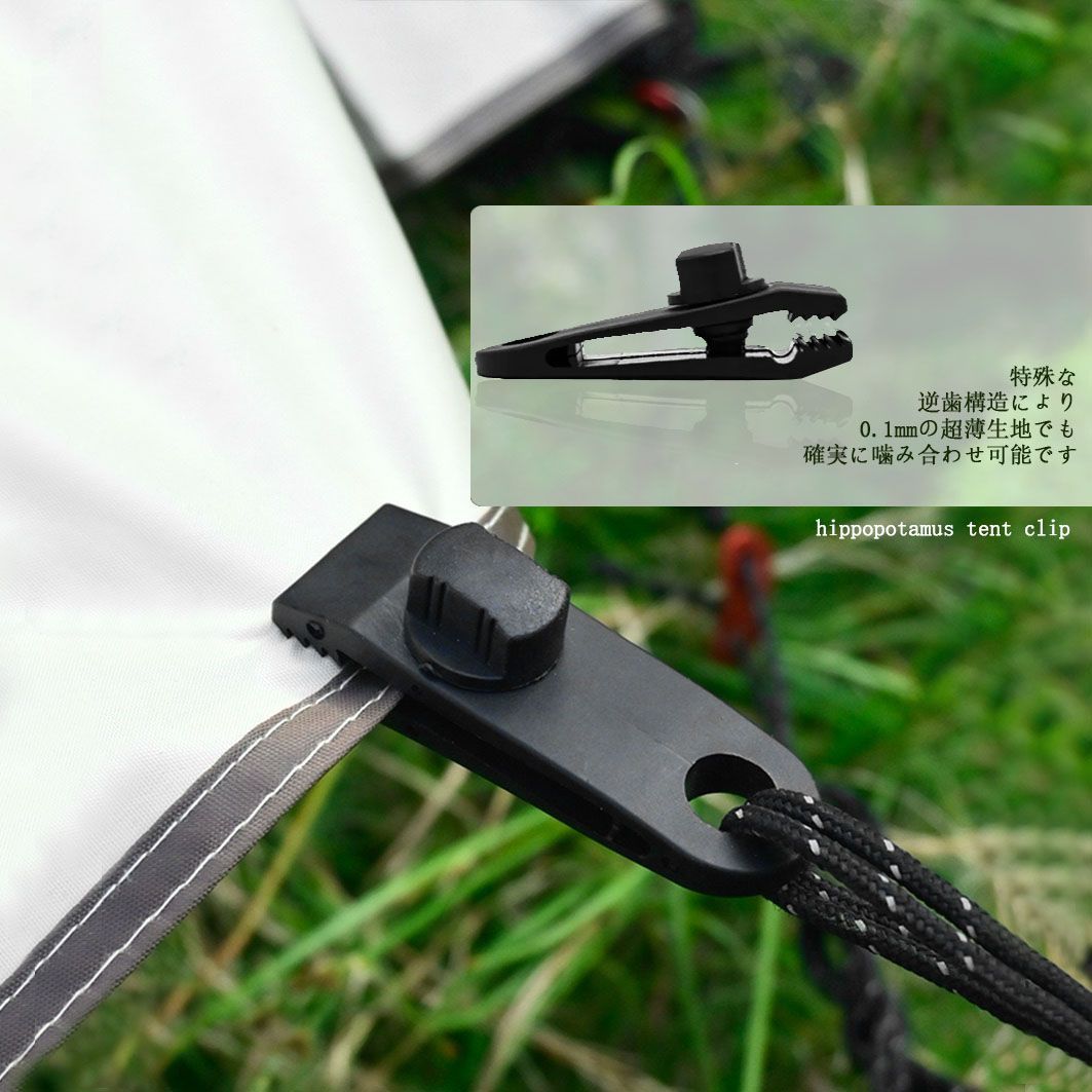 わに口クリップでテントやタープなどの薄めの物から少し厚めの物(最大1.5cm)までしっかり掴んで離さない!