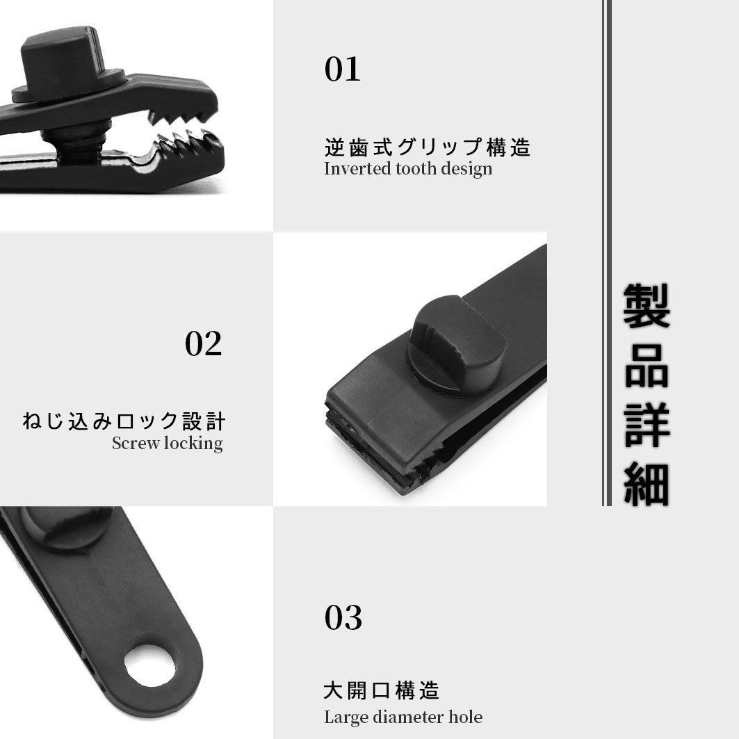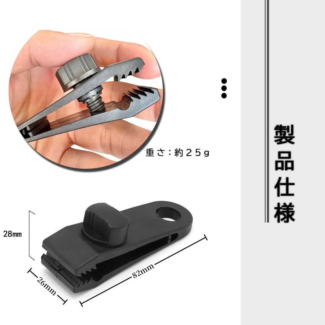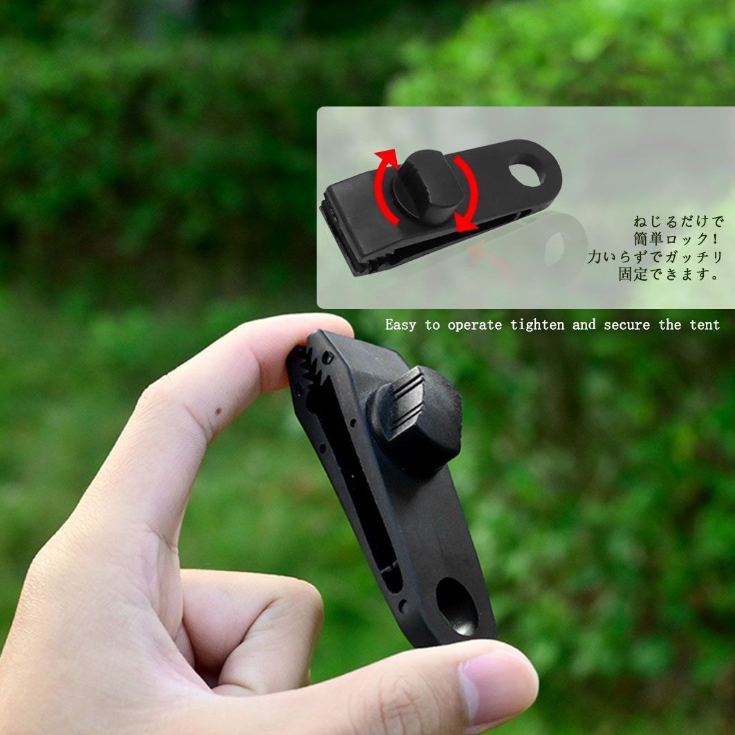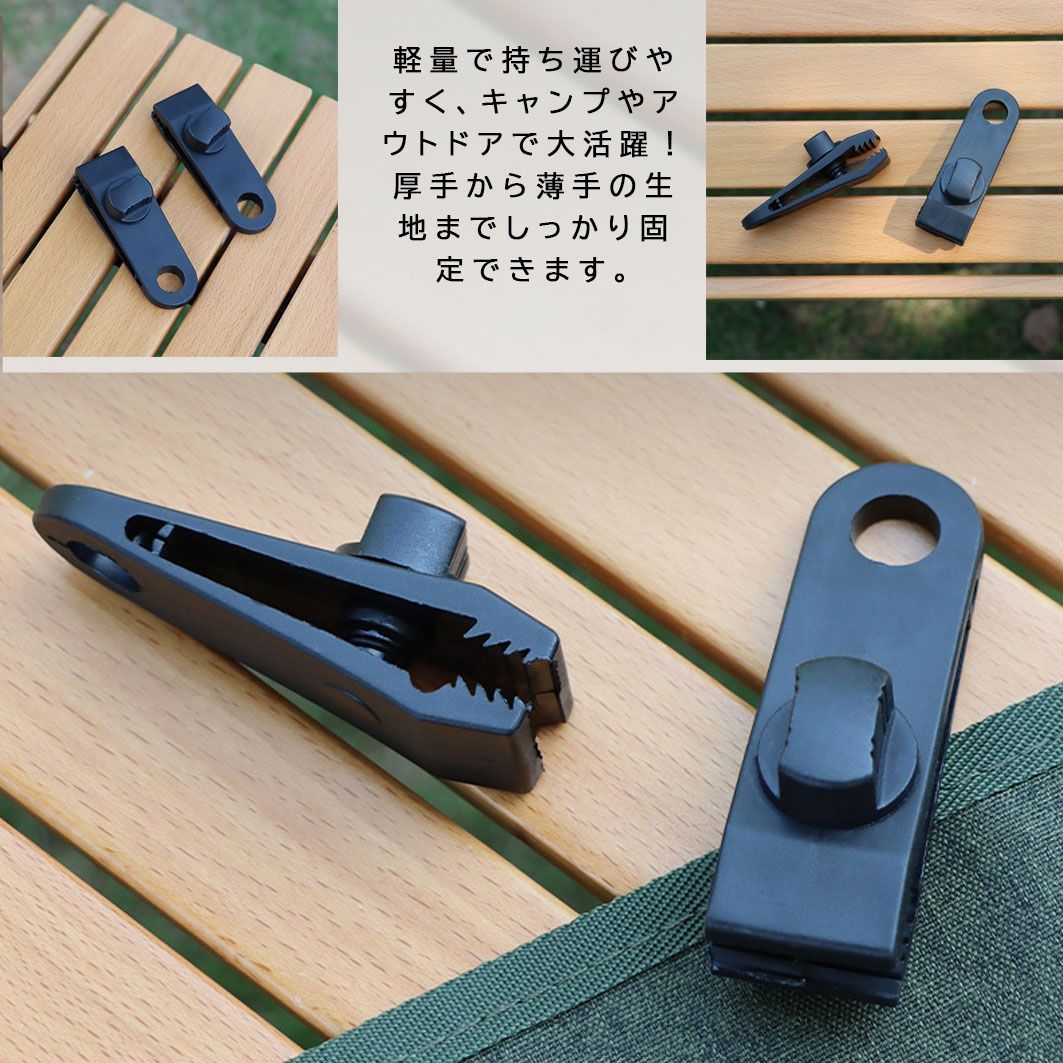 わに口クリップでテントやタープなどの薄めの物から少し厚めの物(最大1.5cm)までしっかり掴んで離さない!